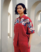 The Red Chloé Kimono shirt has a mandarin collar and is made of pure crepe with a striped pattern. It features floral embroidery and sequins on the neckline and sleeves.