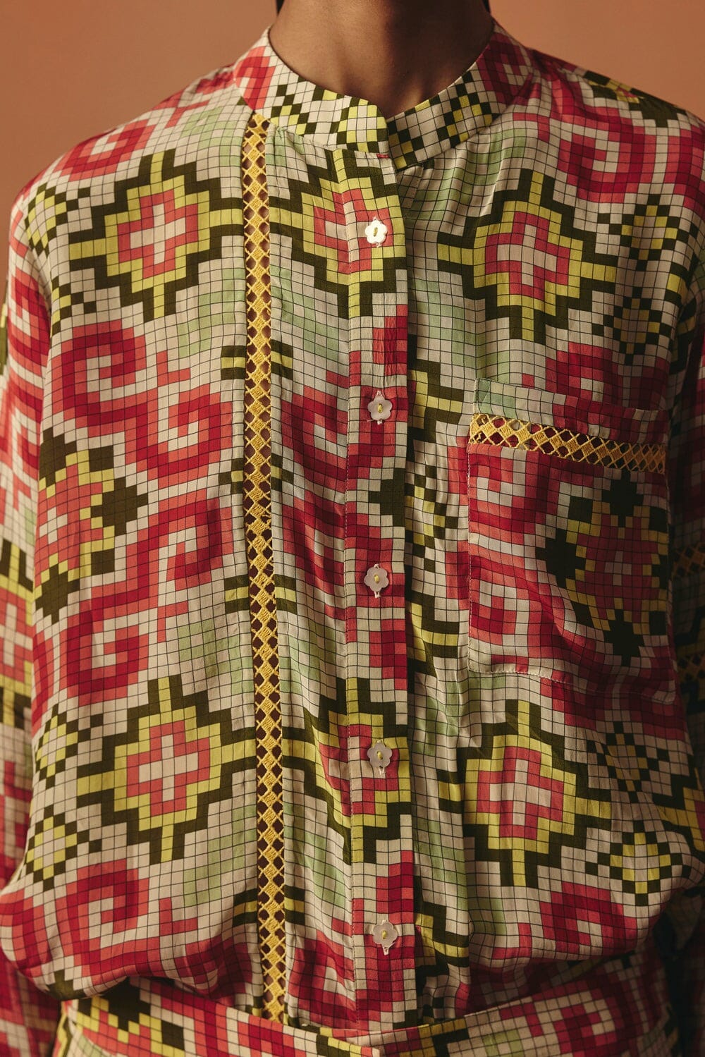 The Tara Lace Shirt is crafted from pure crepe in digitally printed traditional Ikat-inspired pattern and comes with a chinese collar. Its detailed with cutwork lace in various places.