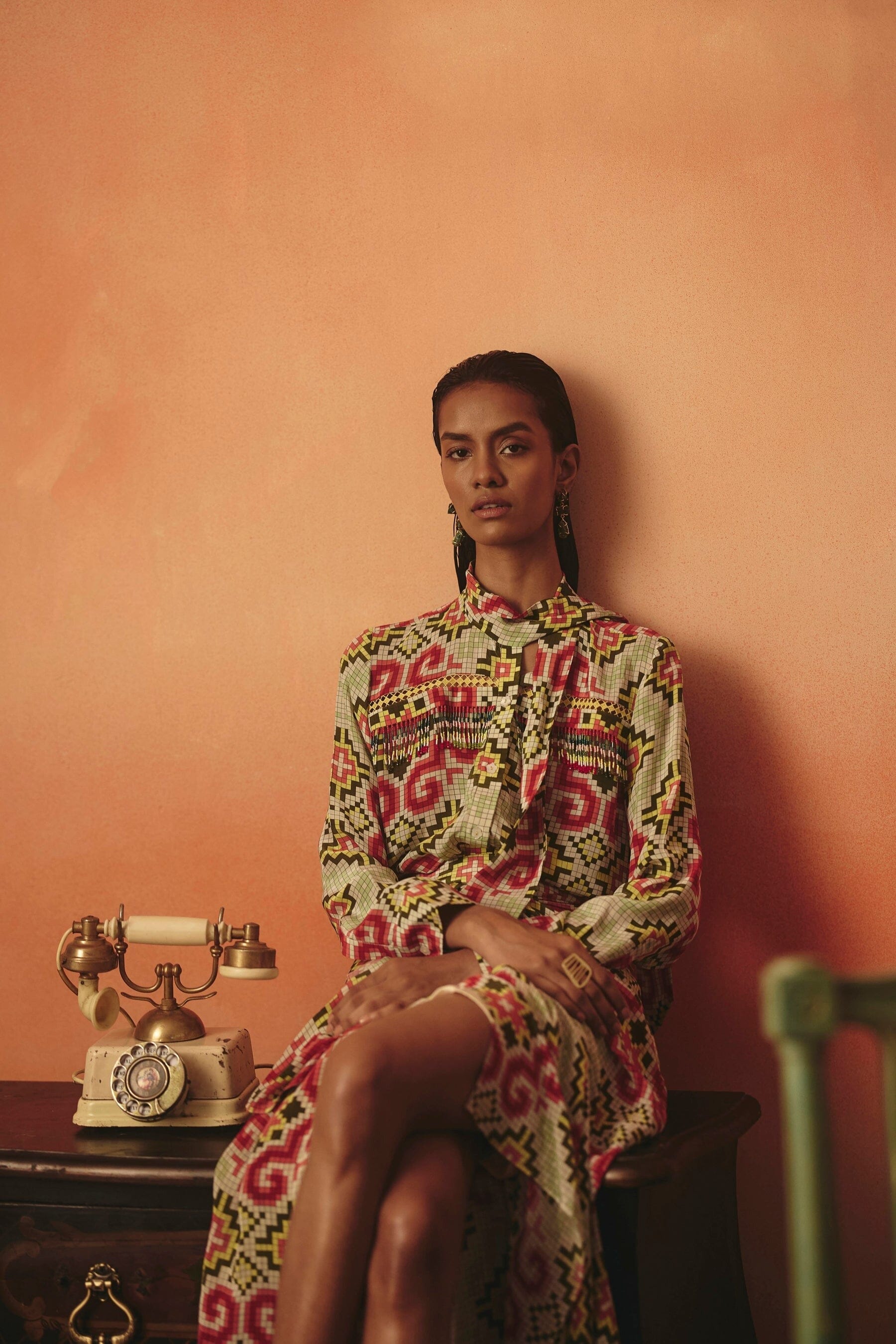 Tara Tie Shirt from our new festive edit’25 is a full-sleeve shirt made in pure crepe and comes in digitally printed traditional Ikat-inspired pattern. It has a collar tie up detail and hand done crystal tasseling on the upper bust .