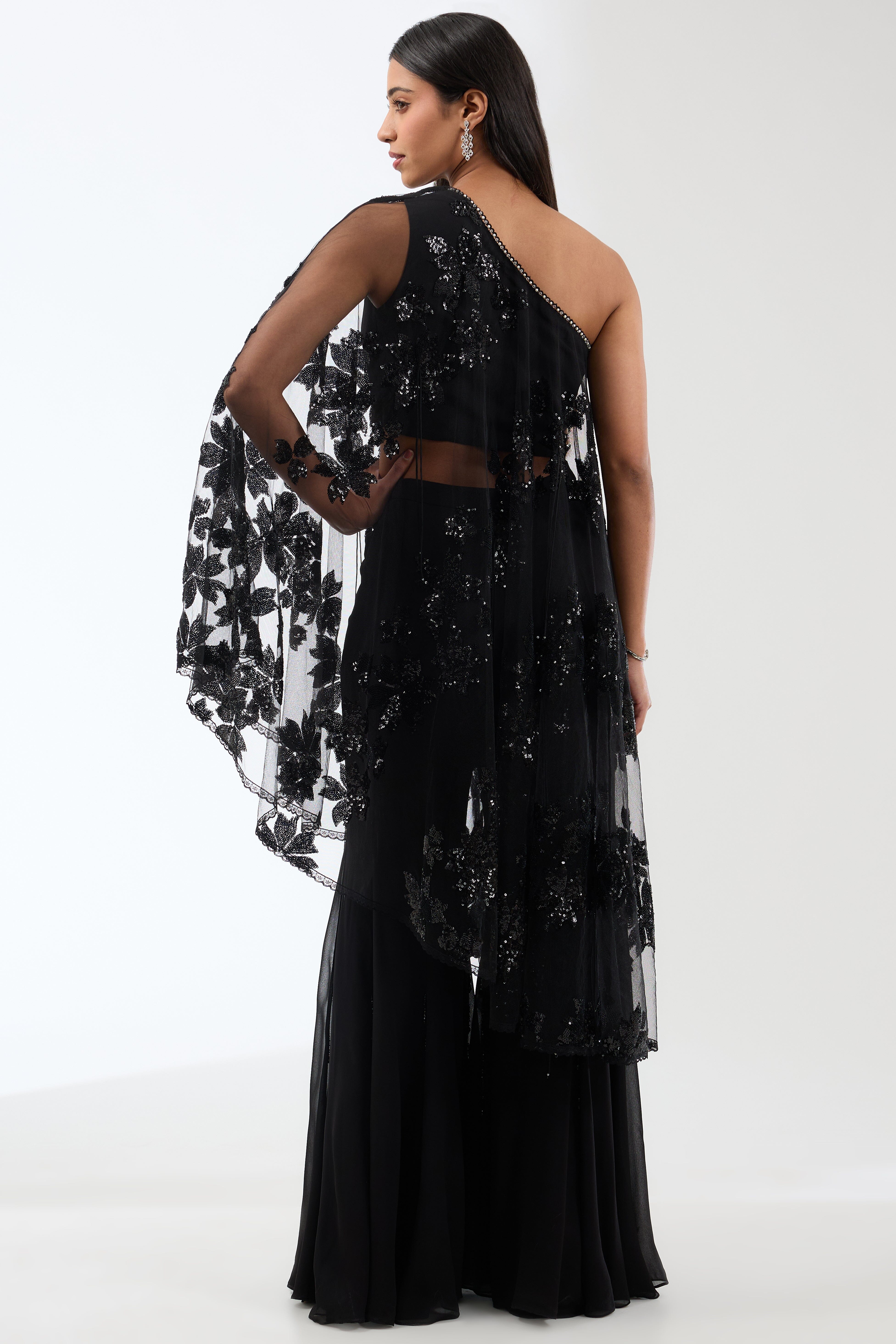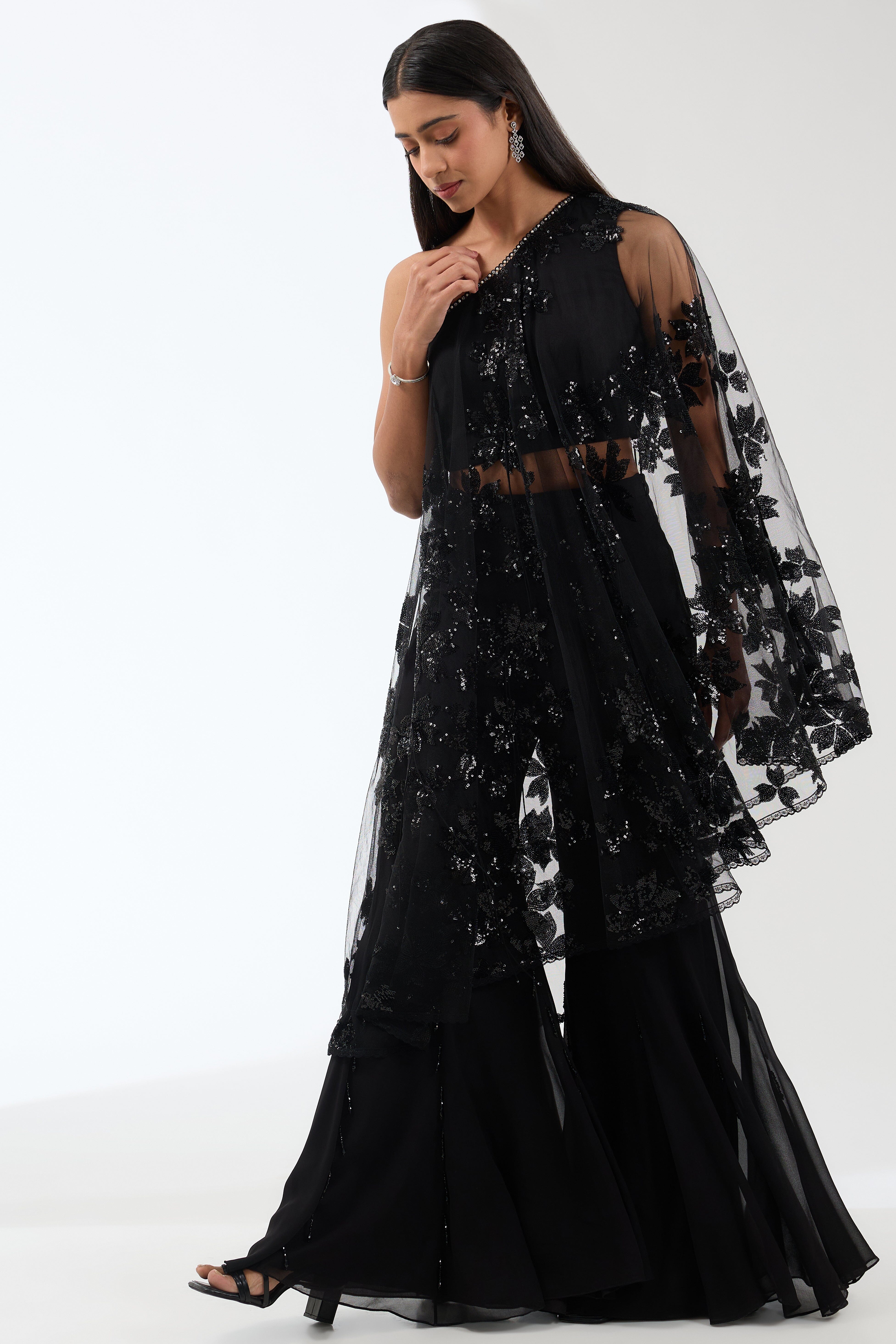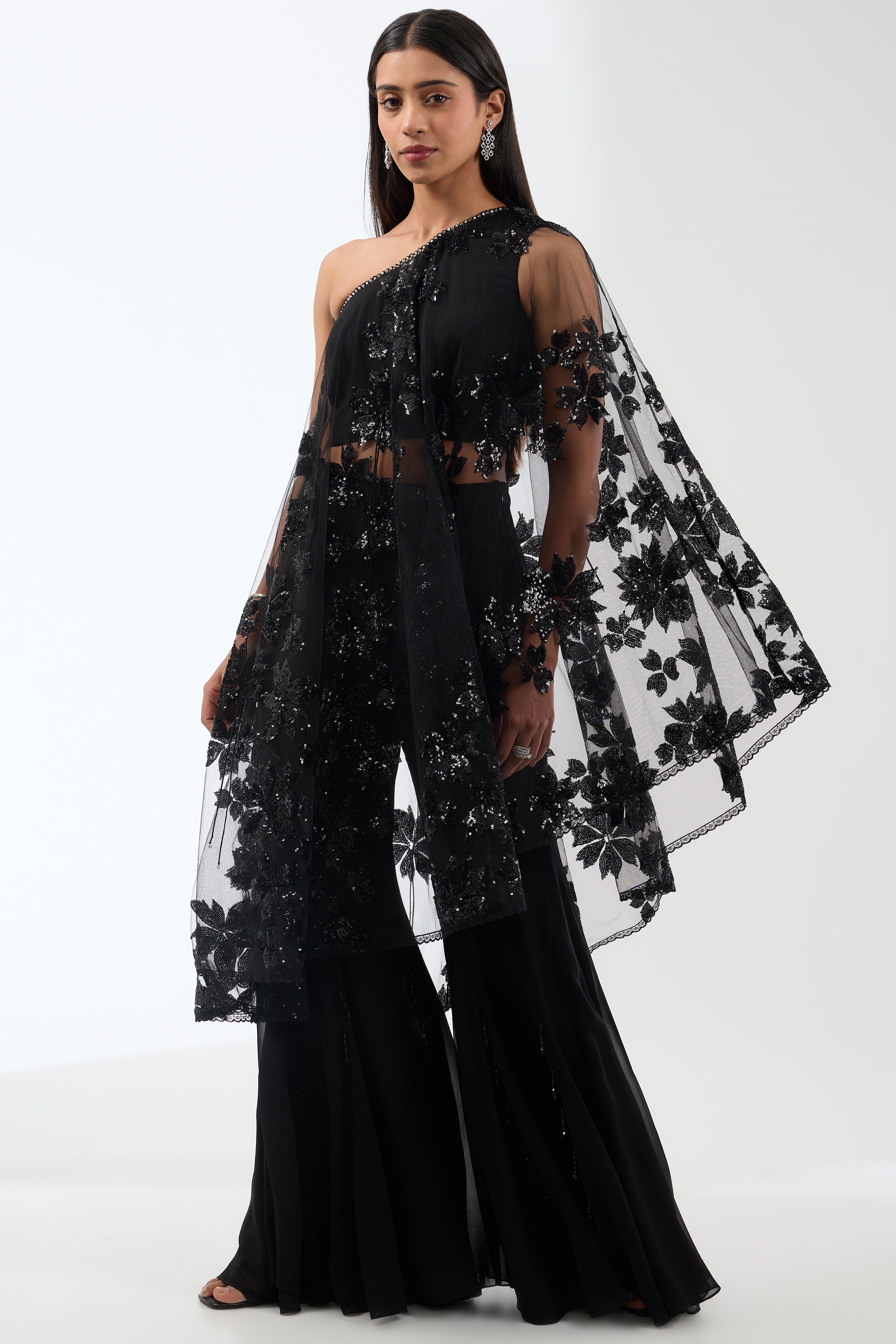 Shimmering sequins and tassels intricately embroidered on this tulle off shoulder tunic paired with flowy pants.