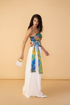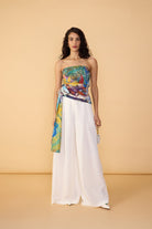 Blouse : Abstract scribble print strapless, assymetric pleated blouse with side bow detailing