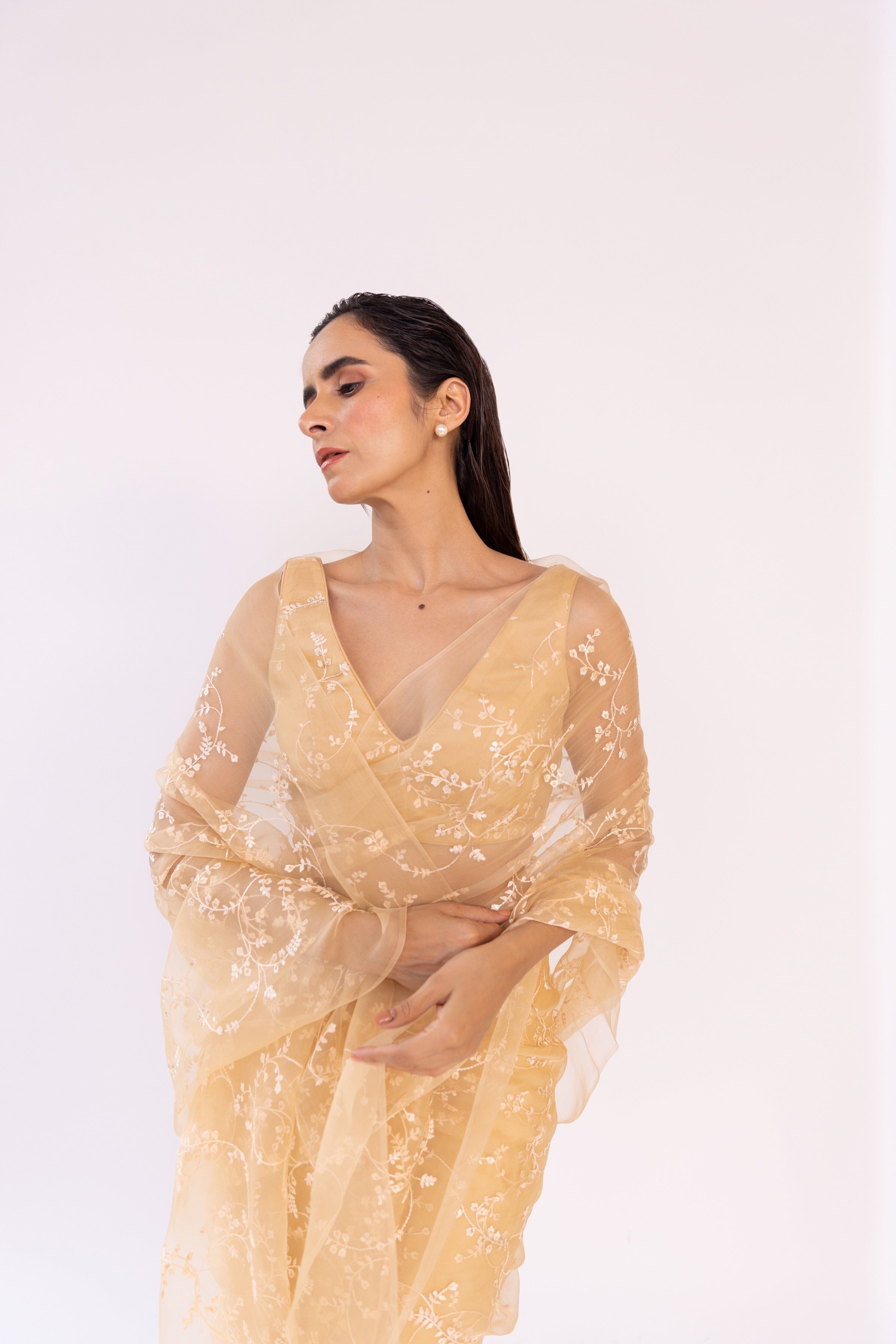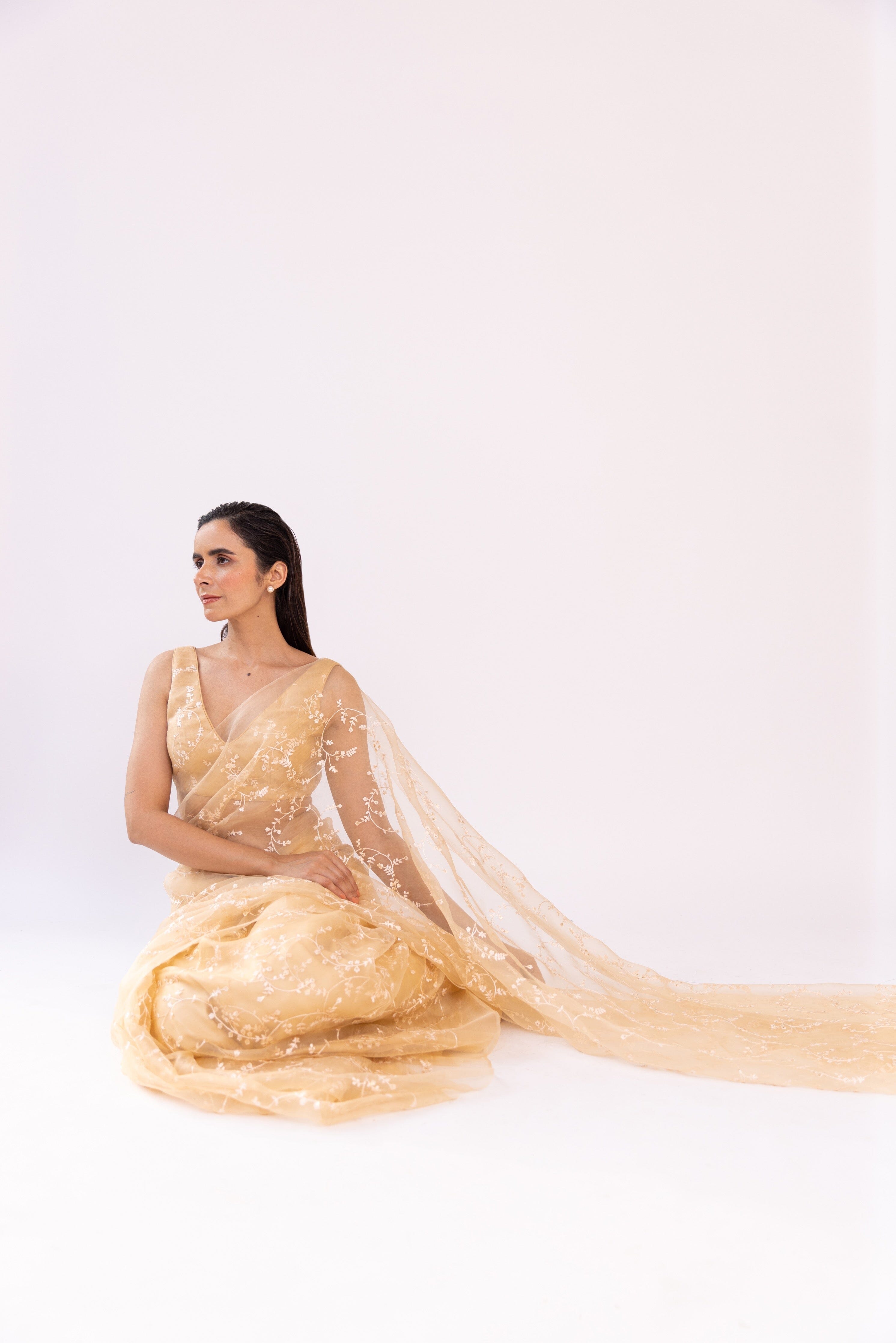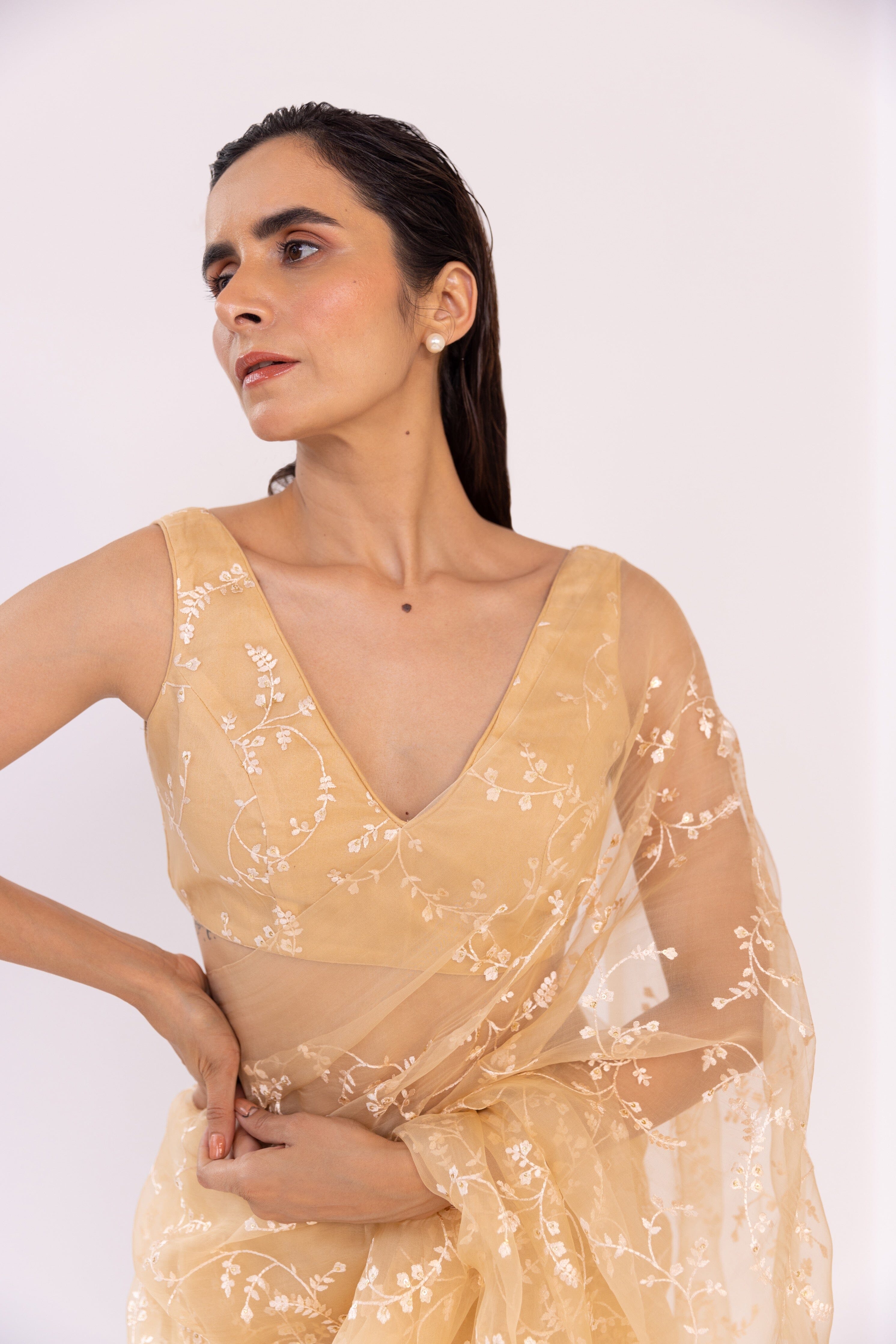 Featuring a walnut pre-stitched saree in embroidered silk organza base. It is paired with a v neckline blouse.