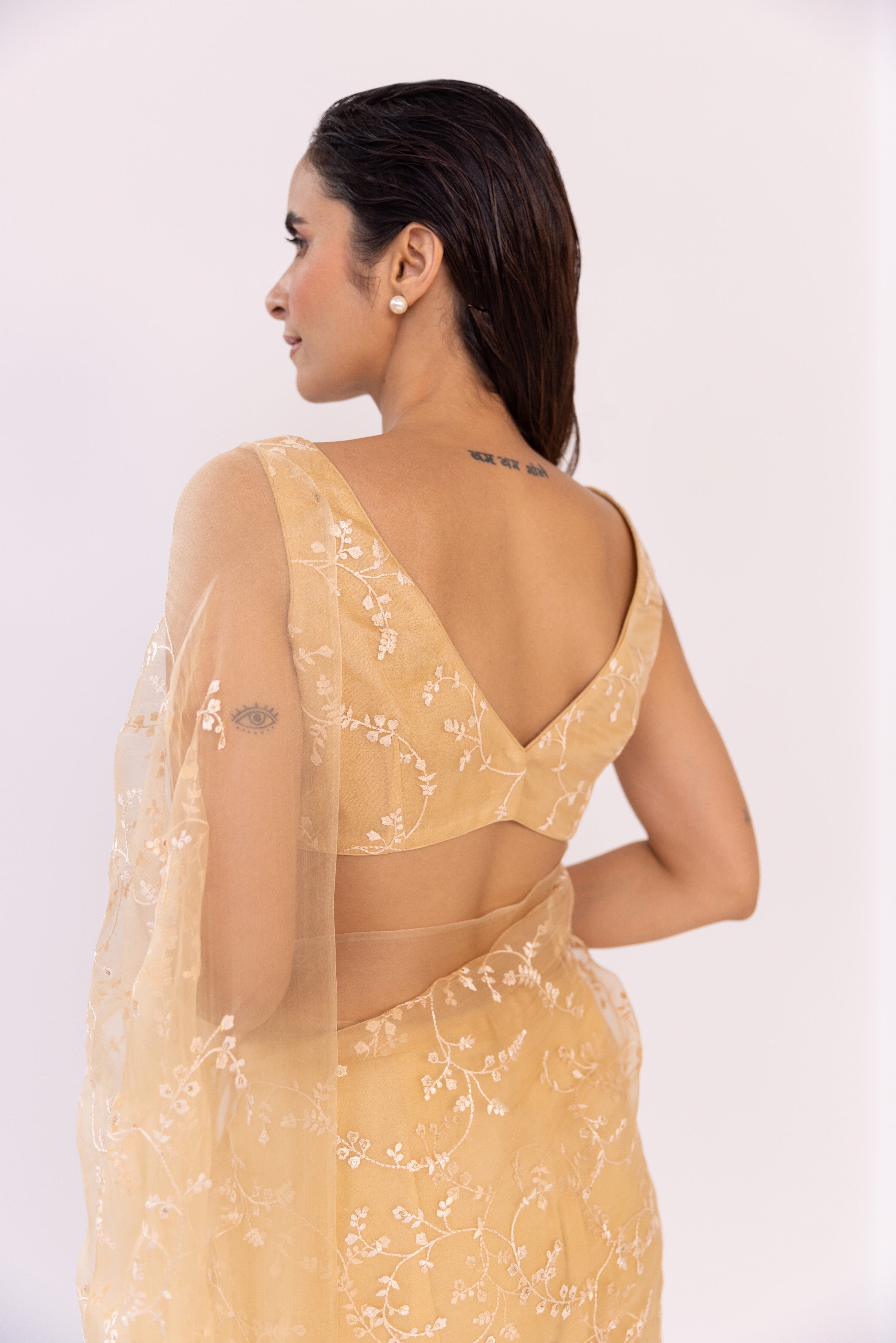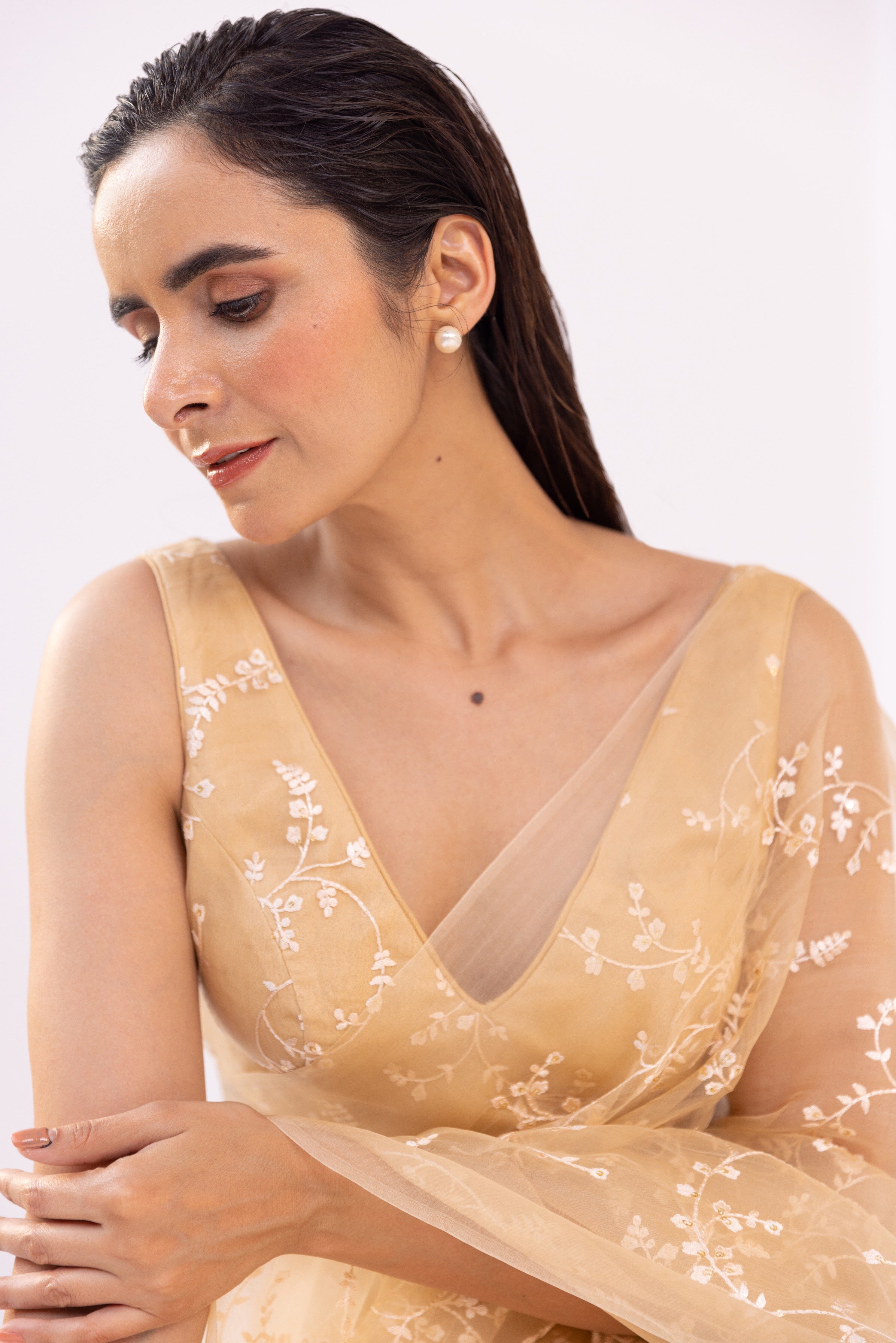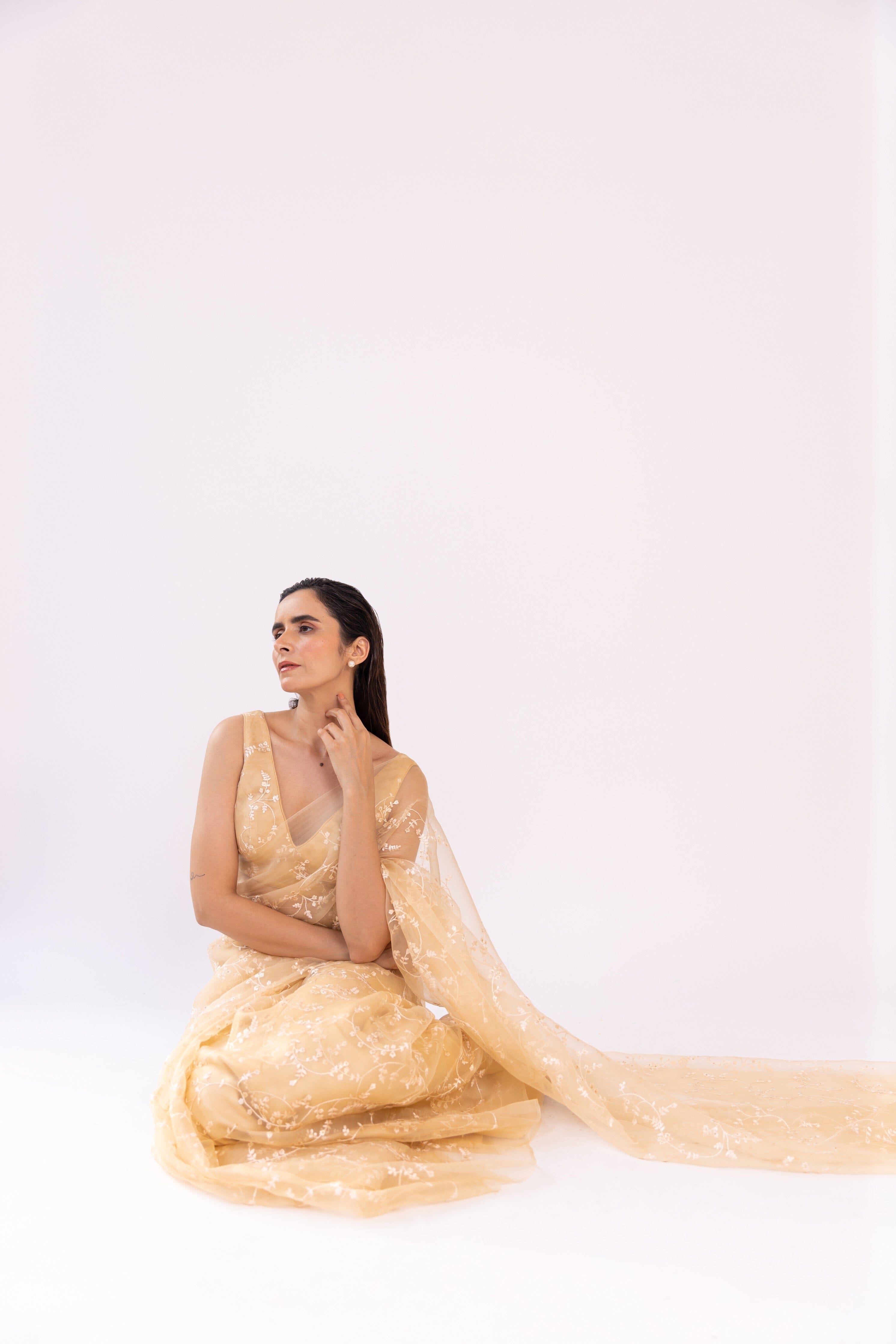 Featuring a walnut pre-stitched saree in embroidered silk organza base. It is paired with a v neckline blouse.