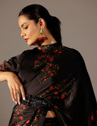 This draped saree gown gives you the best of both worlds—effortless ease and striking glamour. Hand-embellished with sequins and beads, the collared palla flows with elegance, while the embroidered belt cinches the waist for a regal finish. Paired with a blouse, it’s a head-turning ensemble that radiates sophistication.