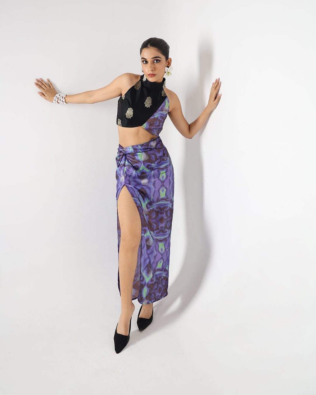 Unleash your celestial charm with our Galaxy Print and Black Half and Half Halter Top. Crafted from luxurious banarsi silk fabric, this captivating ensemble merges the allure of a galaxy print with the elegance of a black halter top, creating a mesmerizing look.