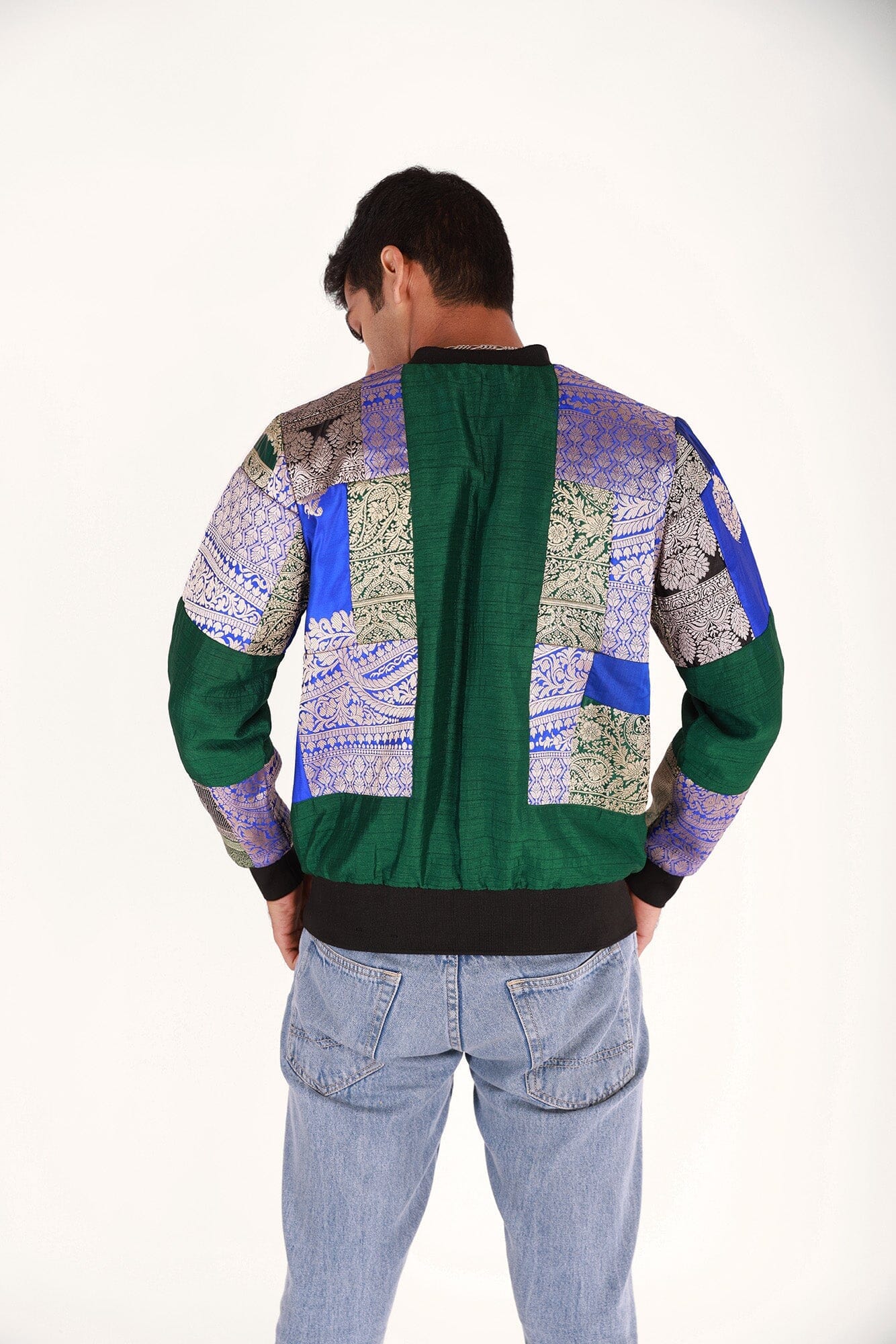 Our Harisaa Silk Unisex Bomber Jacket is made with silk base which also has mashru silk fabrics patches on it in a theme of blue, green and black.