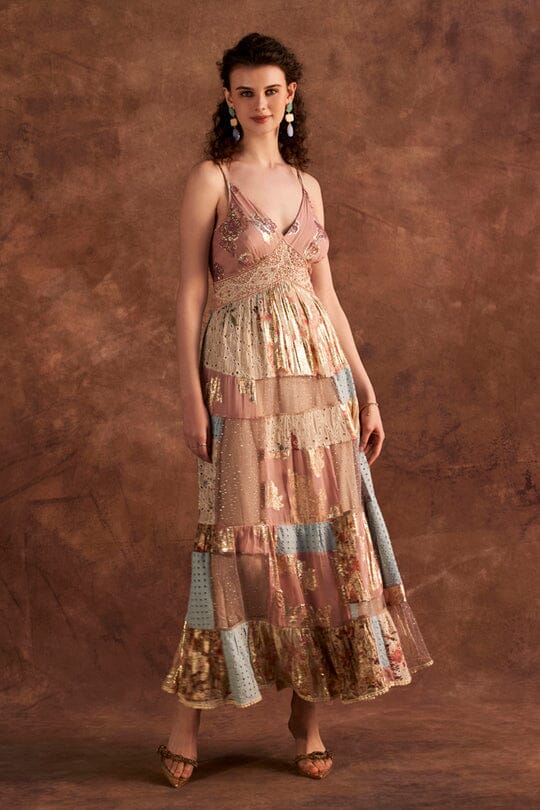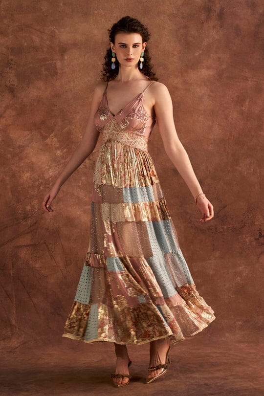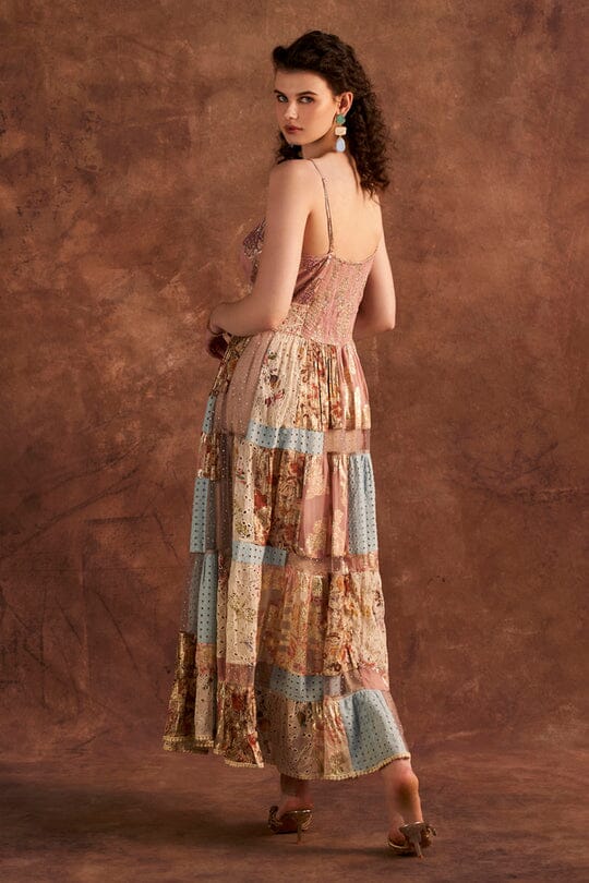 Patch work spaghetti dress with thread beads lace detailing on yoke.