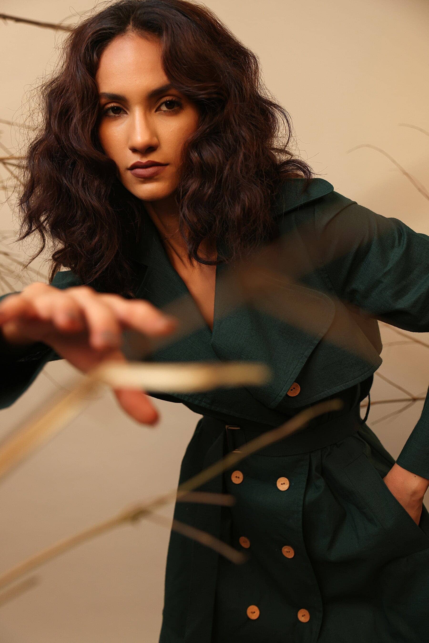 Trench overlap dress with big button closer and matching canvas belt for securing the waistline.