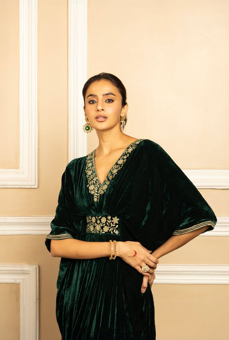 Transform your festive wardrobe with the Gulzar Green Velvet Kaftan, crafted for unmatched elegance. This exquisite piece features intricate embroidery, showcasing zari, dabka, sequins, and cutdana that add a luxurious texture and shimmer. The long velvet kaftan boasts a stunning neckline, making it perfect for festive gatherings.