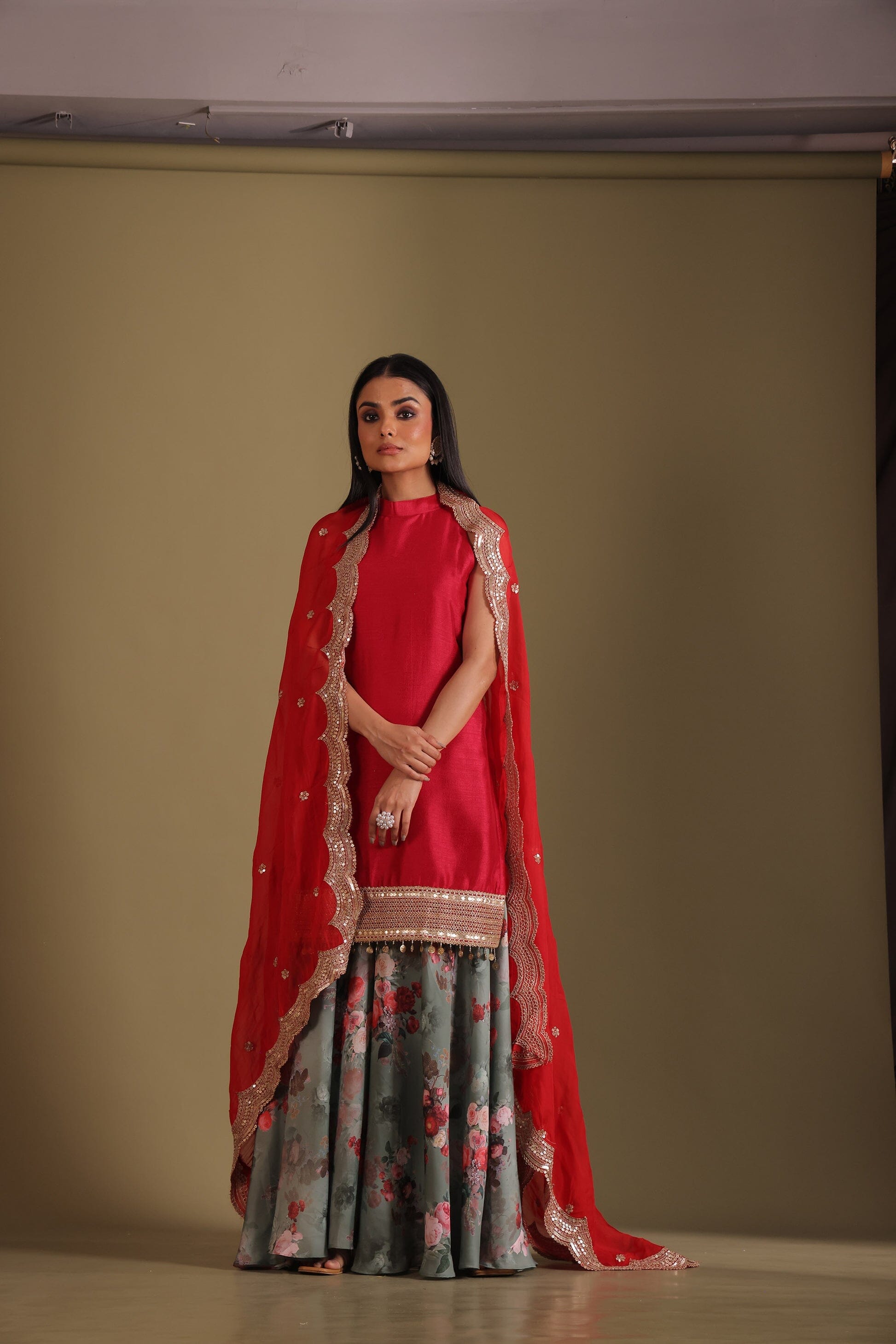 This three piece set includes kurta, Sharara and dupatta This striking ensemble features a minimalistic red kurta paired with flared floral printed palazzos, merging tradition with contemporary elegance. The halter neck straight kurta is accented with an intricately embroidered hemline enhanced by mirror work and delicate tassels, creating a statement look. The sage green palazzos bloom with rich floral patterns, adding a romantic touch to the silhouette. The look is completed with a bold red organza dupatta adorned with scalloped gota patti embroidery and sequin detailing, lending festive charm. Ideal for wedding functions, festive celebrations, or intimate gatherings.