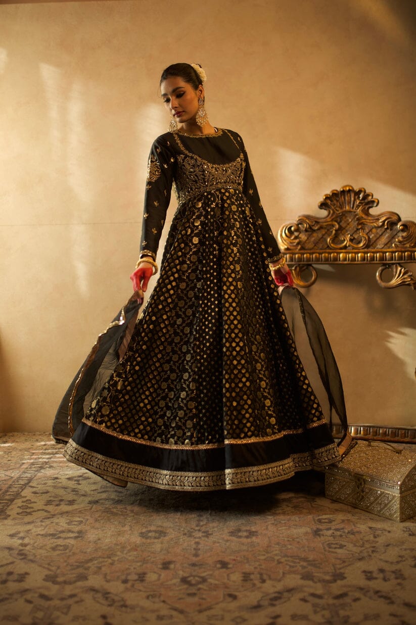 Elegant in every thread — this black banarsi silk Anarkali features delicate embroidery on the front, back, and sleeves, creating a silhouette that’s both timeless and regal. A classic redefined for modern celebrations.