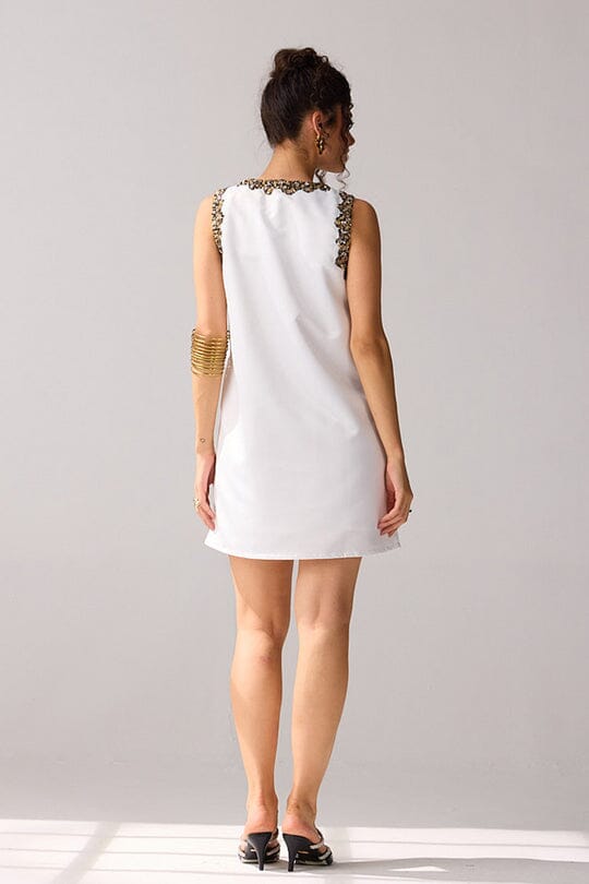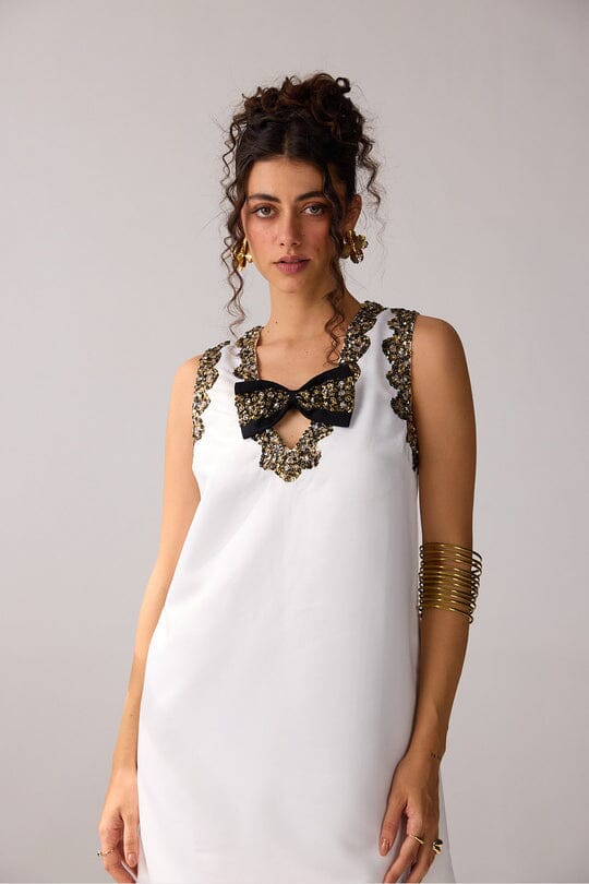 Embrace timelessness with this ivory shift dress, featuring a charming bow and intricate hand-embroidered sequin and stone detailing.