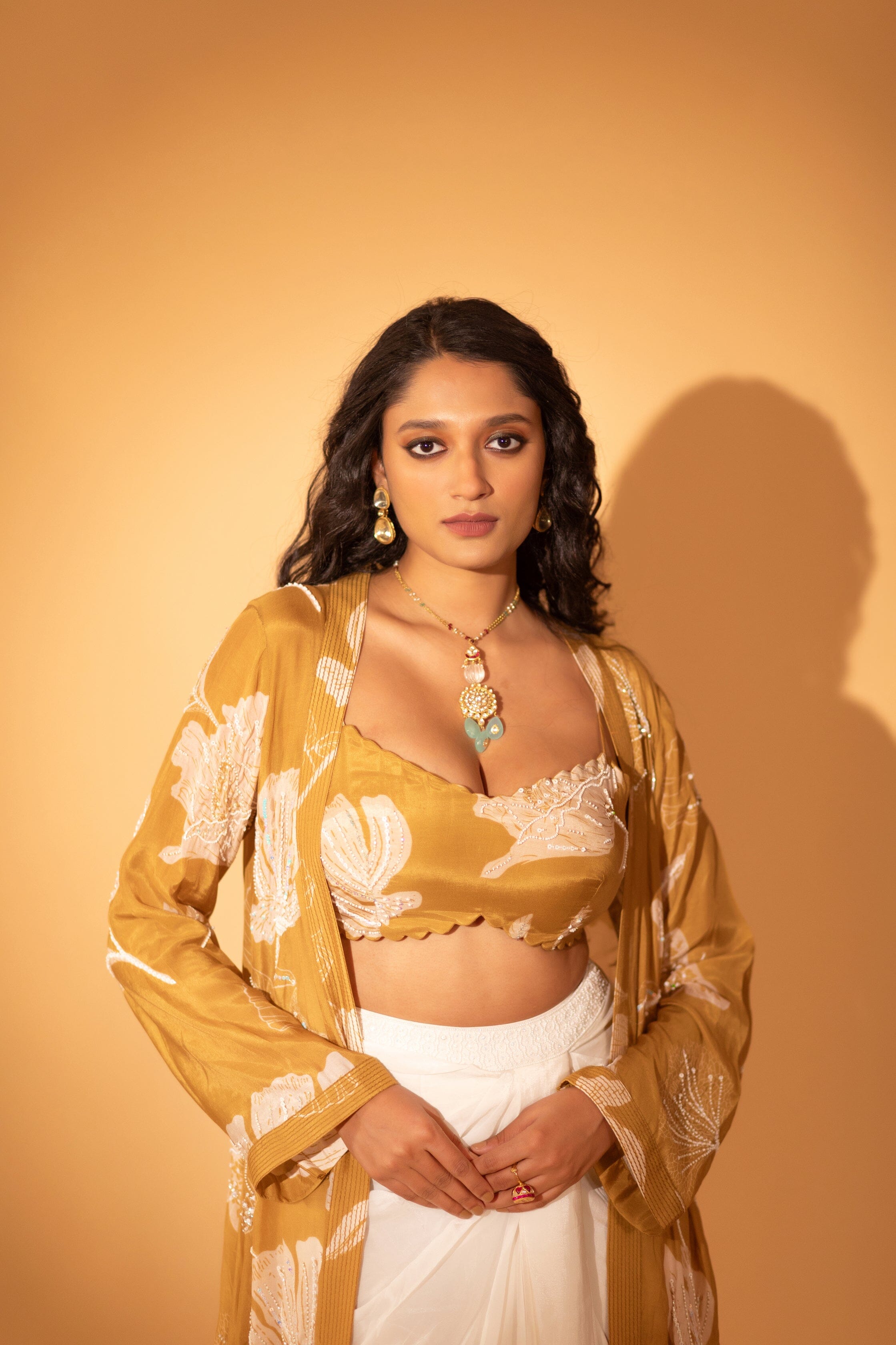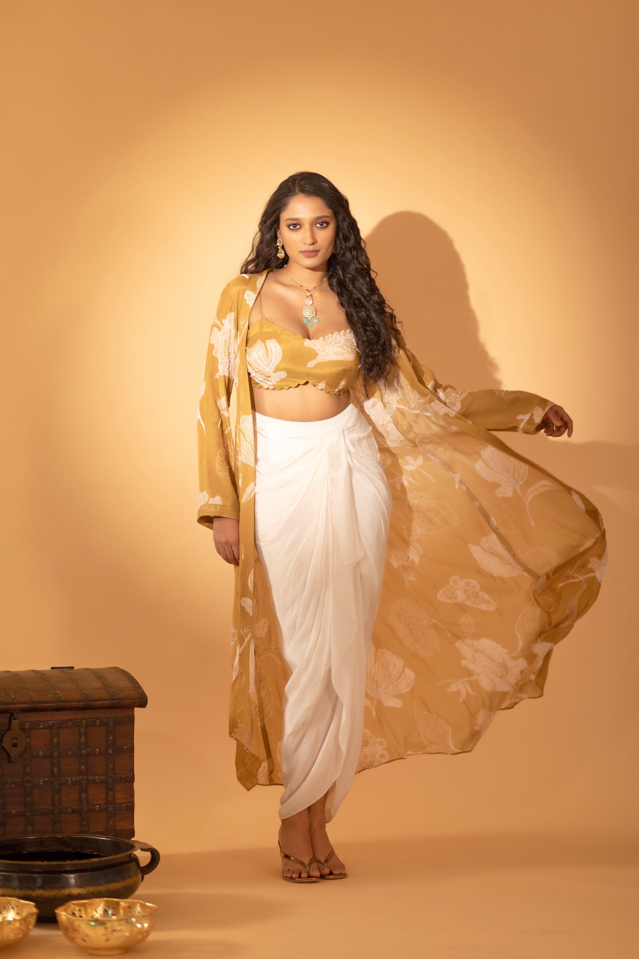 A jacket and bustier set with matching print and embroidery, paired with a drape skirt and belt with intricate detailing. A embroidered jacket set with bustier and drape skirt