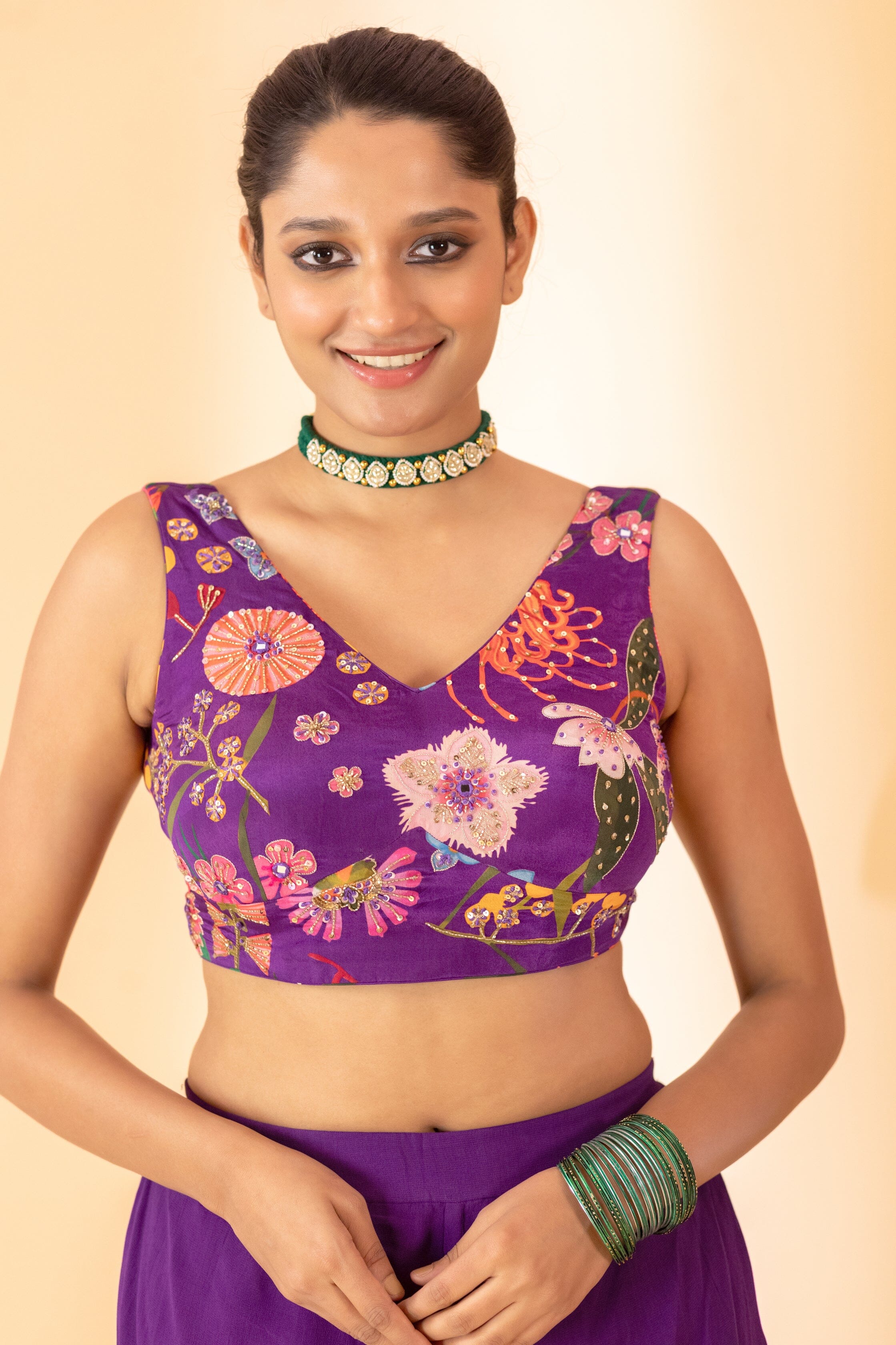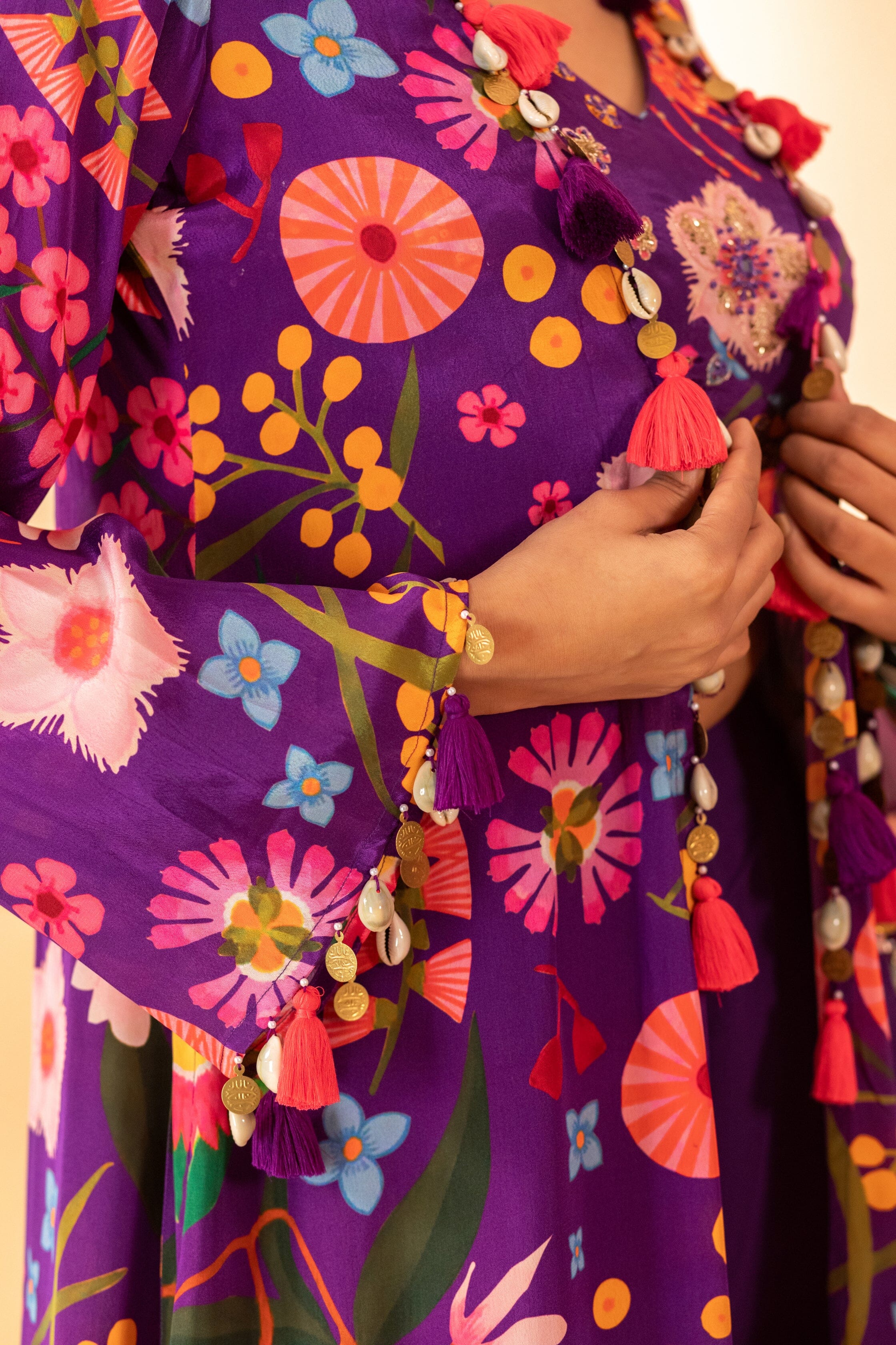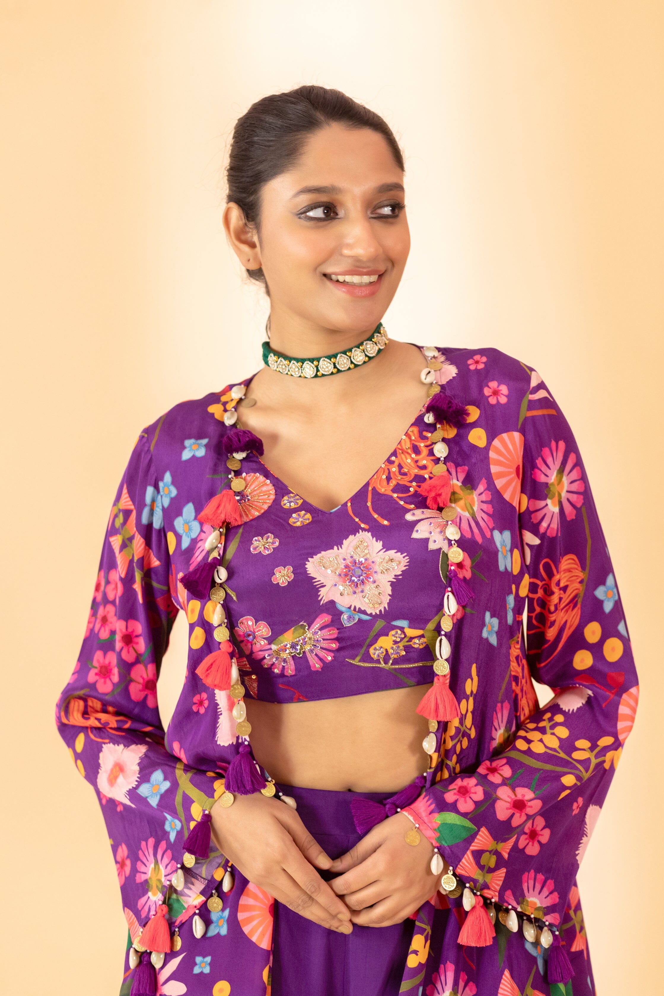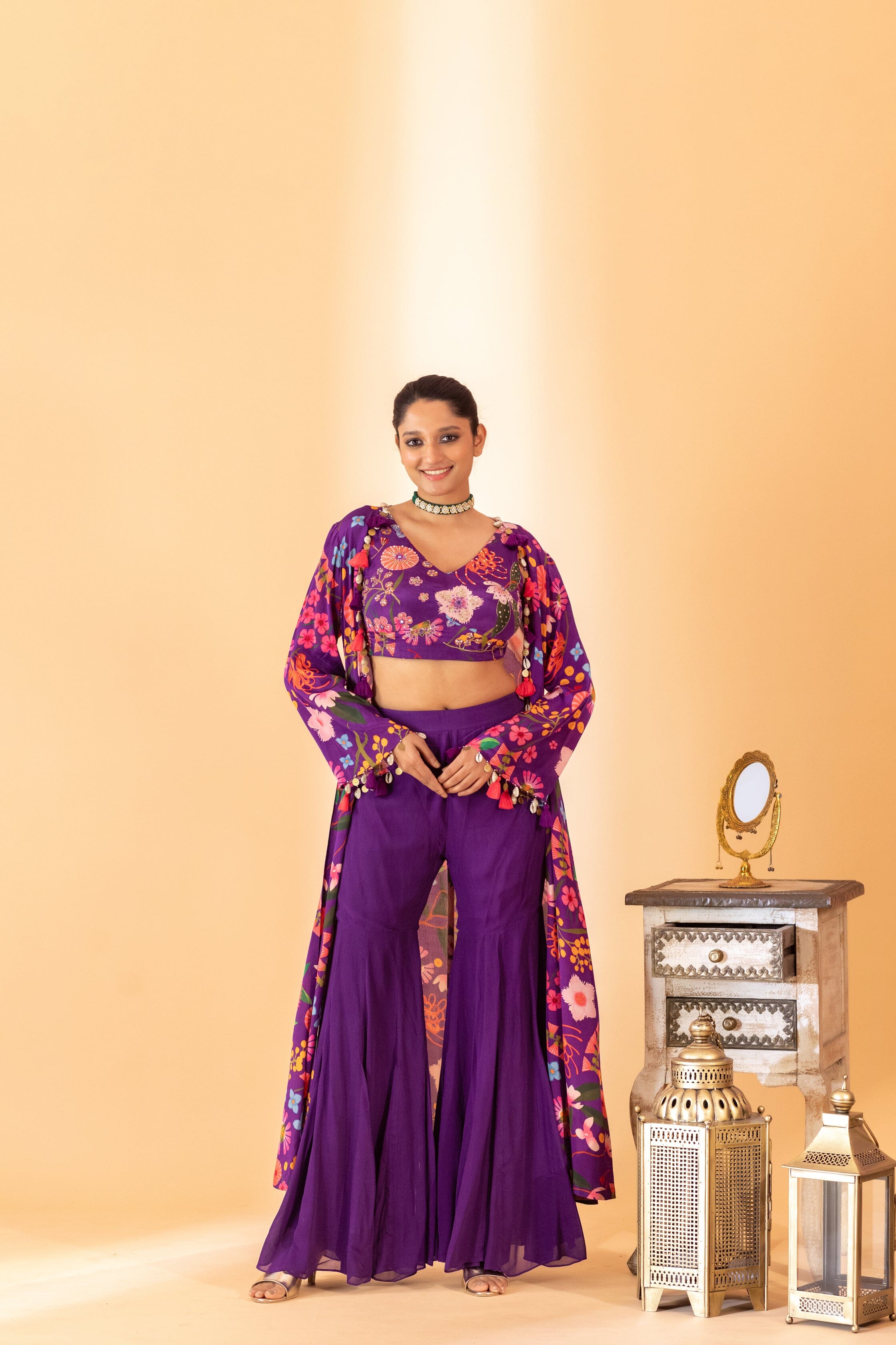 A floral printed jacket with small tassels, a matching hand-embroidered bustier, and palazzo pants. A floral printed jacket set paired with bustier and plazzo pants