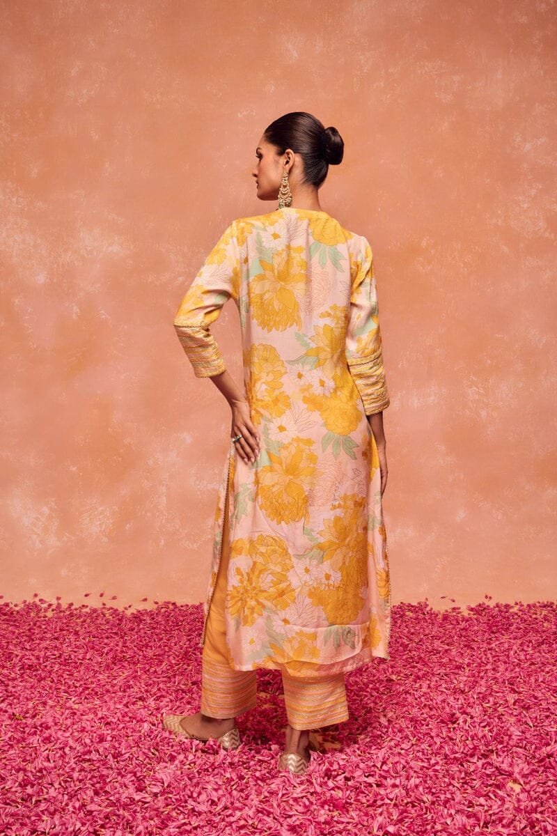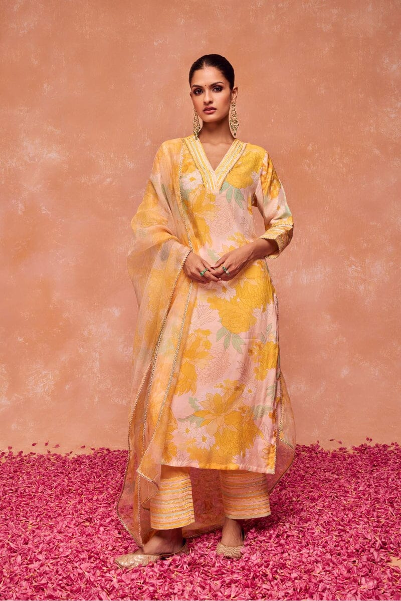 Embrace the essence of summer in our Juhi Yellow Floral Printed Kurta Set. This ensemble boasts a straight kurta and palazzo pants along with a Cotton Silk dupatta, all adorned with dazzling Gota embroidery.
