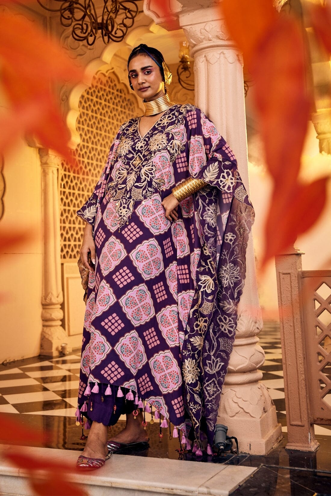 Purple printed kaftan set featuring a hand-embroidered patch on the neckline, finished with delicate embroidered lace and tassels.
