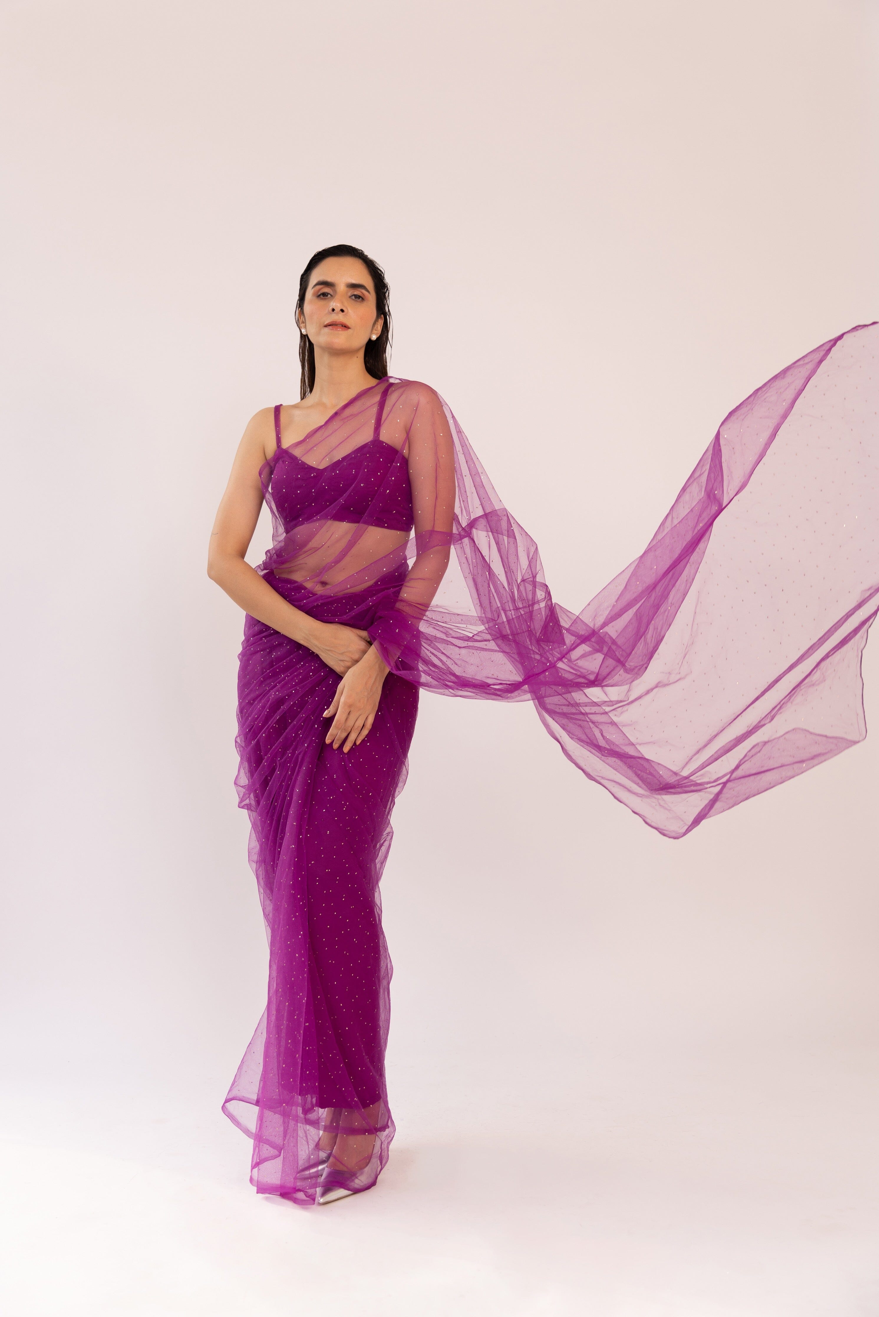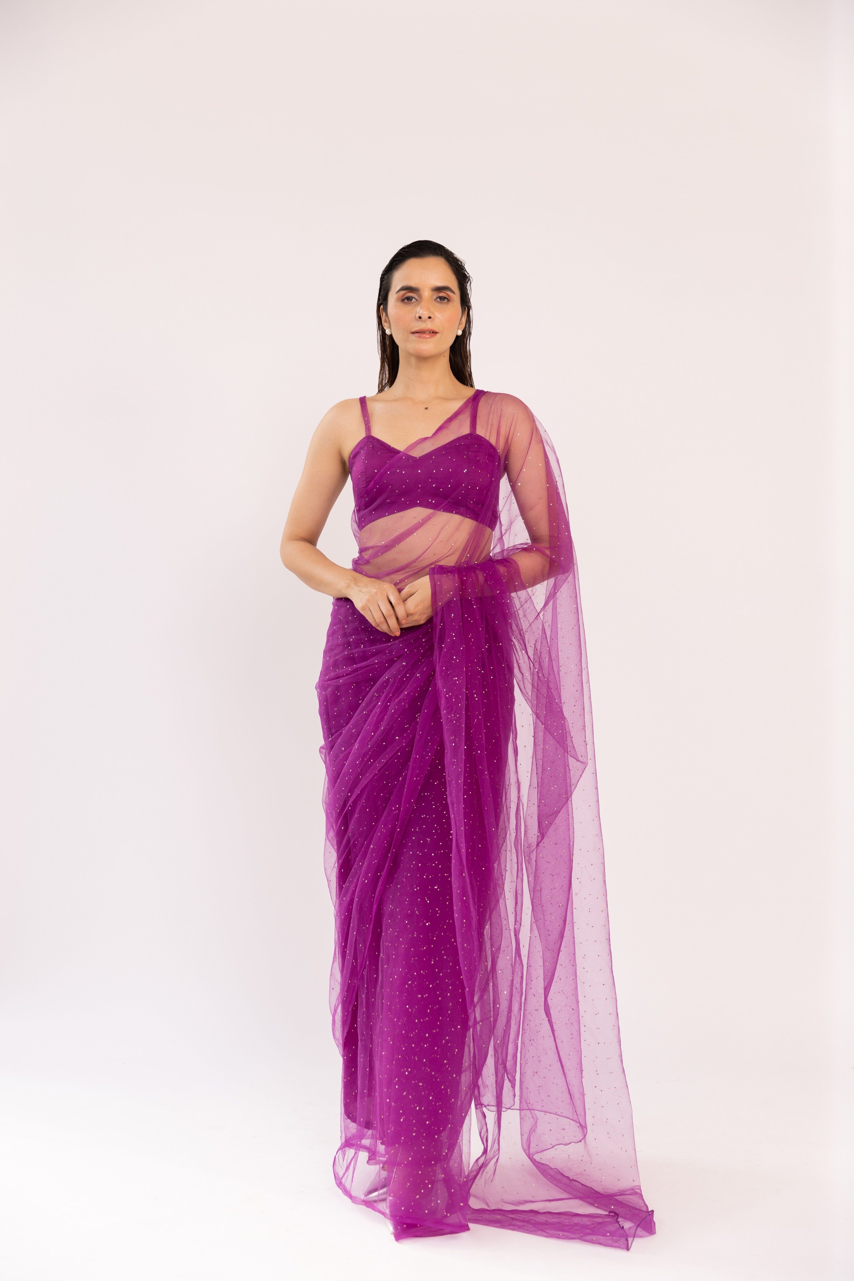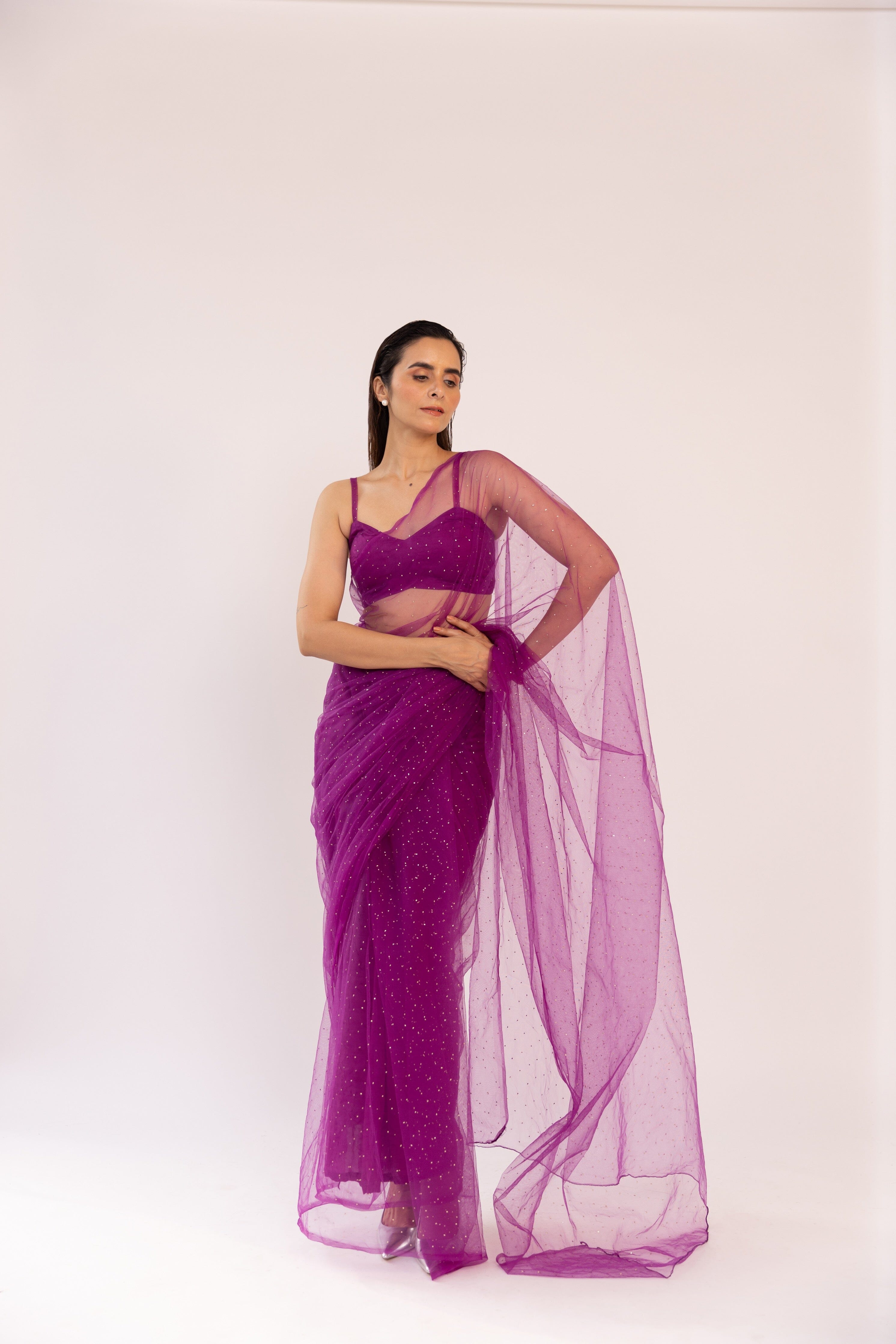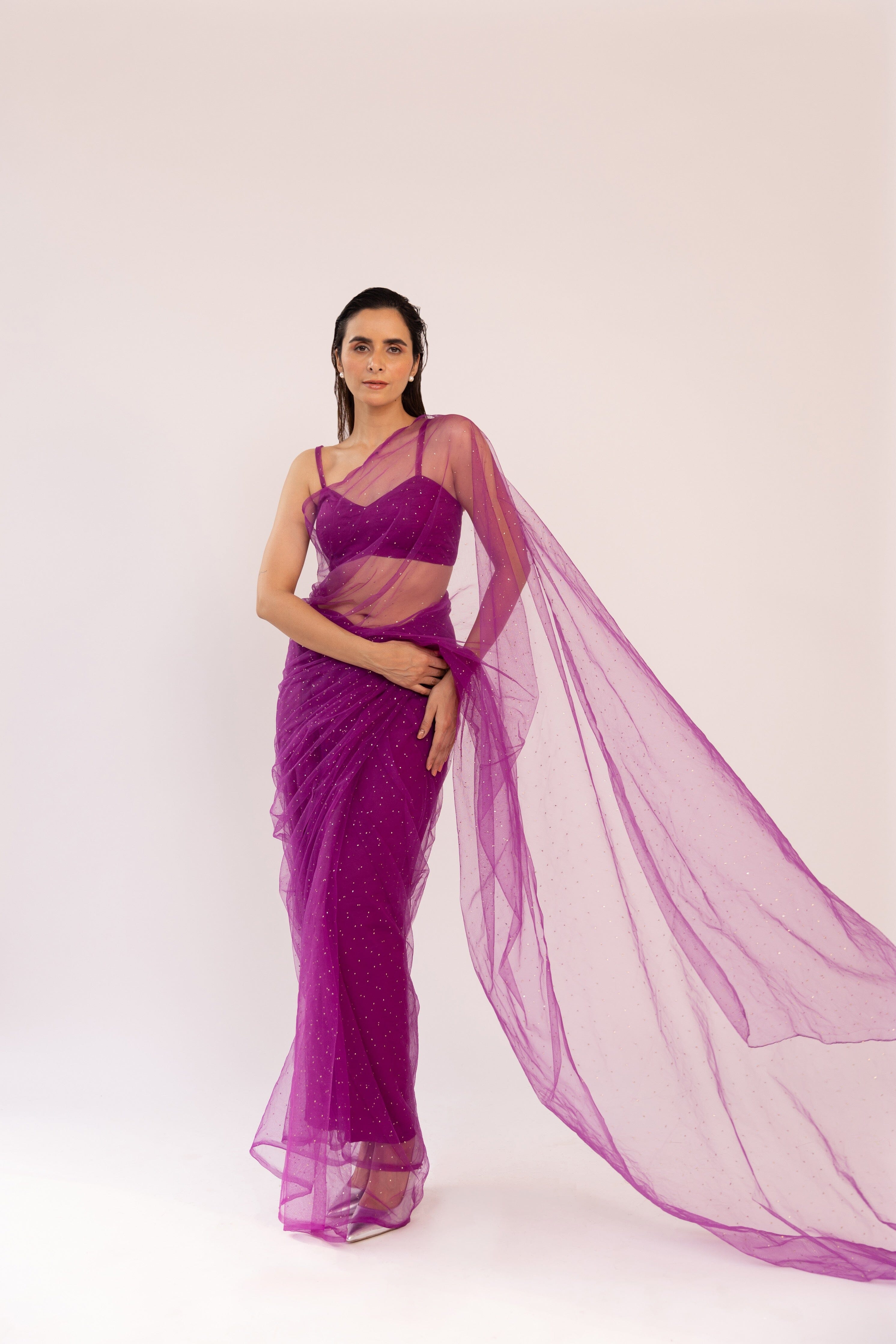 Featuring a burgundy pre-stitched saree in net base. It is paired with a strappy bandeau blouse.