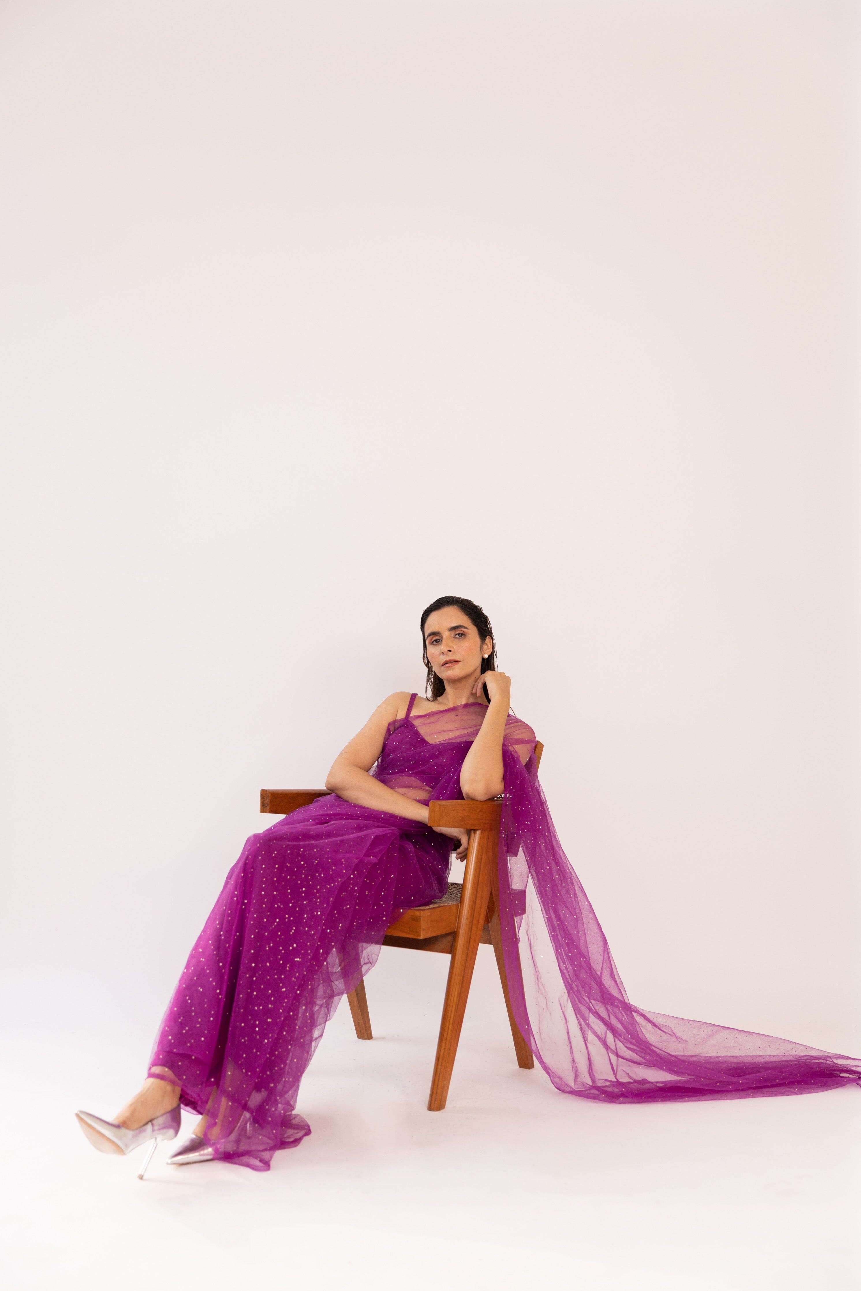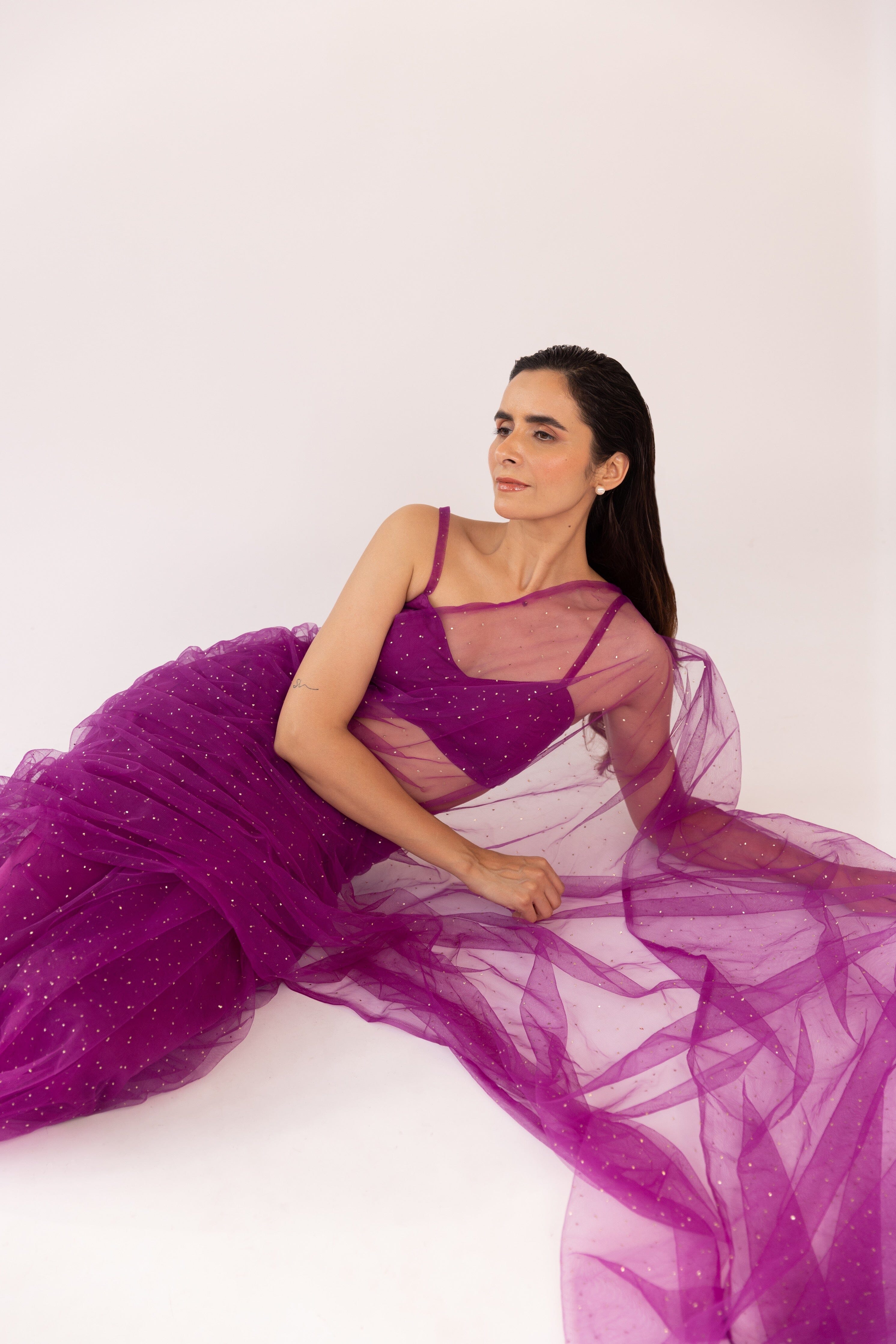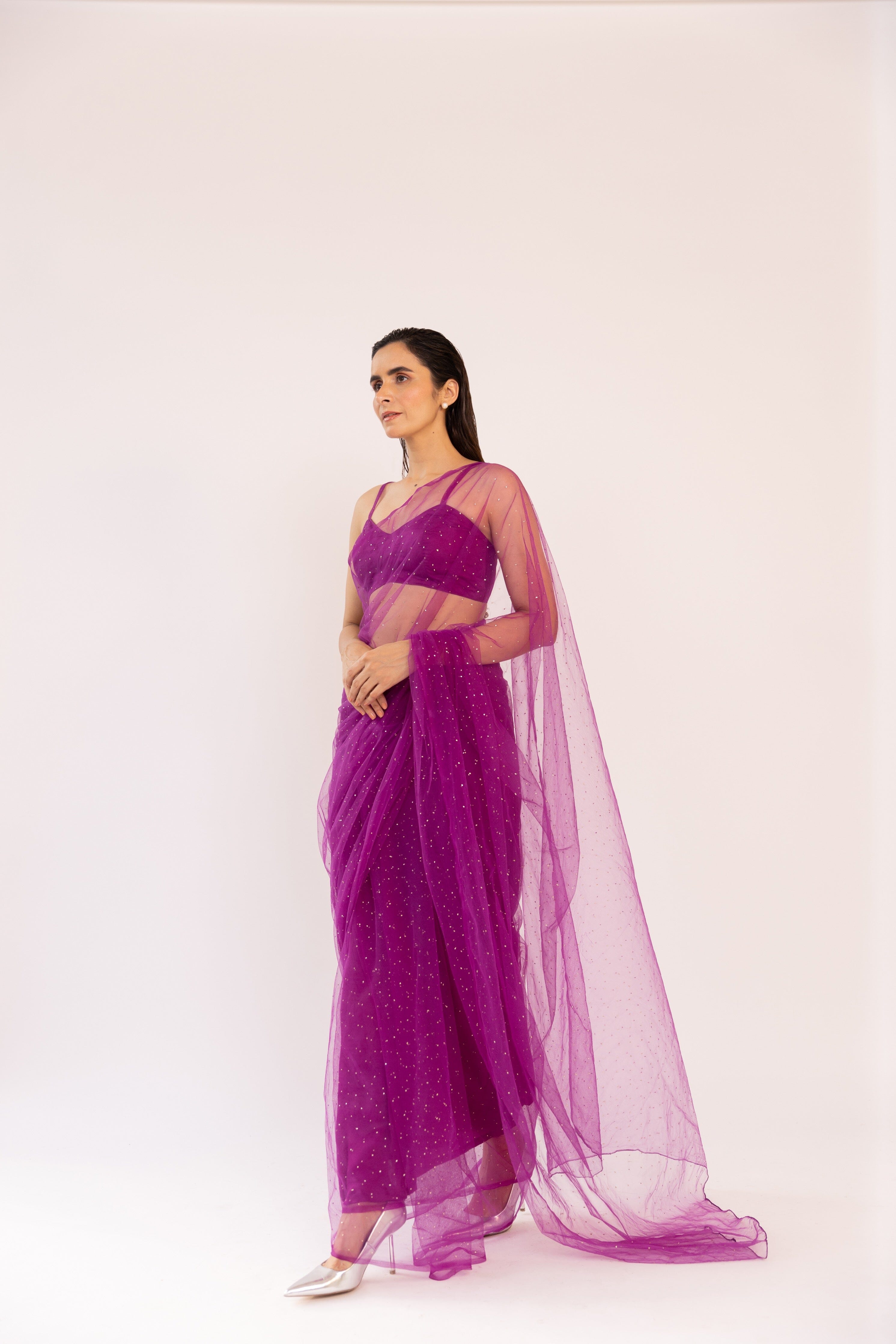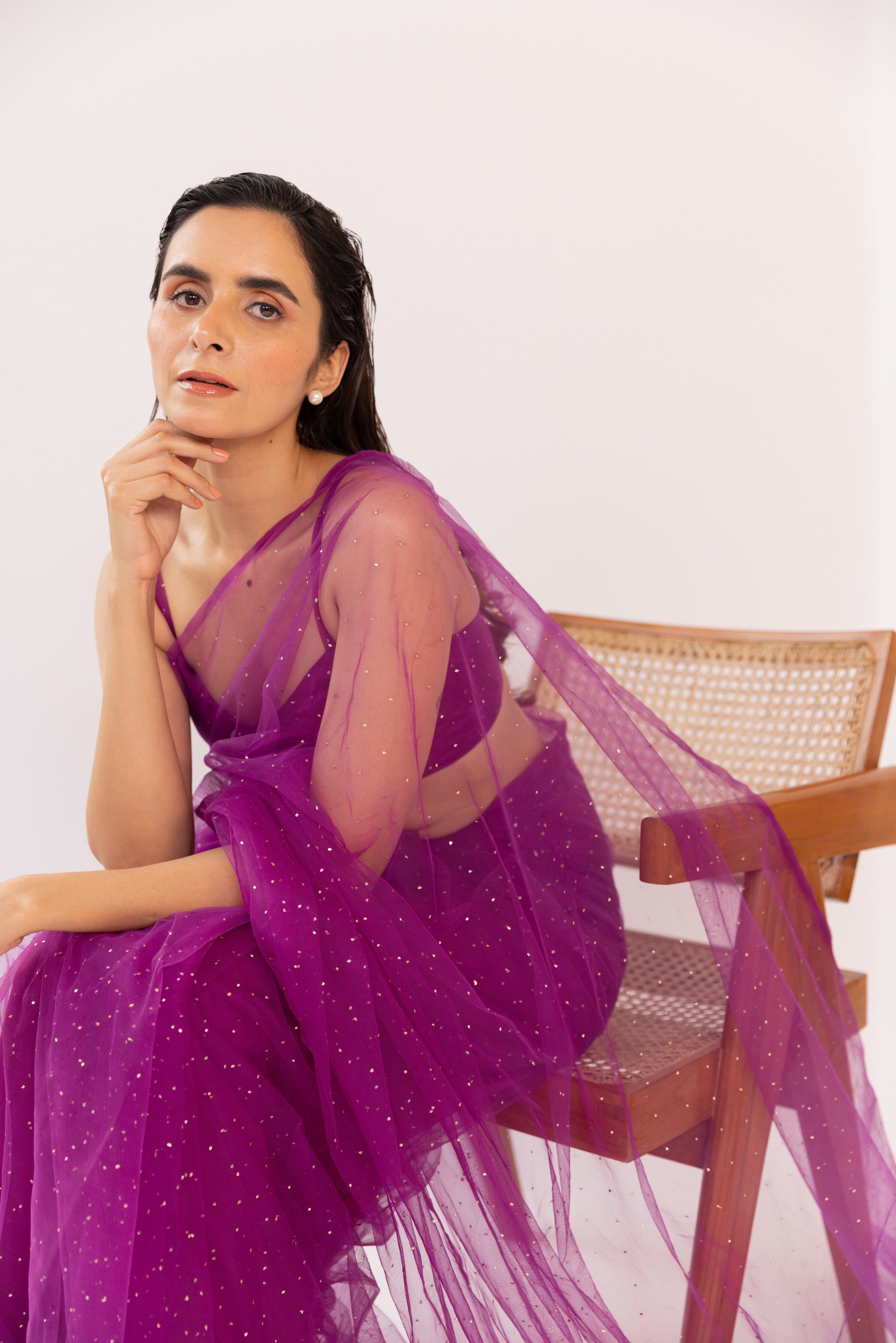 Featuring a burgundy pre-stitched saree in net base. It is paired with a strappy bandeau blouse.