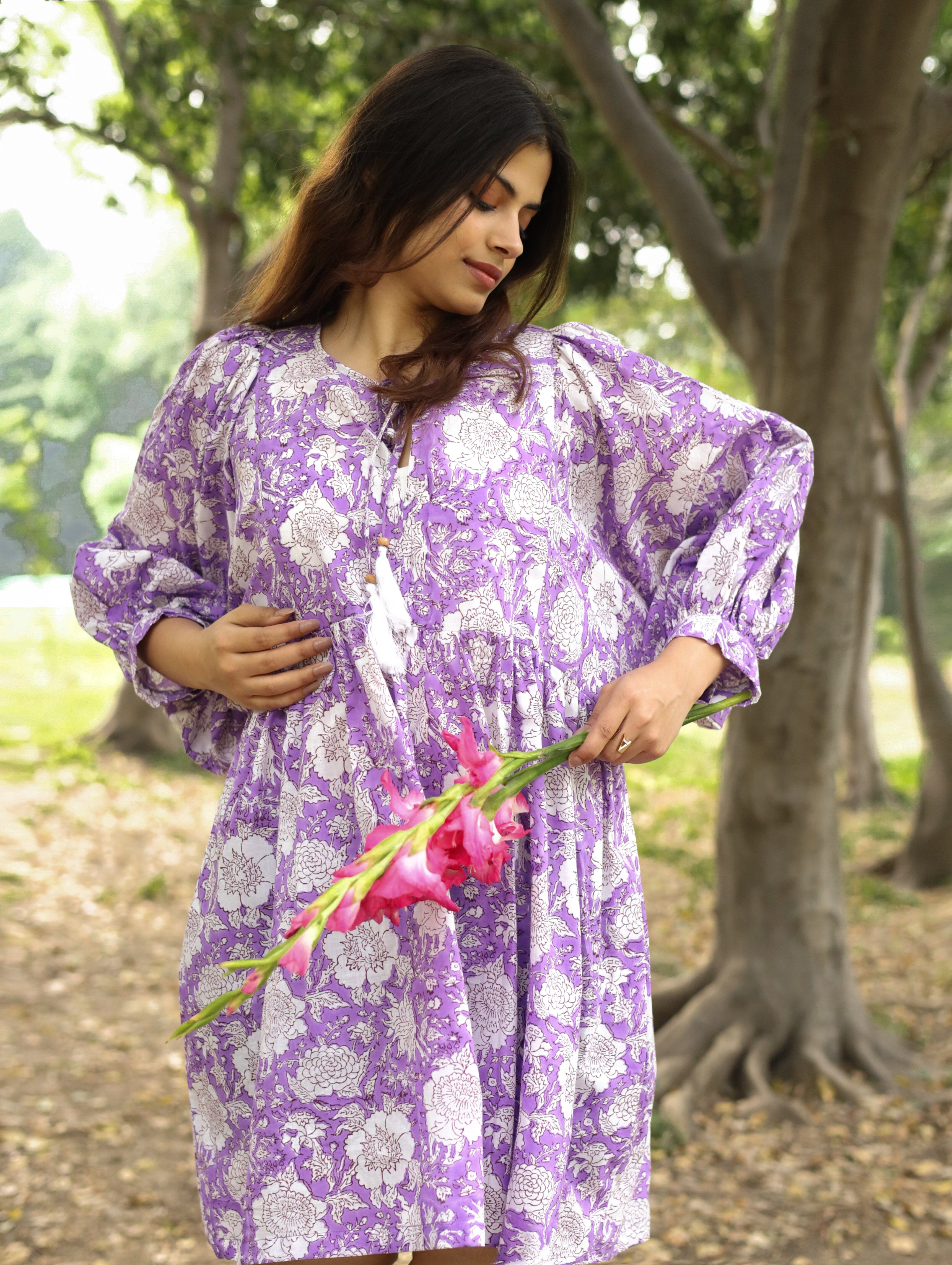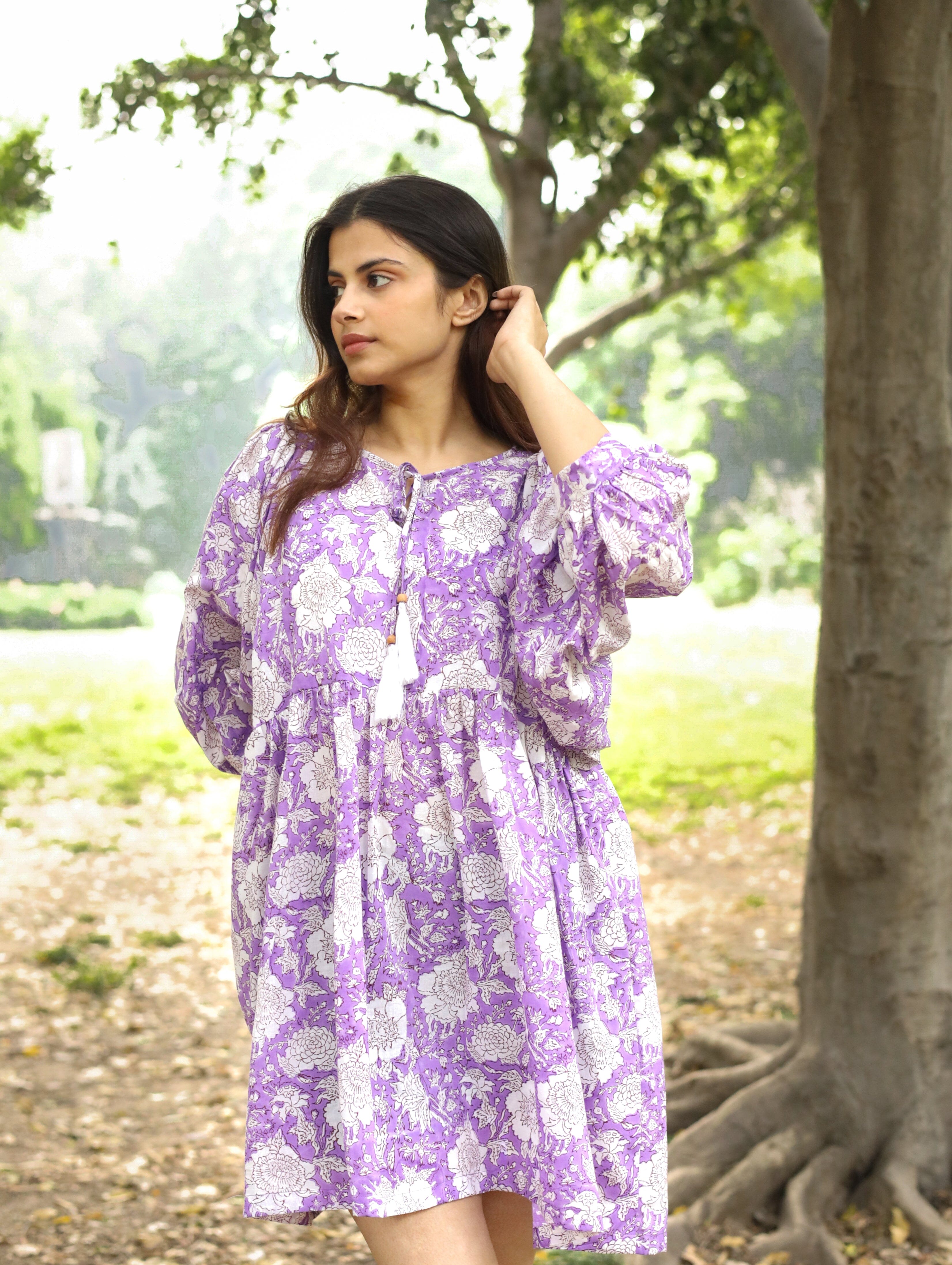 A gorgeous Lilac Floral Print Dress with gathers and huge statement sleeves. This short Length Dress is all things wonderful & super breathable for those casual summer outings!