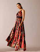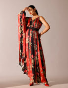 Make an entrance in this asymmetric georgette satin gown, digitally printed in bold florals. The dramatic hemline and fluid flare bring just the right amount of swish, while the hand-piped belt adds a polished finish. A contemporary silhouette that balances statement-making detail with timeless charm — perfect for evenings that call for effortless glamour.