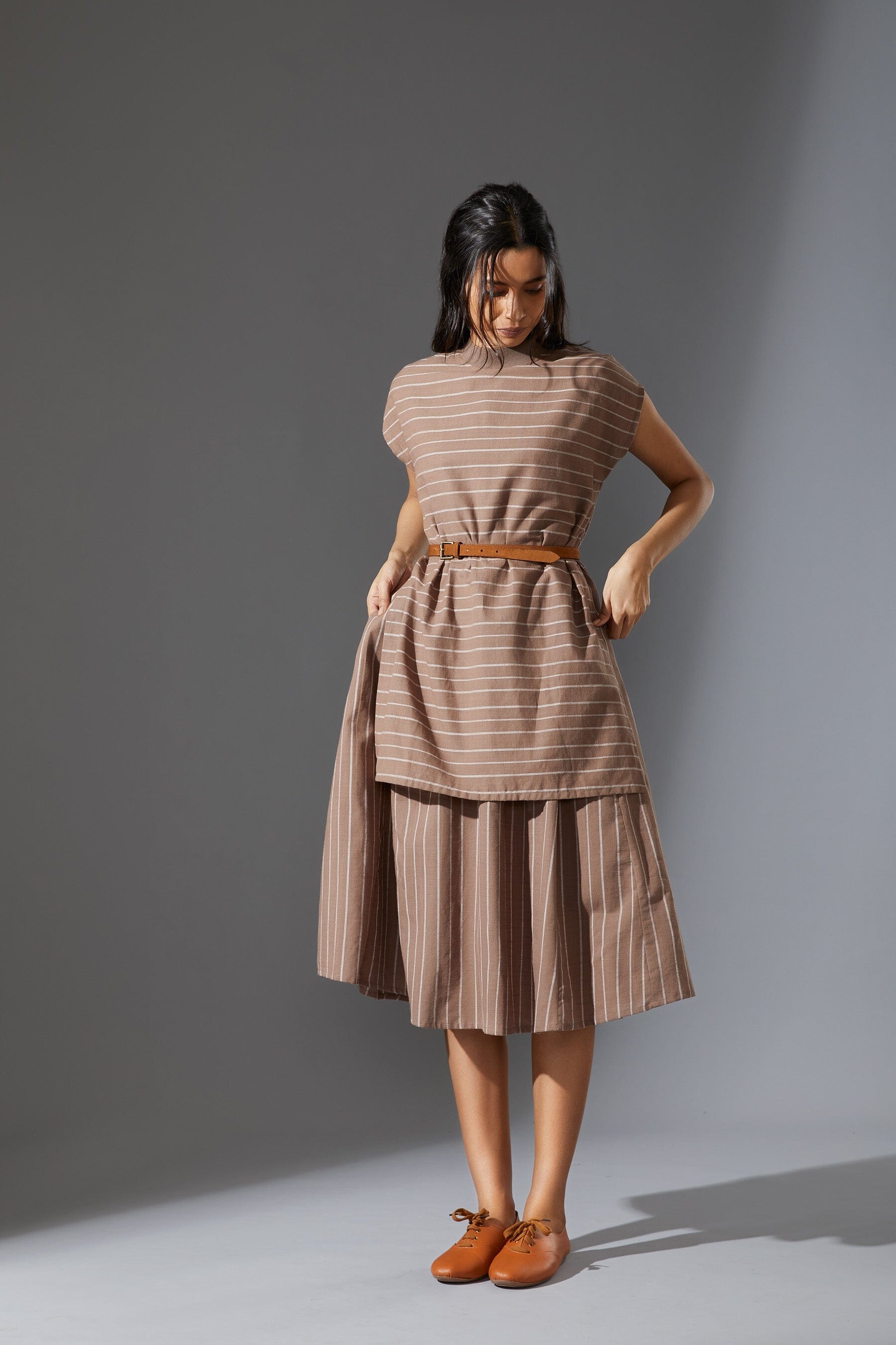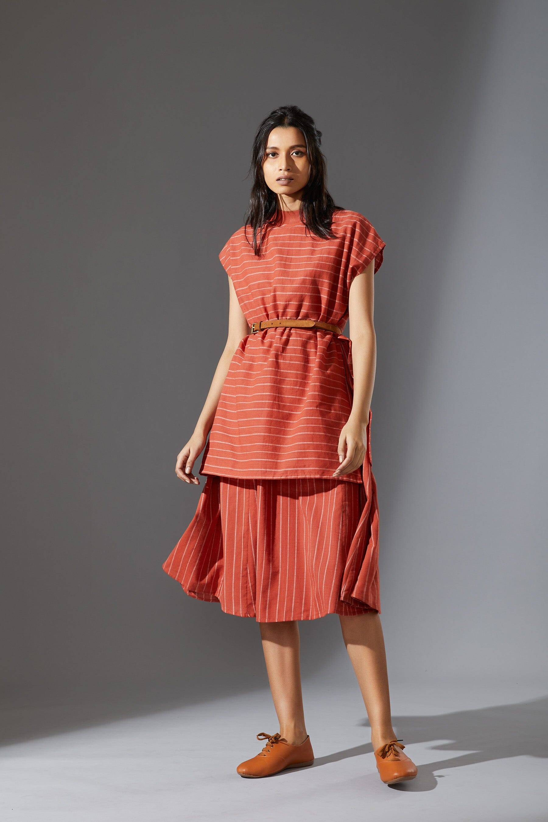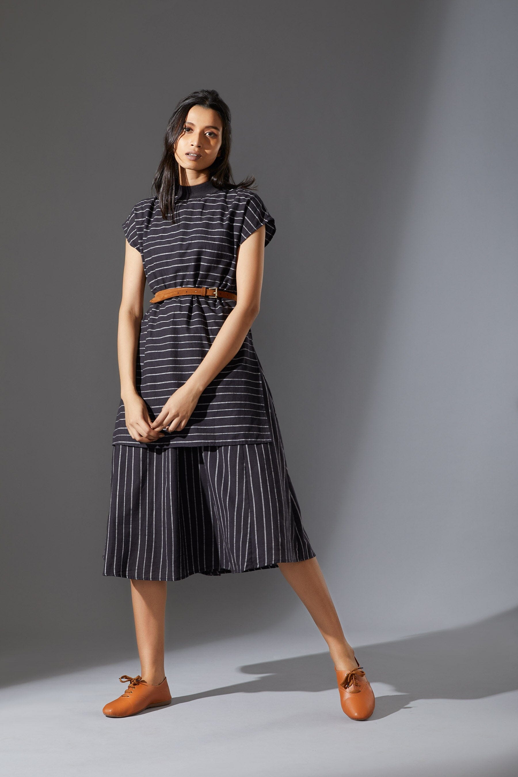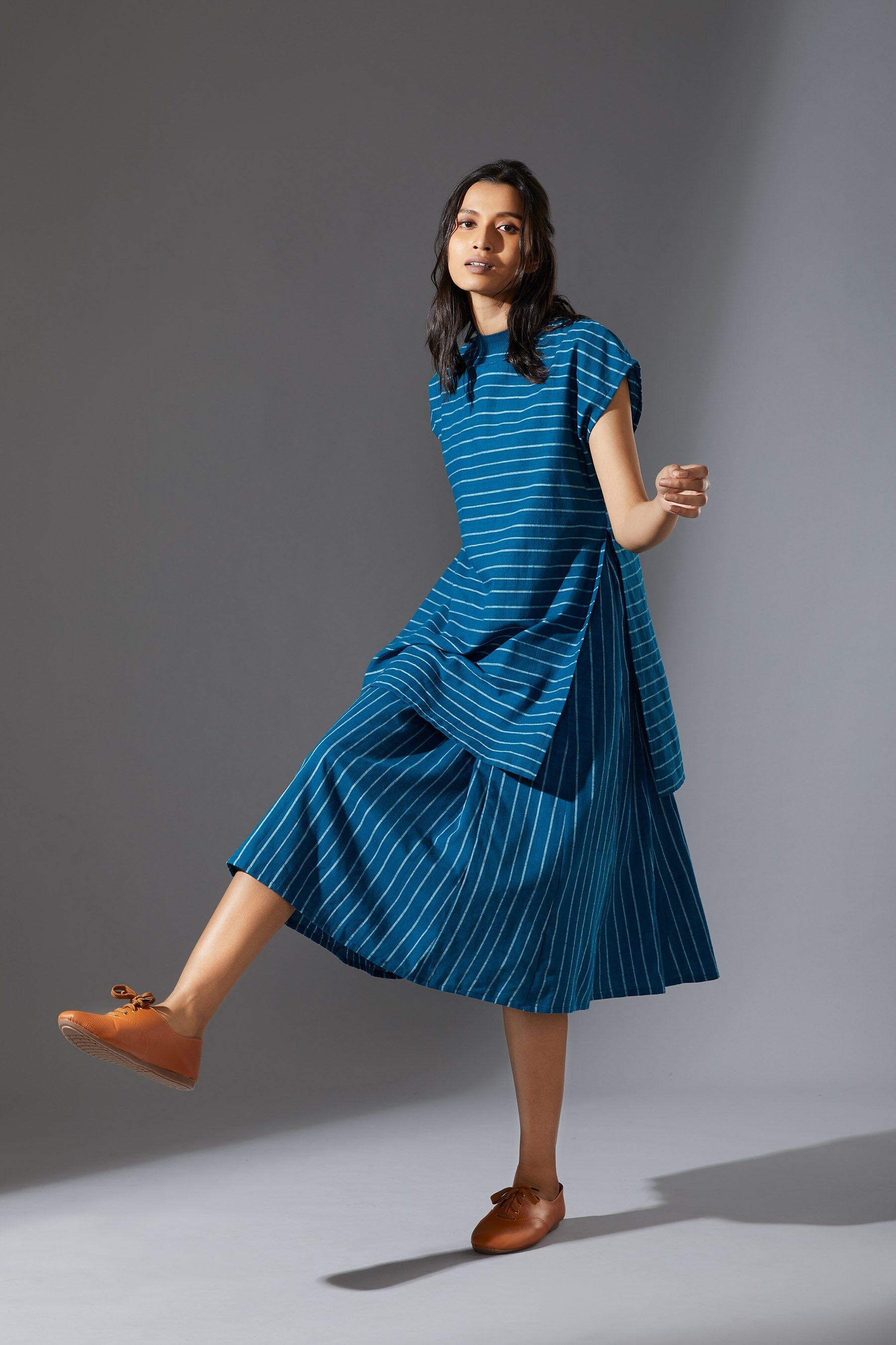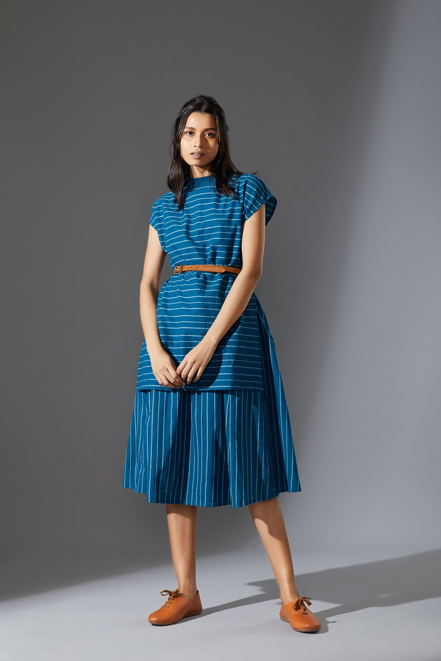 A fun layered dress made with handwoven cotton comes with a ribbed t-shirt neck. Style it with a belt and sneakers to complete the look !!