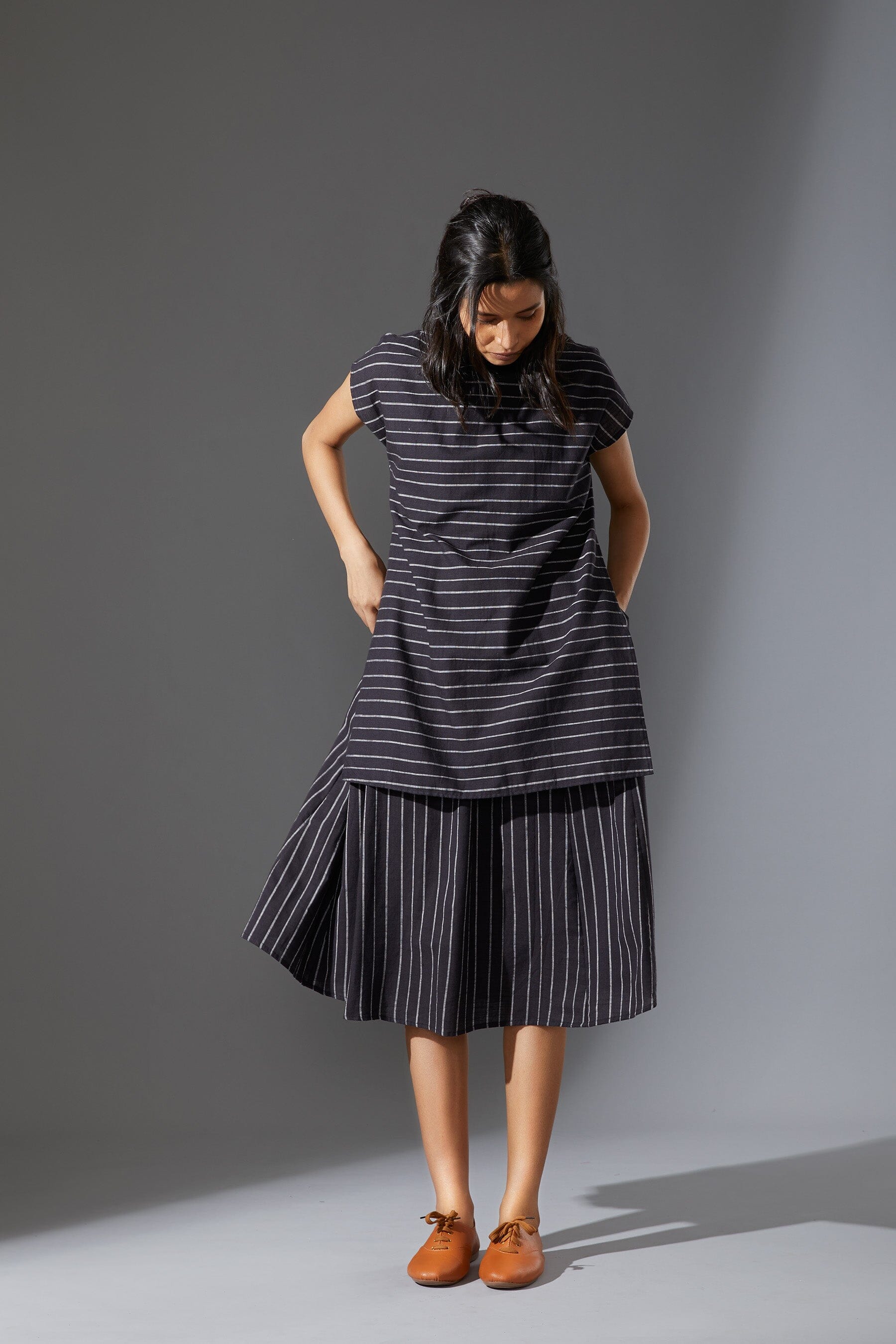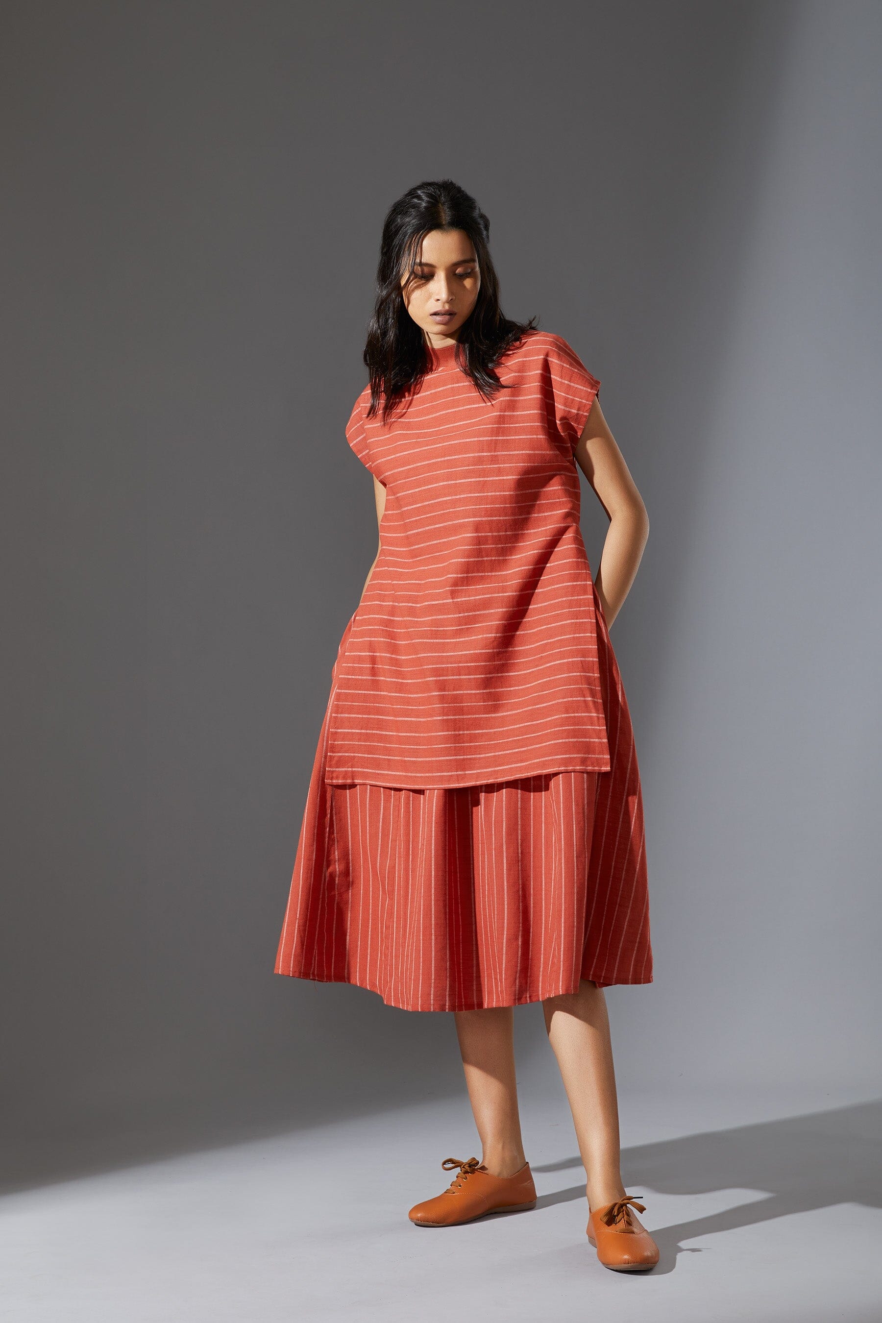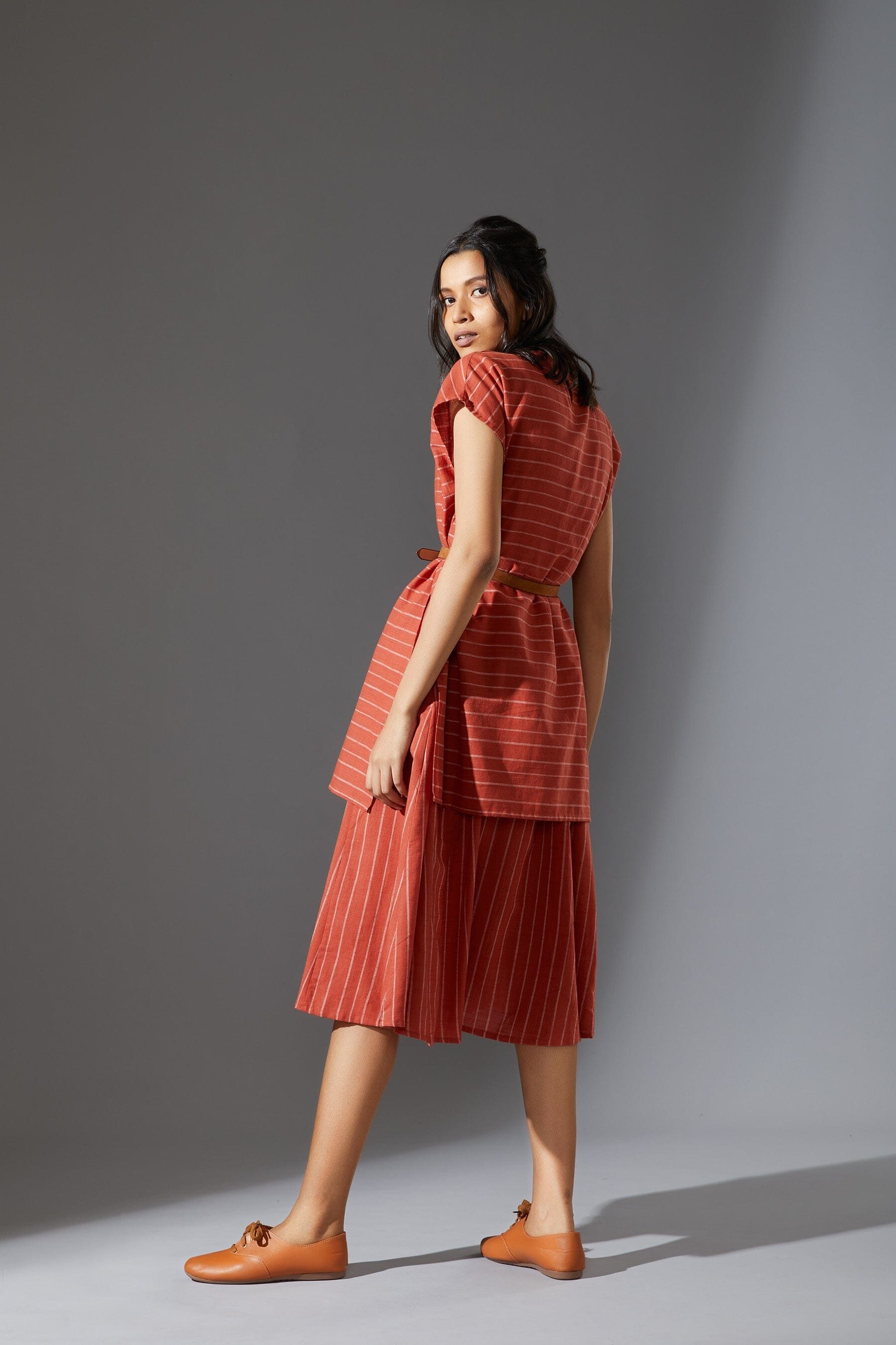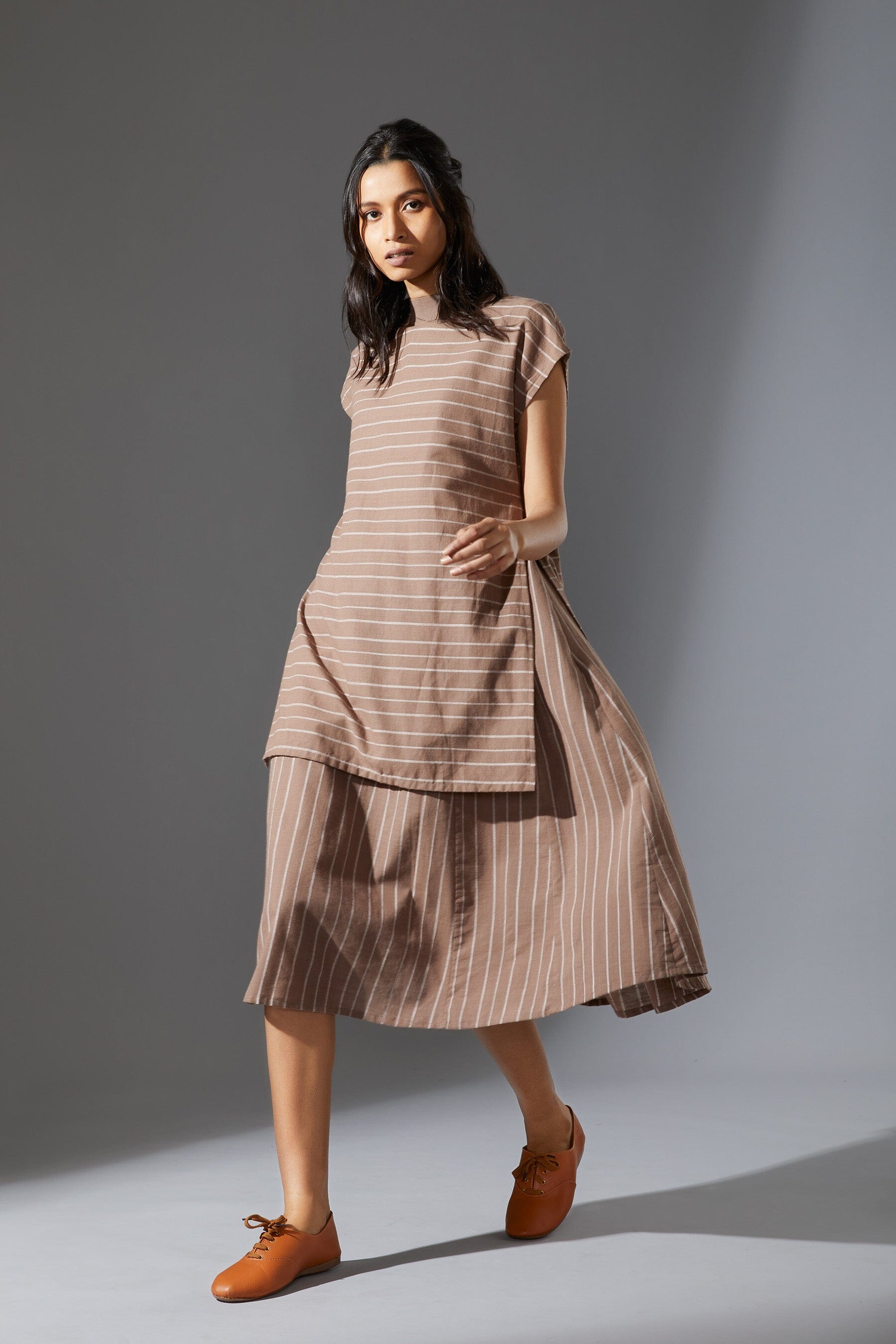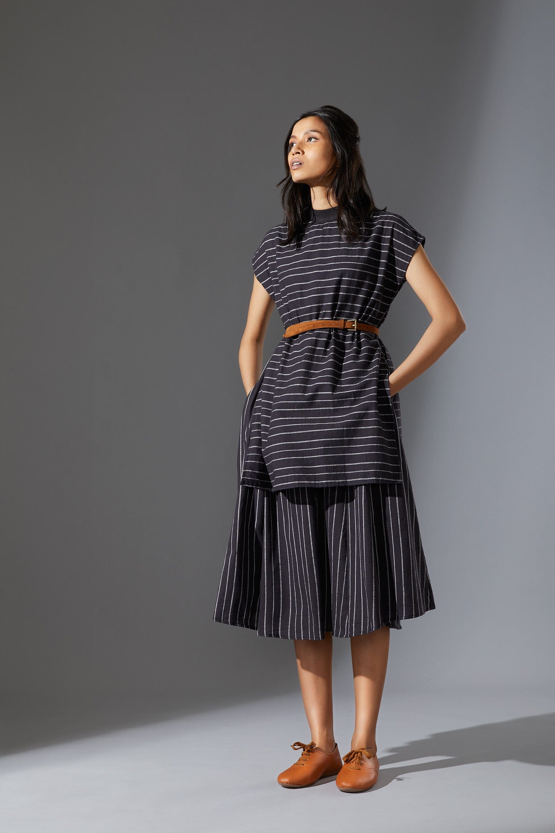 A fun layered dress made with handwoven cotton comes with a ribbed t-shirt neck. Style it with a belt and sneakers to complete the look !!