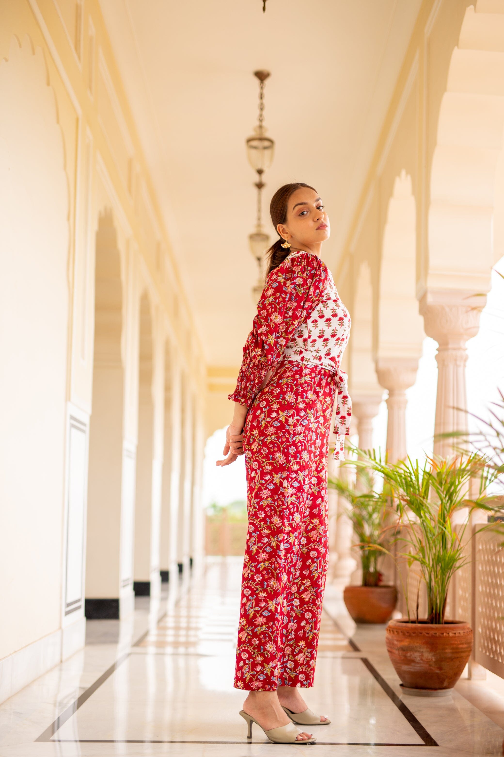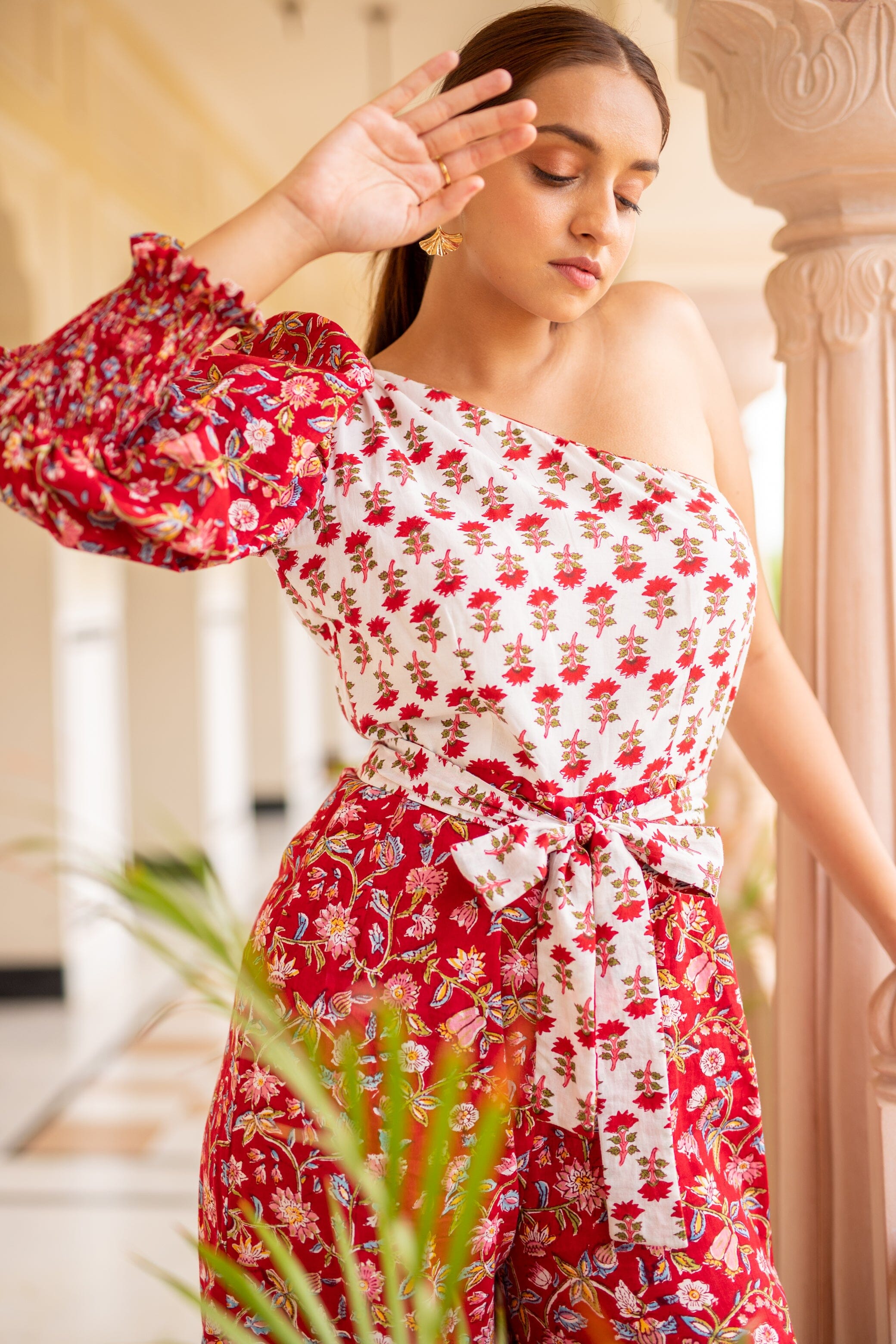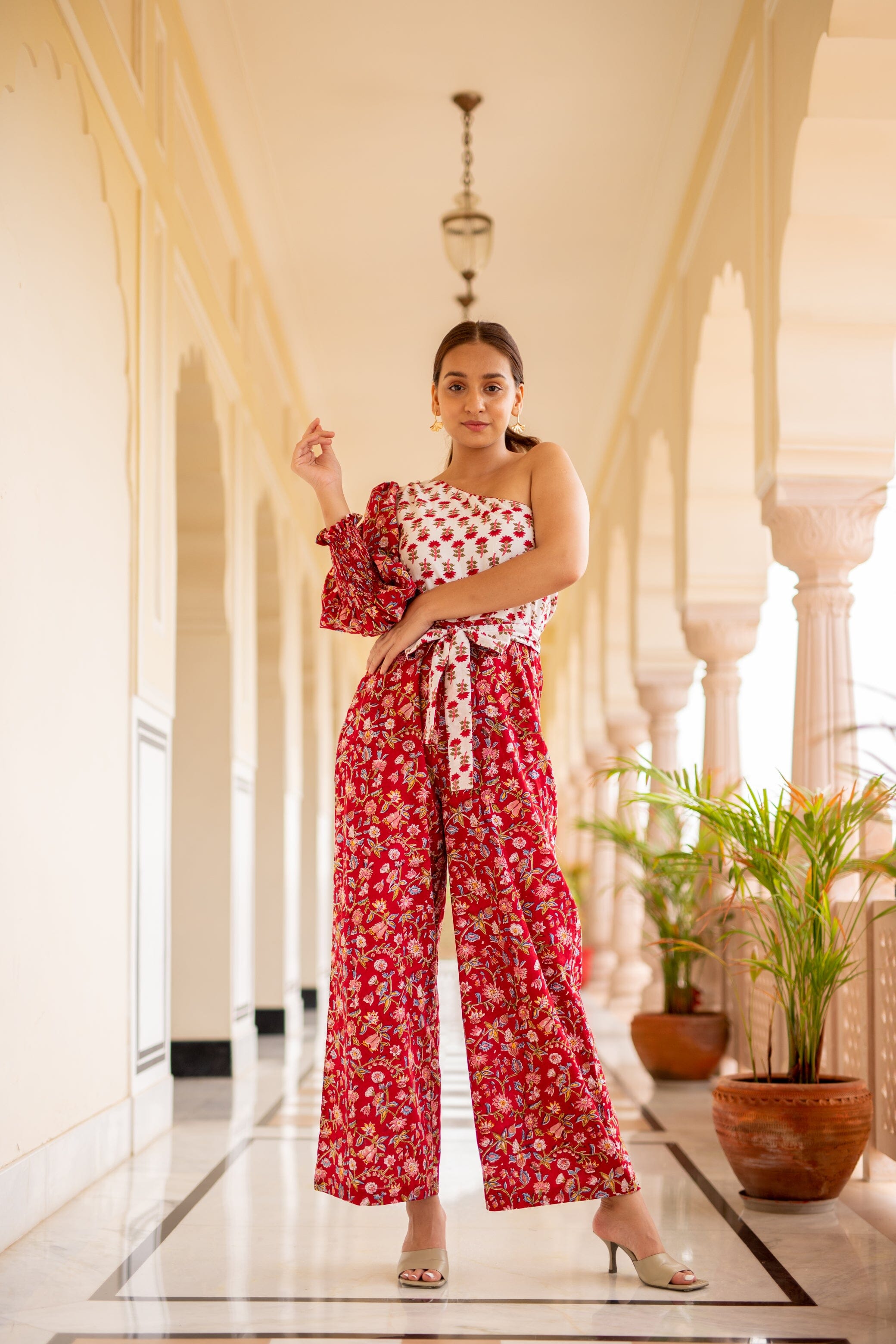 One Shoulder Jumpsuit With Tie Up Belt, Sleeve With Smocked Sleeve, Straight Fit Bottom. Features one shoulder block printed jumpsuit with tie-up belt.