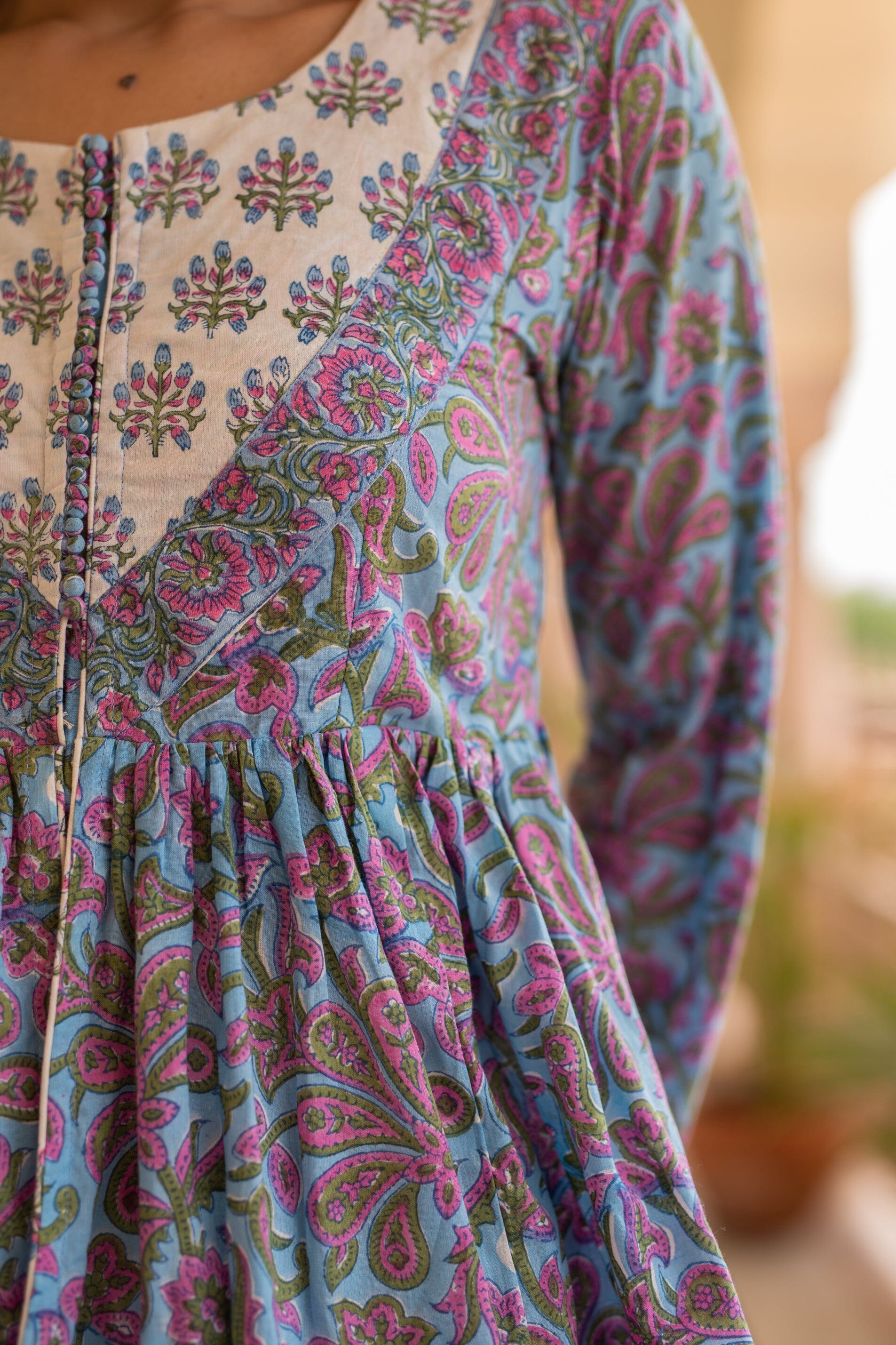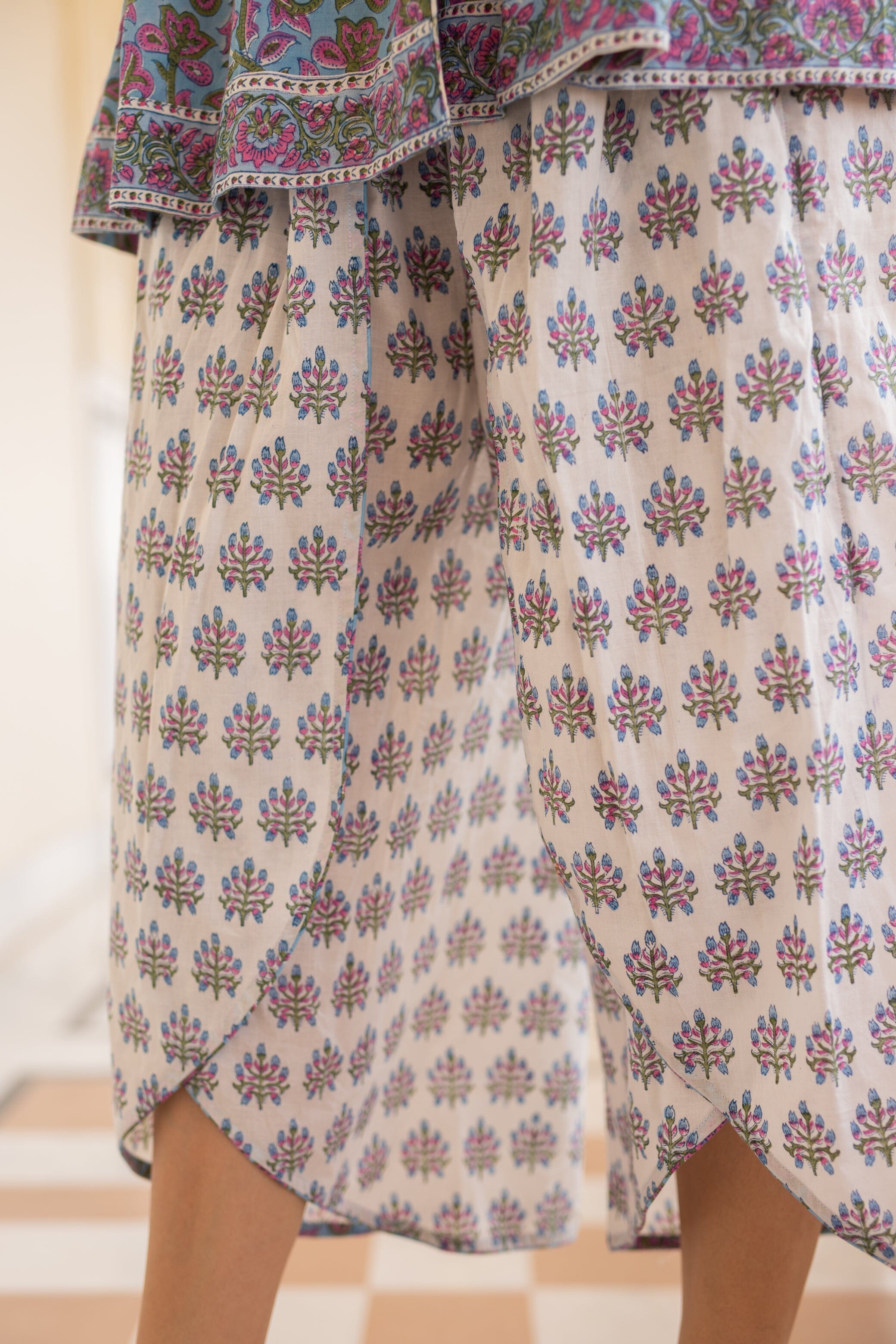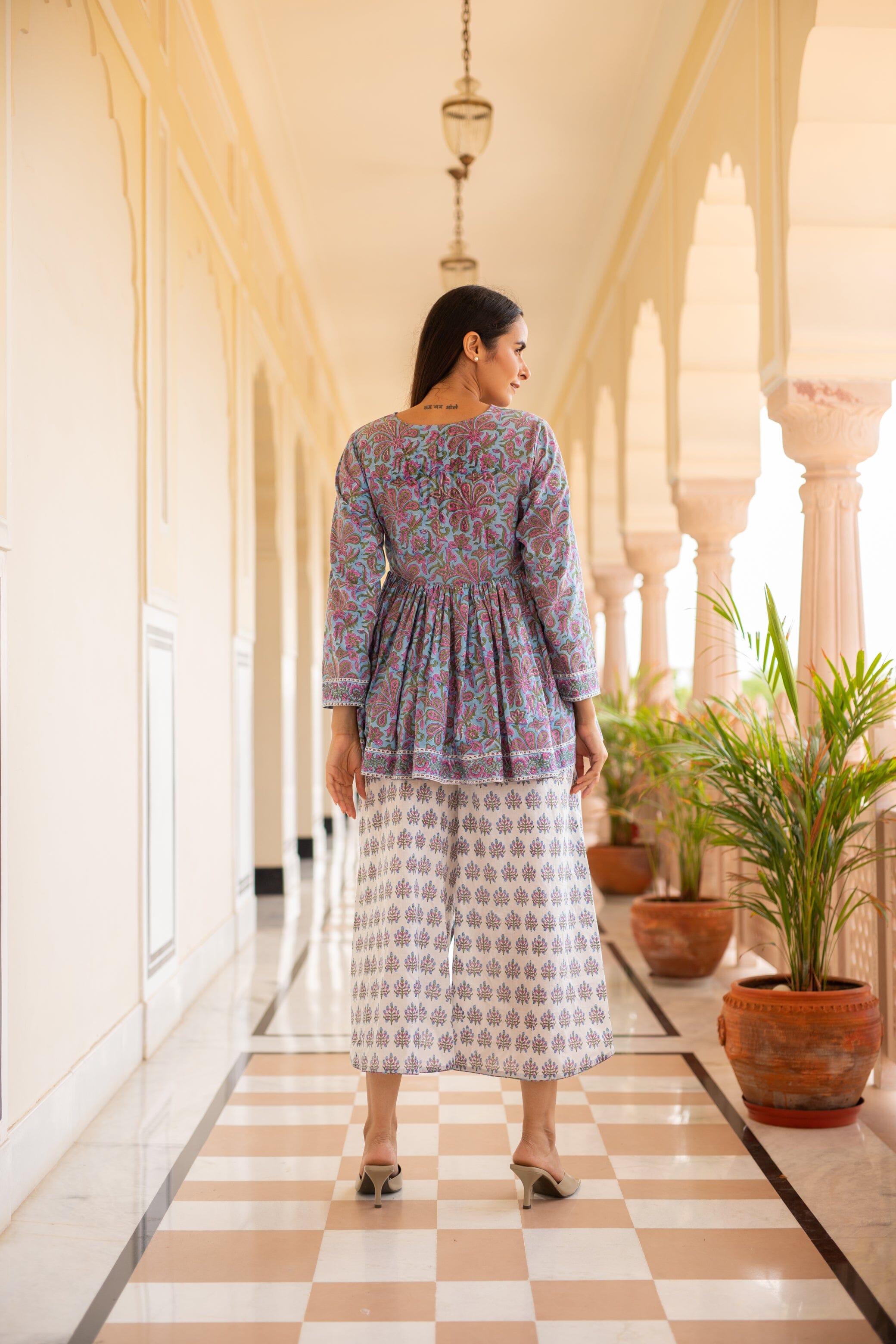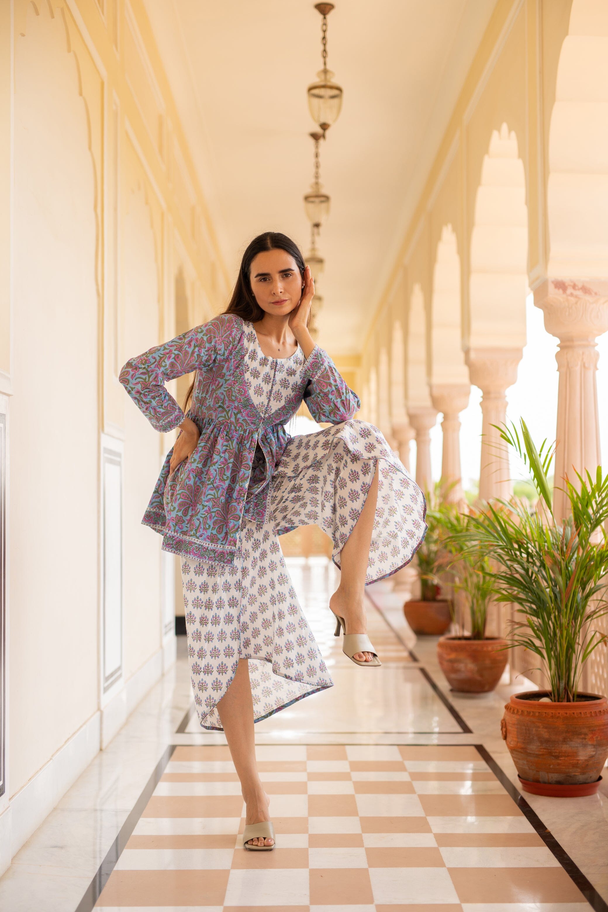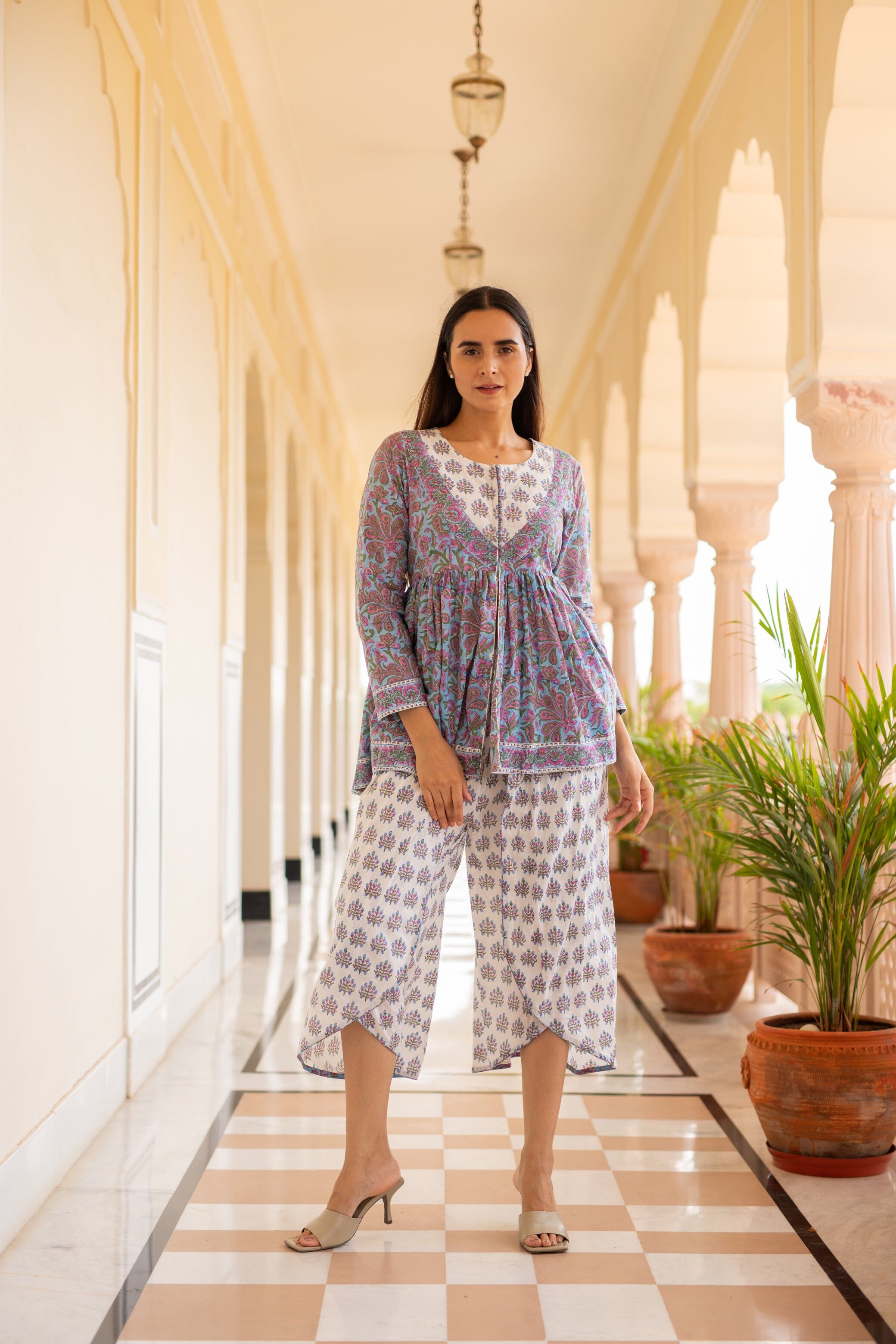 Round Neck Tunic Top Detailed With Border Facing, Mock Potli Button Detailing, Dhoti Pants Featuring short block printed tunic with dhoti pants.