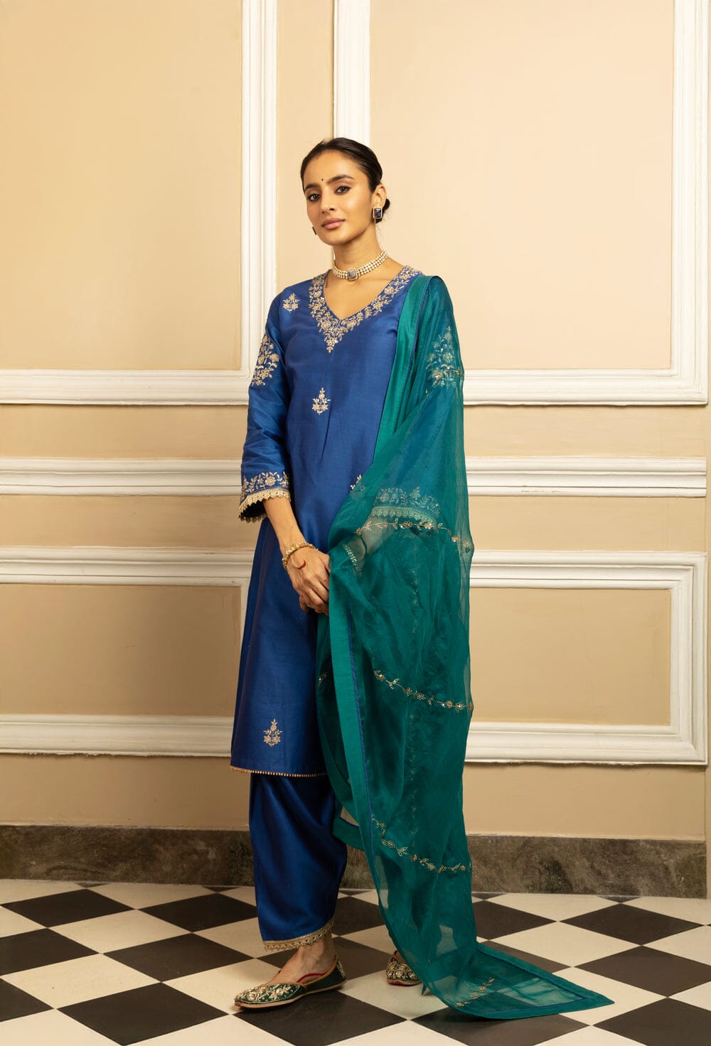 The Naaz Blue Kurta Set is an exquisite choice for those looking to make a statement at festive events, combining timeless beauty with rich, artisanal detailing. This kurta is complemented with a pure silk organza dupatta and silk chanderi salwar. Adorned with intricate embroidery, featuring zari, dabka, sequins, and gota work.