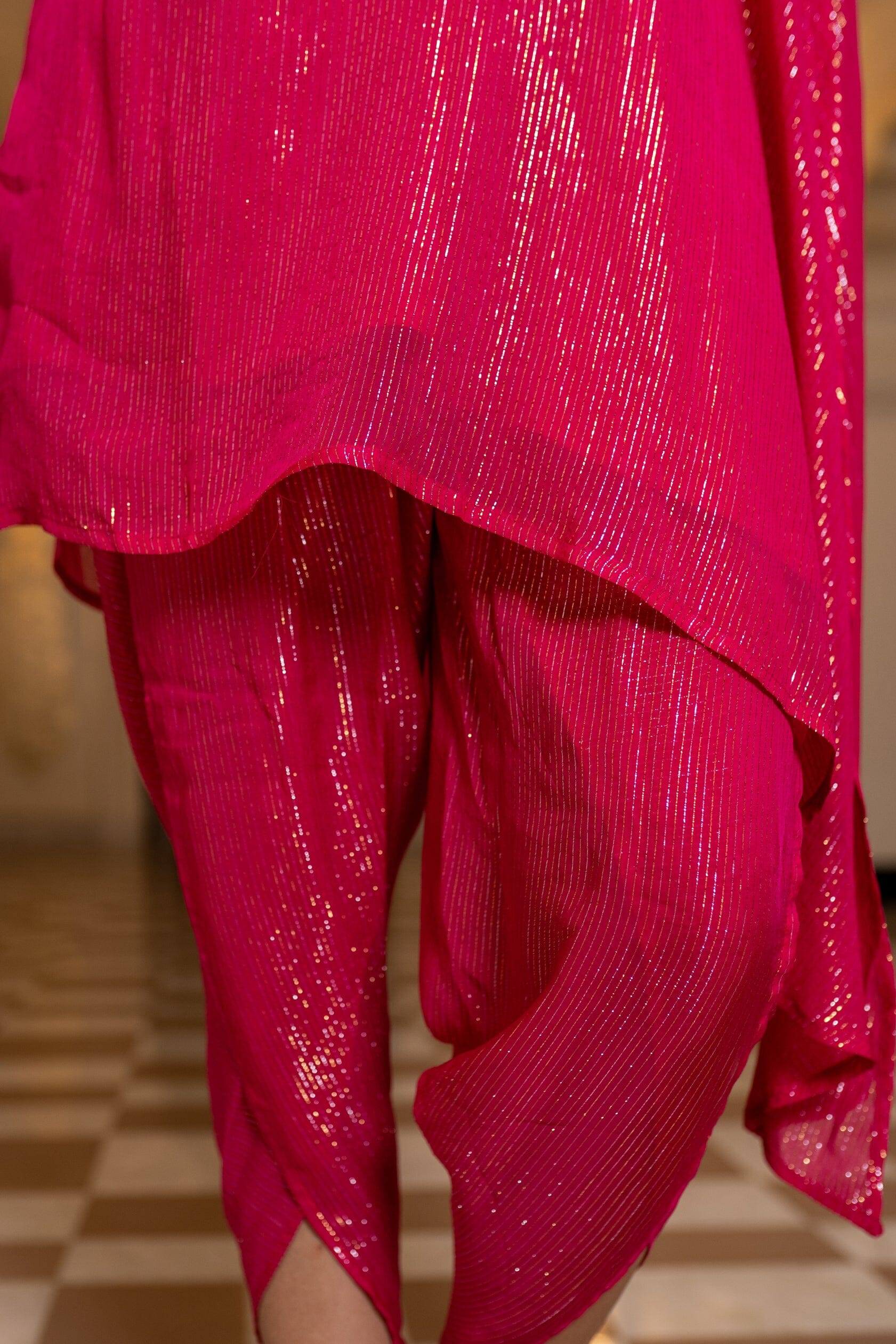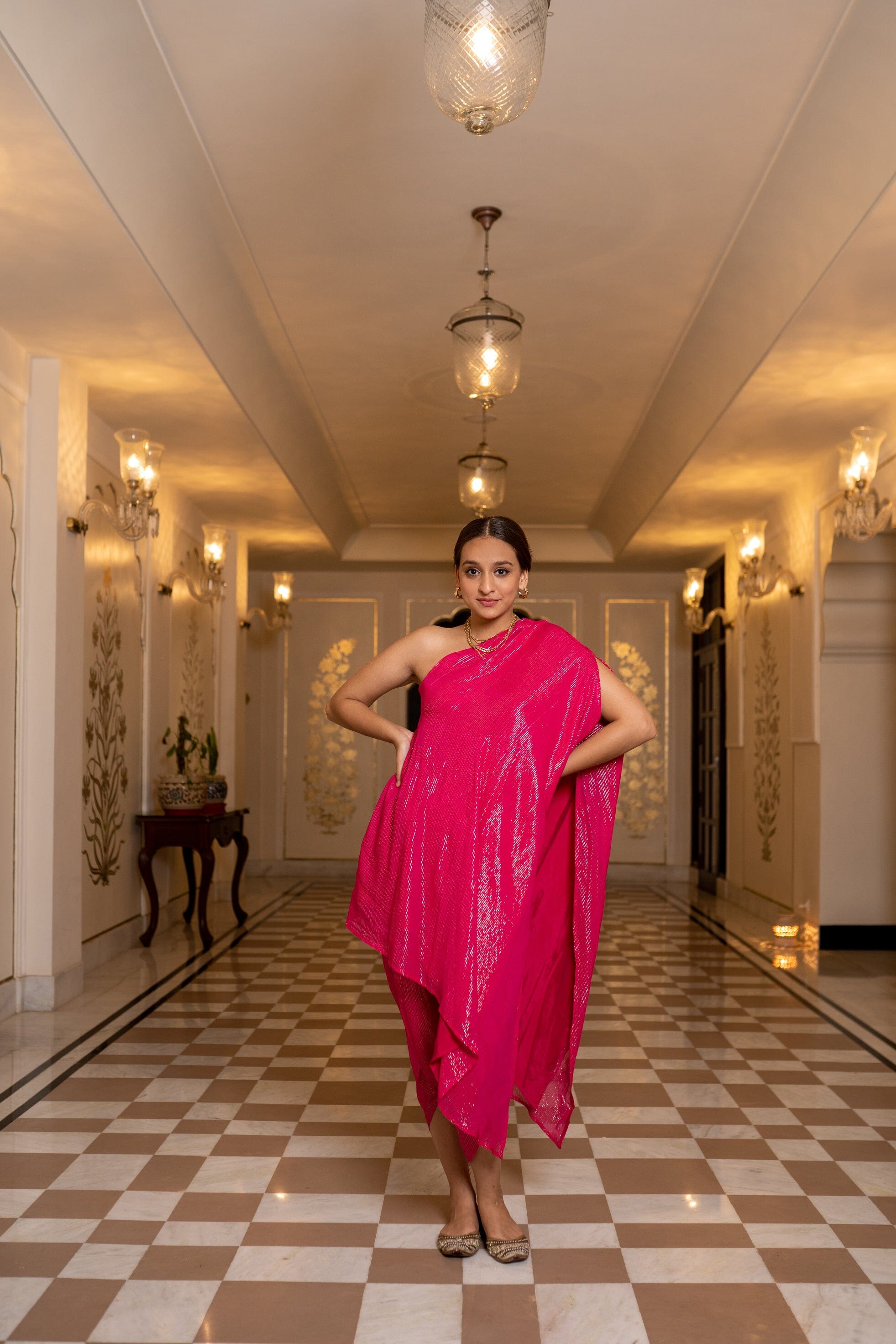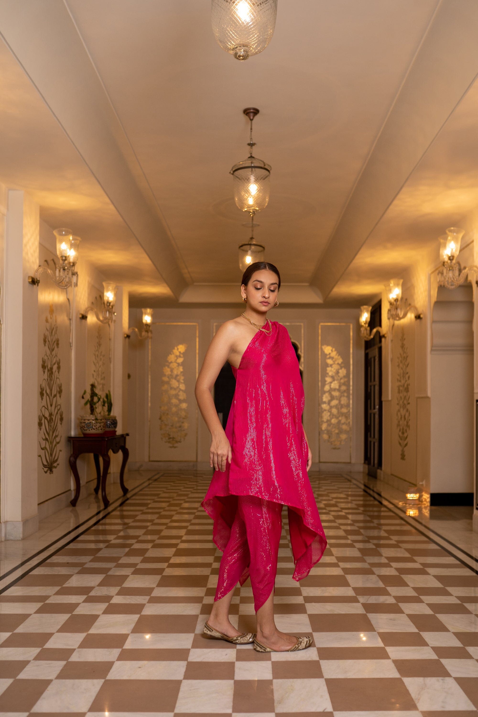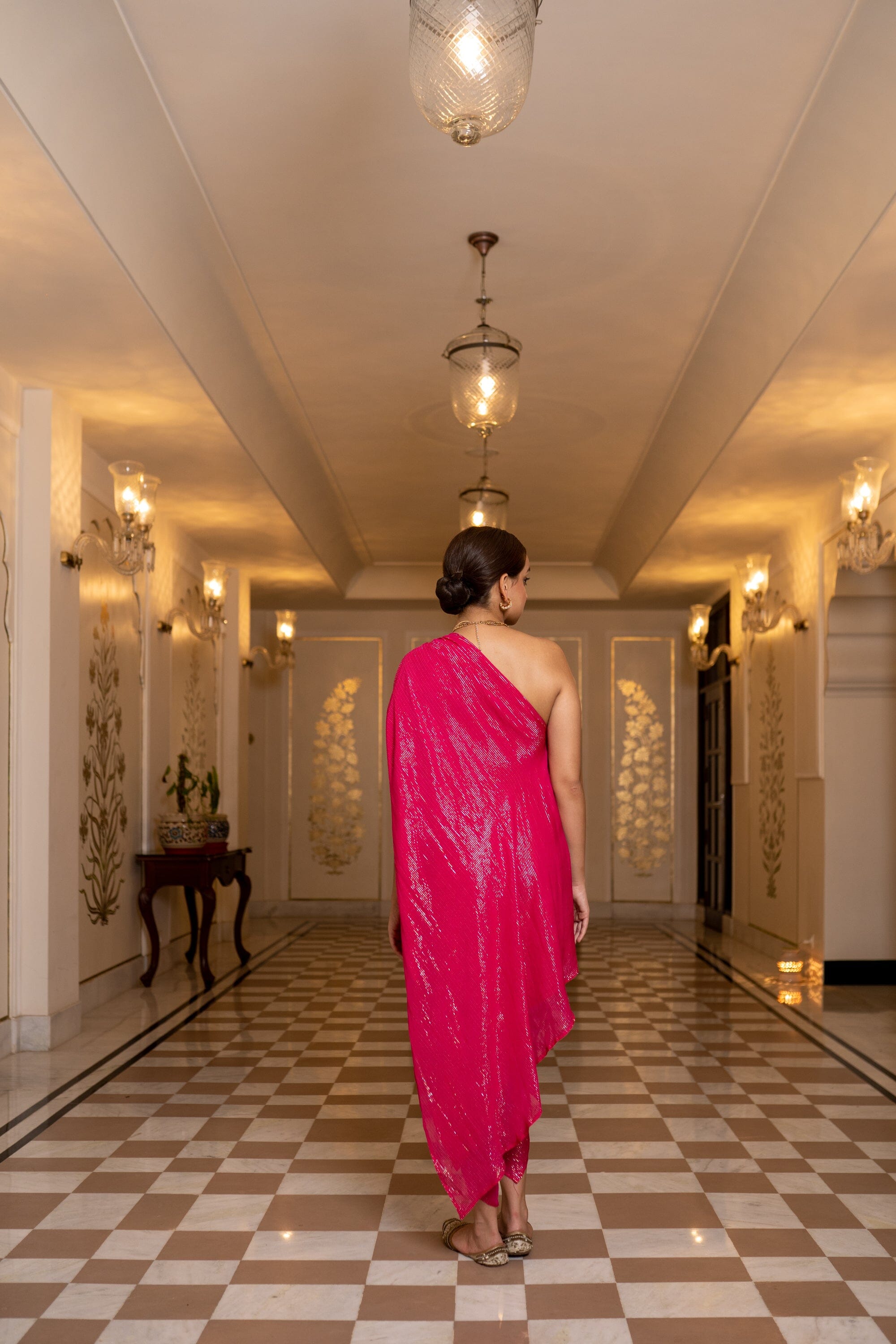 One Shoulder Asymmetrical Kaftan, Easy Fit Pants. Featuring a one-shoulder Fuschia draped kaftan in a lurex georgette blend base. It is paired with matching pants.