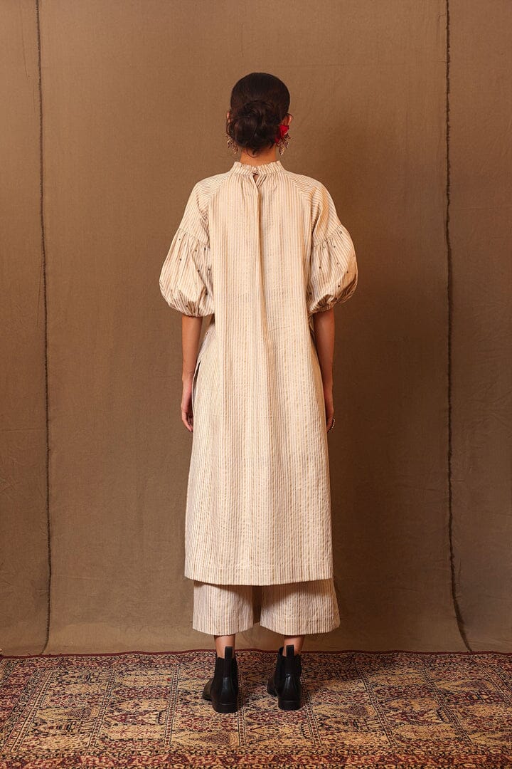 Aari work and sequence hand embroidered club motif on high neck raglan tunic with balloon sleeves. Metallic striped print all over the handspun cotton fabric lending it the festive look. Team it up with the matching stripe pants from the collection to complete the look. Re pants with fully elasticated waist made in metallic stripe print on handspun cotton with side pockets Team it with the big club tunic to complete the look. Aari work and sequence hand embroidered club motif on high neck raglan tunic with balloon sleeves. Metallic striped print all over the handspun cotton fabric lending it the festive look. Comes with the matching stripe pants from the collection to complete the look.Total 2 pcs.