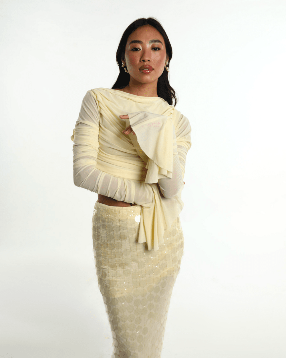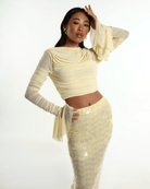 The ONDINA set pairs a softly ruched mesh crop top with draped bell sleeves and a figure-skimming sequin skirt that catches the light with every step. Done in a buttery pastel yellow, the look radiates warmth and sophistication, perfect for sunset celebrations, summer weddings, or your standout festive moment.