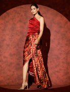 A bold statement in florals, this one-shoulder gown is crafted in luxurious georgette satin with a butter crepe lining. The fluid drape, contrasting piping, and a daring front slit create an elegant yet modern silhouette. Perfect for evening soirées, it’s a piece that embodies effortless glamour with just the right touch of drama.