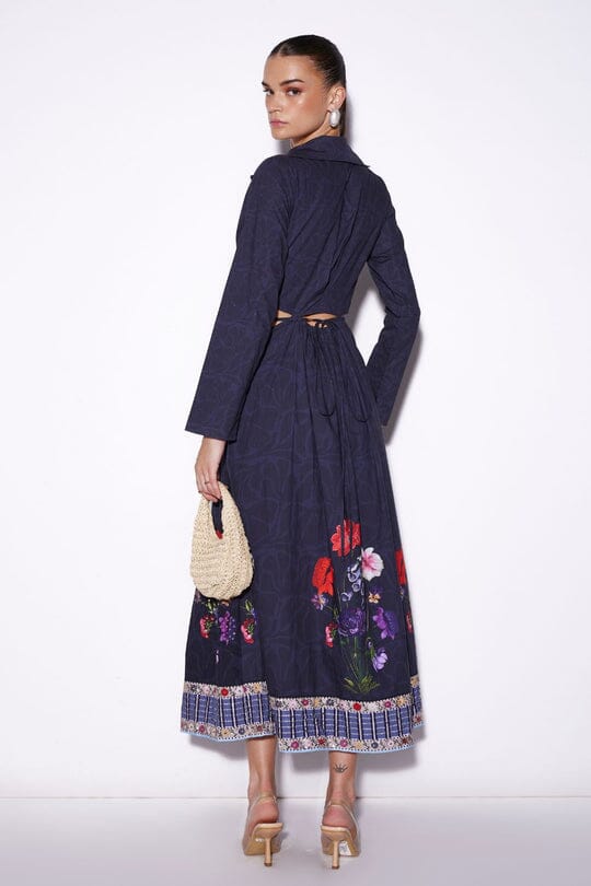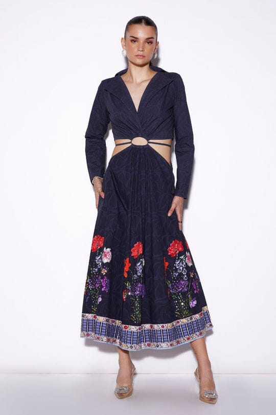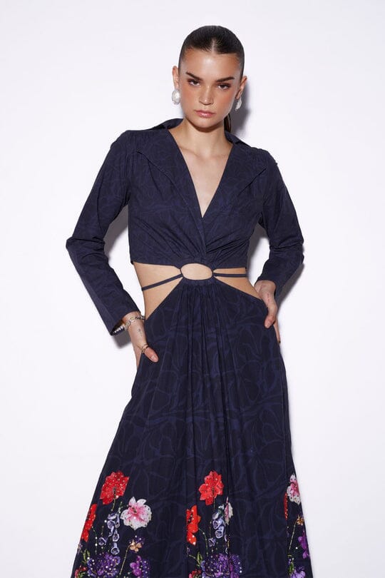The perfect statement piece. Graceful and chic, this piece features intricate cutouts and delicate sequins detailing on a vibrant floral print. Elevate your outfit with this one-of-a-kind dress.