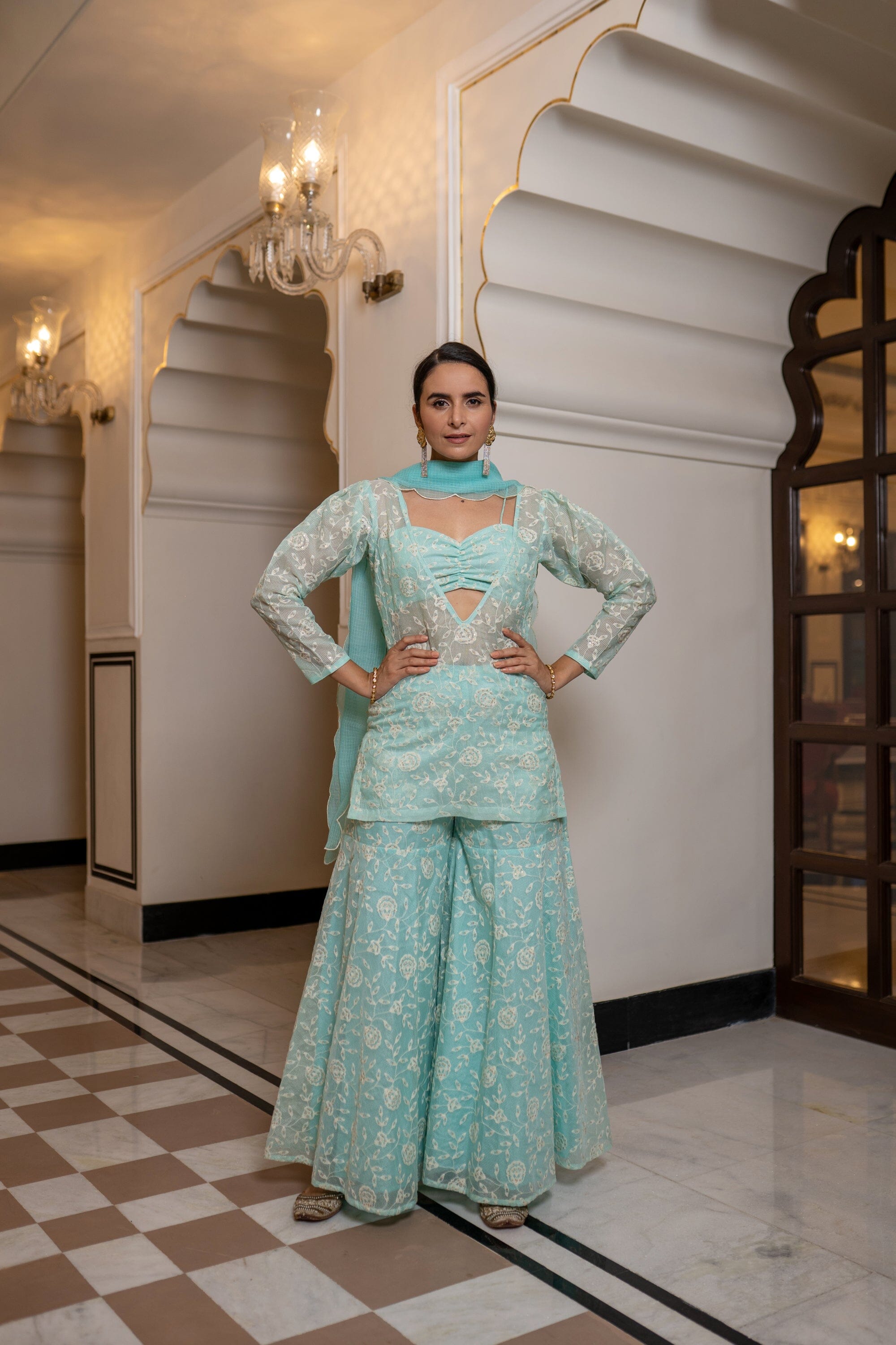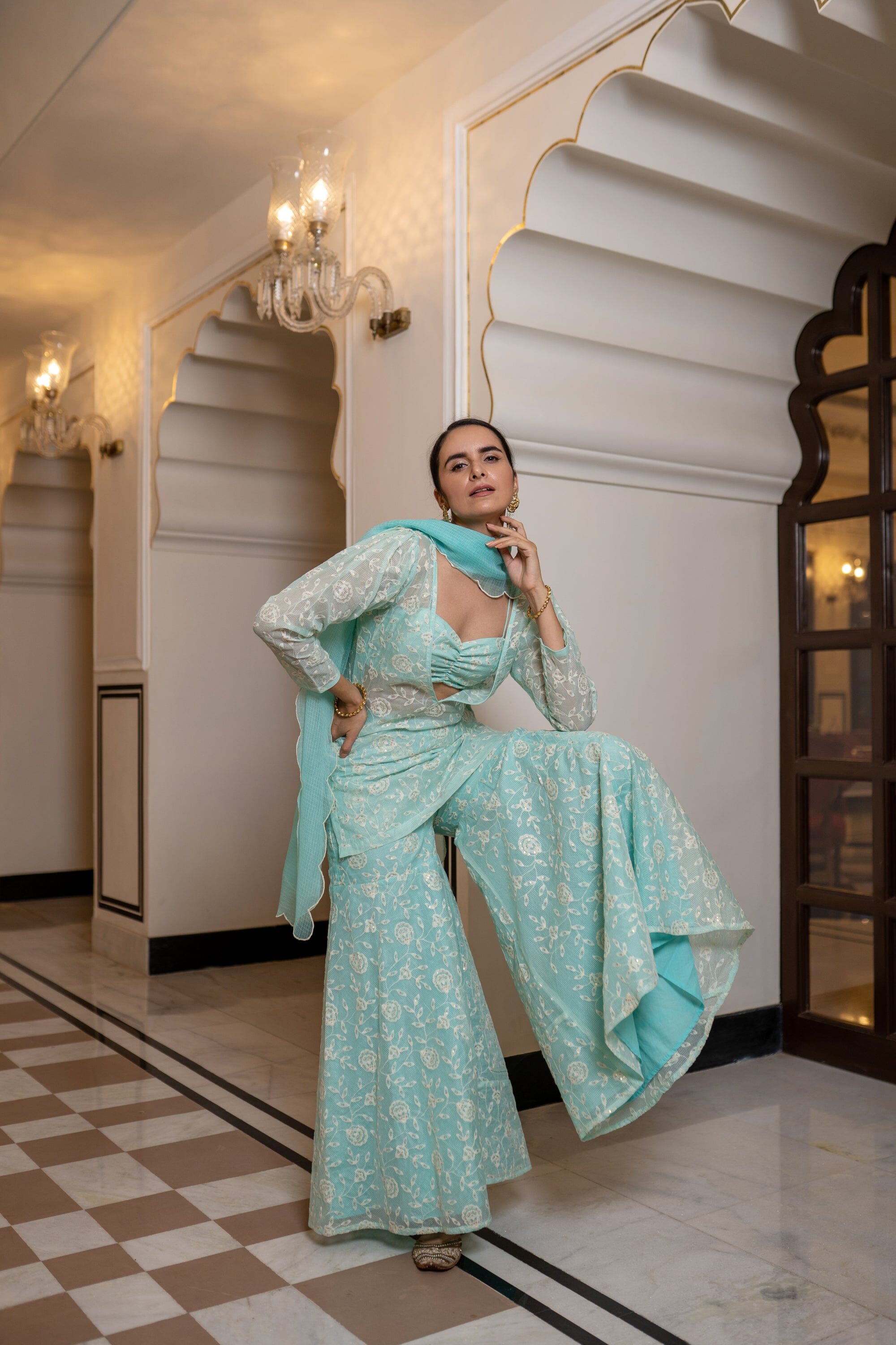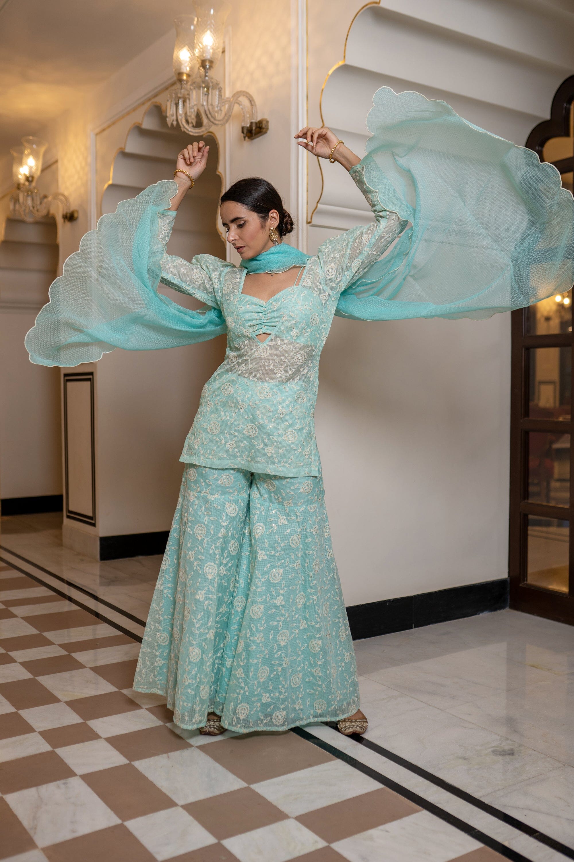 Thin Strap Bustier, Deep V Neck Straight Fit Cover Up, Full Sleeve, Fit And Flared Pants With Cottadoria Scalloped Dupatta. Featuring a sea blue blouse with cottadoria base. It is paired with matching flared sharara pants having thread work and organza embroidered dupatta.