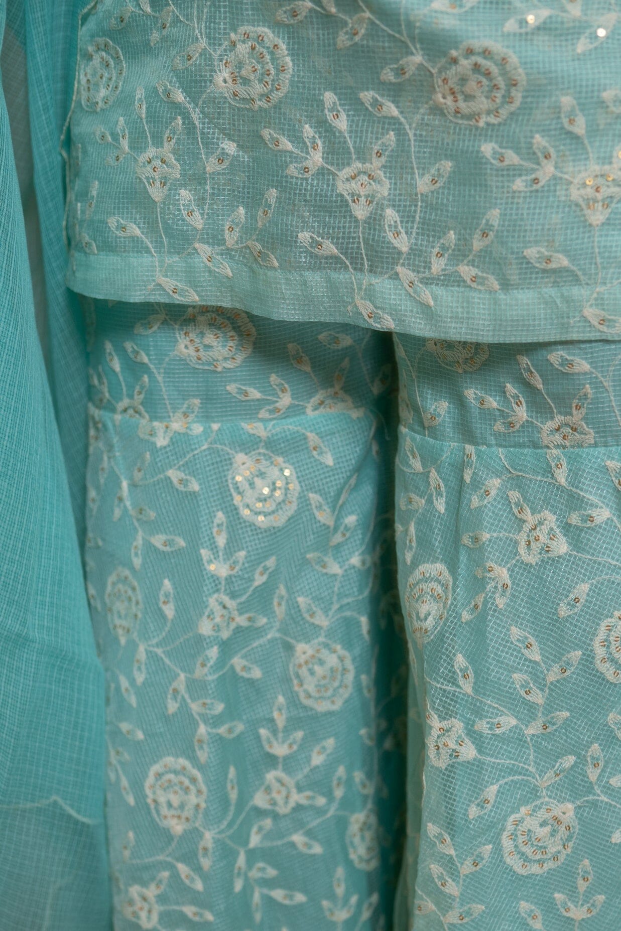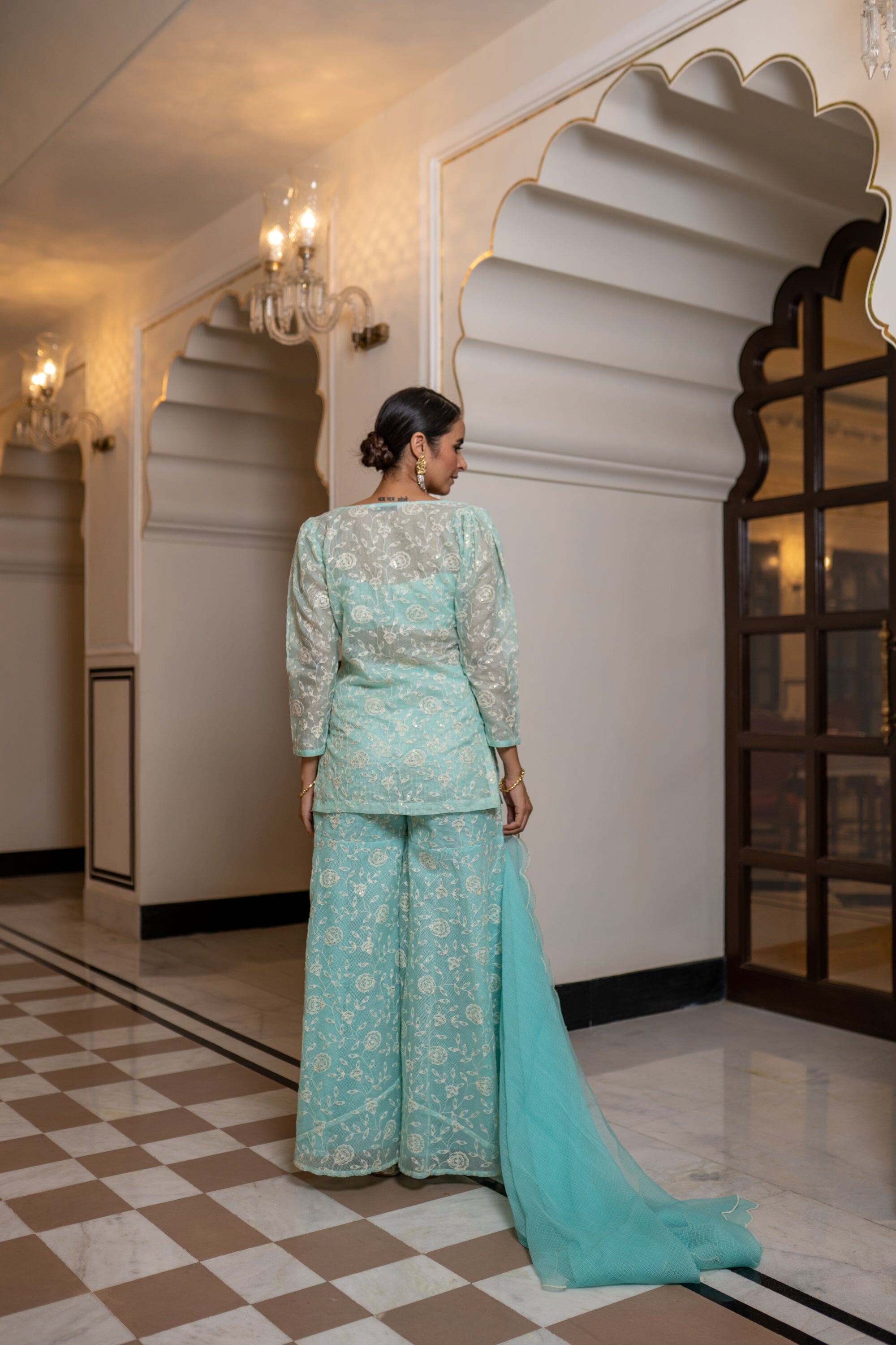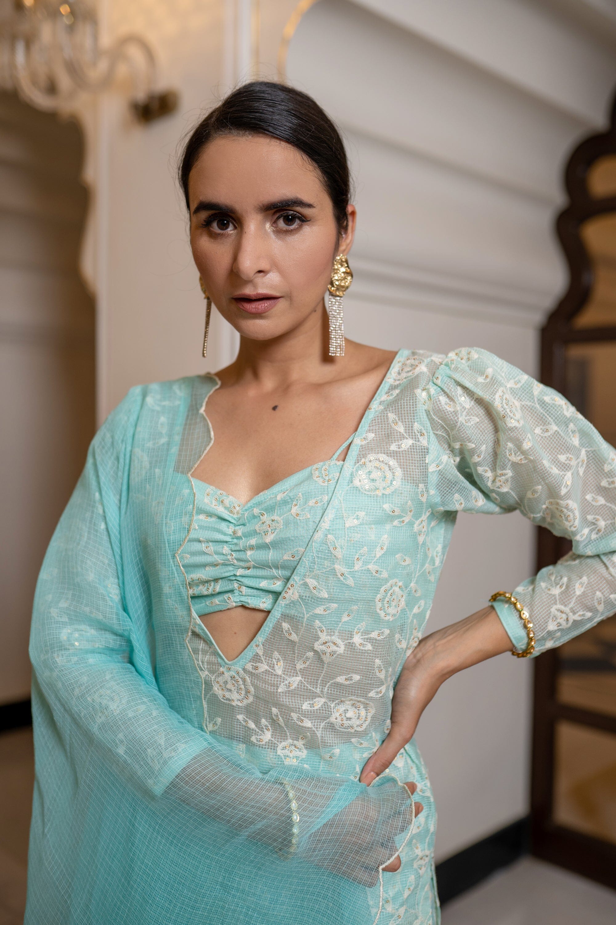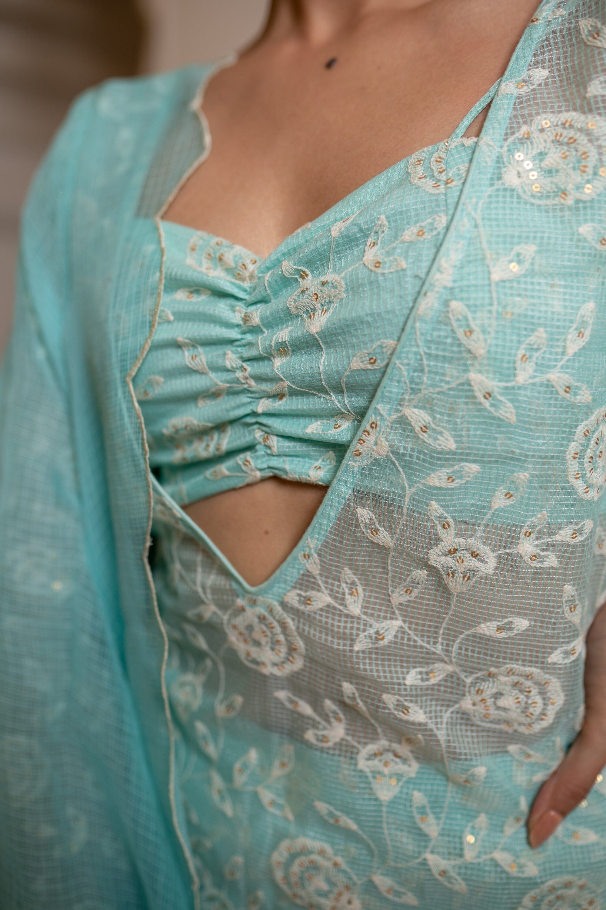 Thin Strap Bustier, Deep V Neck Straight Fit Cover Up, Full Sleeve, Fit And Flared Pants With Cottadoria Scalloped Dupatta. Featuring a sea blue blouse with cottadoria base. It is paired with matching flared sharara pants having thread work and organza embroidered dupatta.