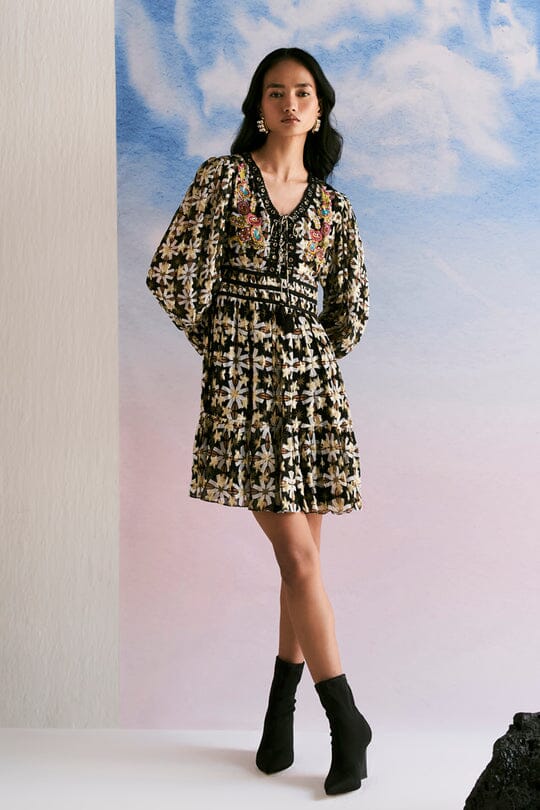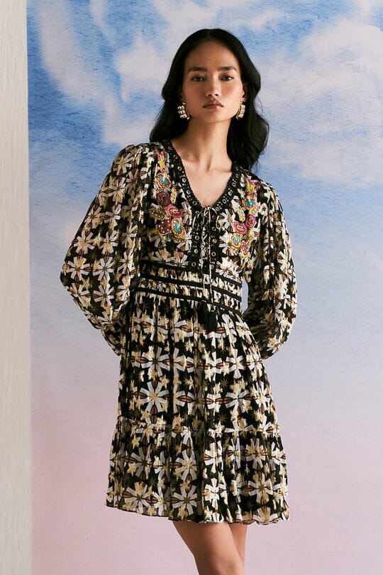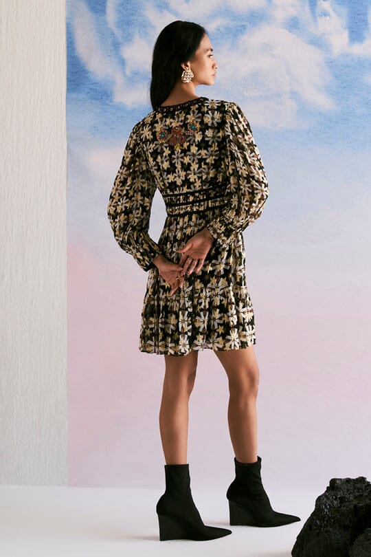Wiasted mini dress with an embroidered beaded yolk in lurex star print.