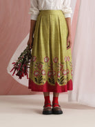A midi box-pleat skirt crafted with elegant structure and adorned with hand-painted floral artwork. The skirt has a fitted waist belt with a side zipper. This whimsical, fall-inspired skirt blends movement, craftsmanship, and feminine charm—perfect for those seeking a unique, artisanal floral midi skirt.
