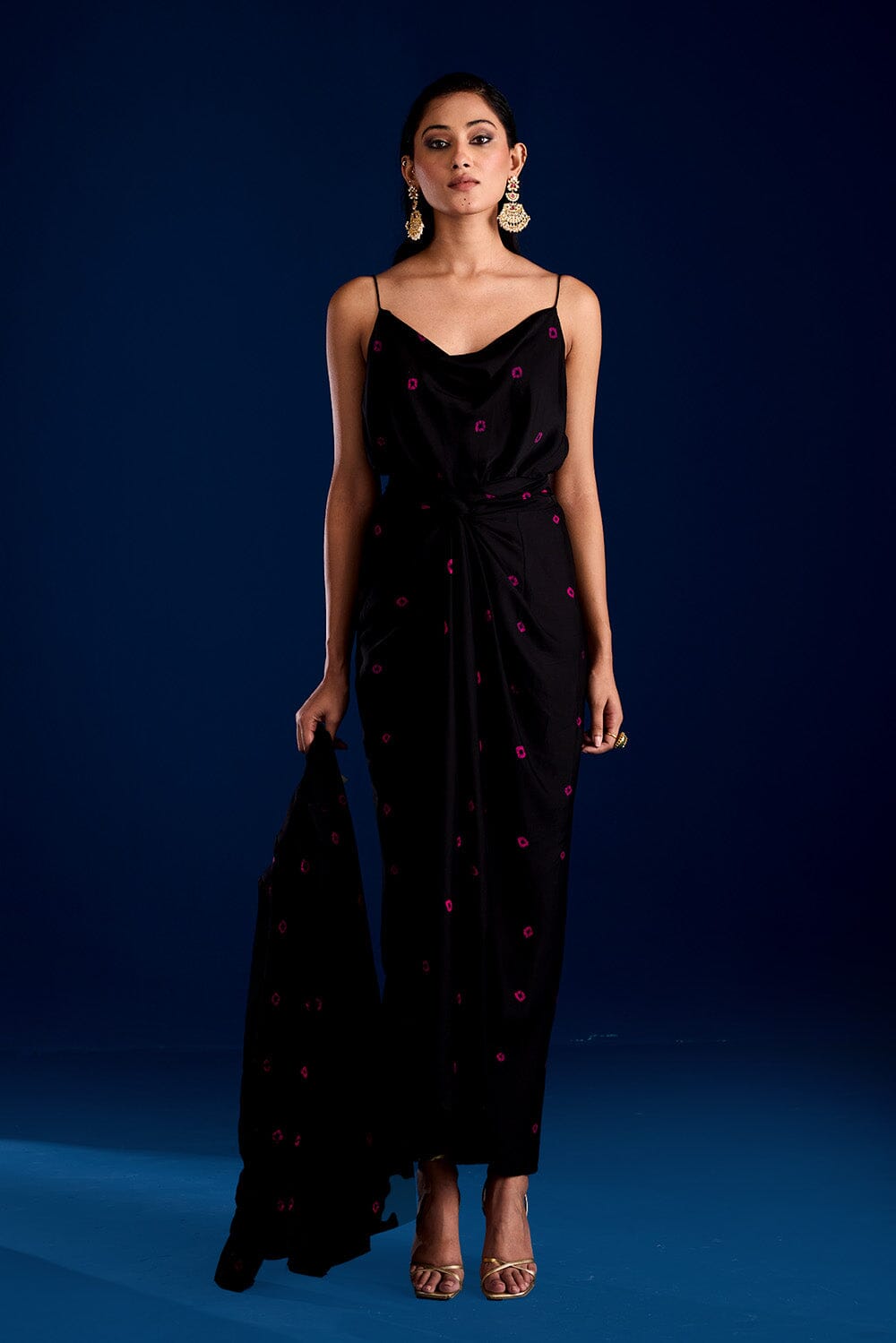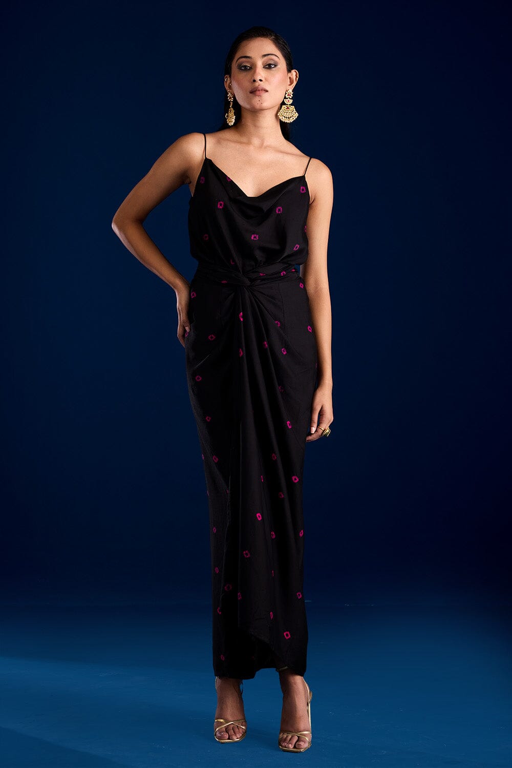 Dress to impress in this amazingly stylish bandhej wrap dress with spaghetti straps.Made in soft modal cotton satin.Tie the waist in a twist to get a flatering drape.Features a hand tie and dyed bandhej.The dress has a cowl neck and an elasticated waist for a better fit.This dress is the perfect outfit for a night out."