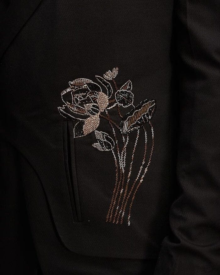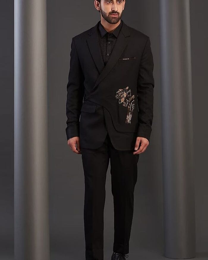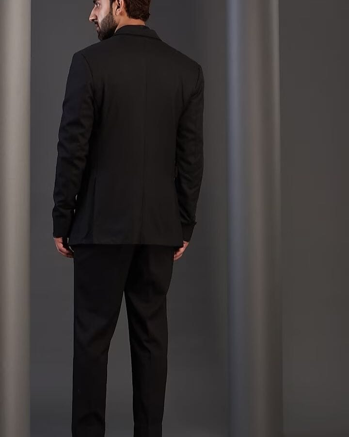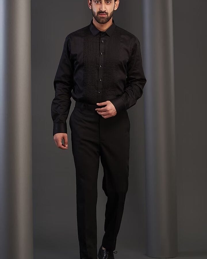Featuring a black tuxedo jacket in imported italian fabric and cotton base with dabka, cutdana, resham, and nalki hand work. It is paired with a matching pintucks shirt and pants.