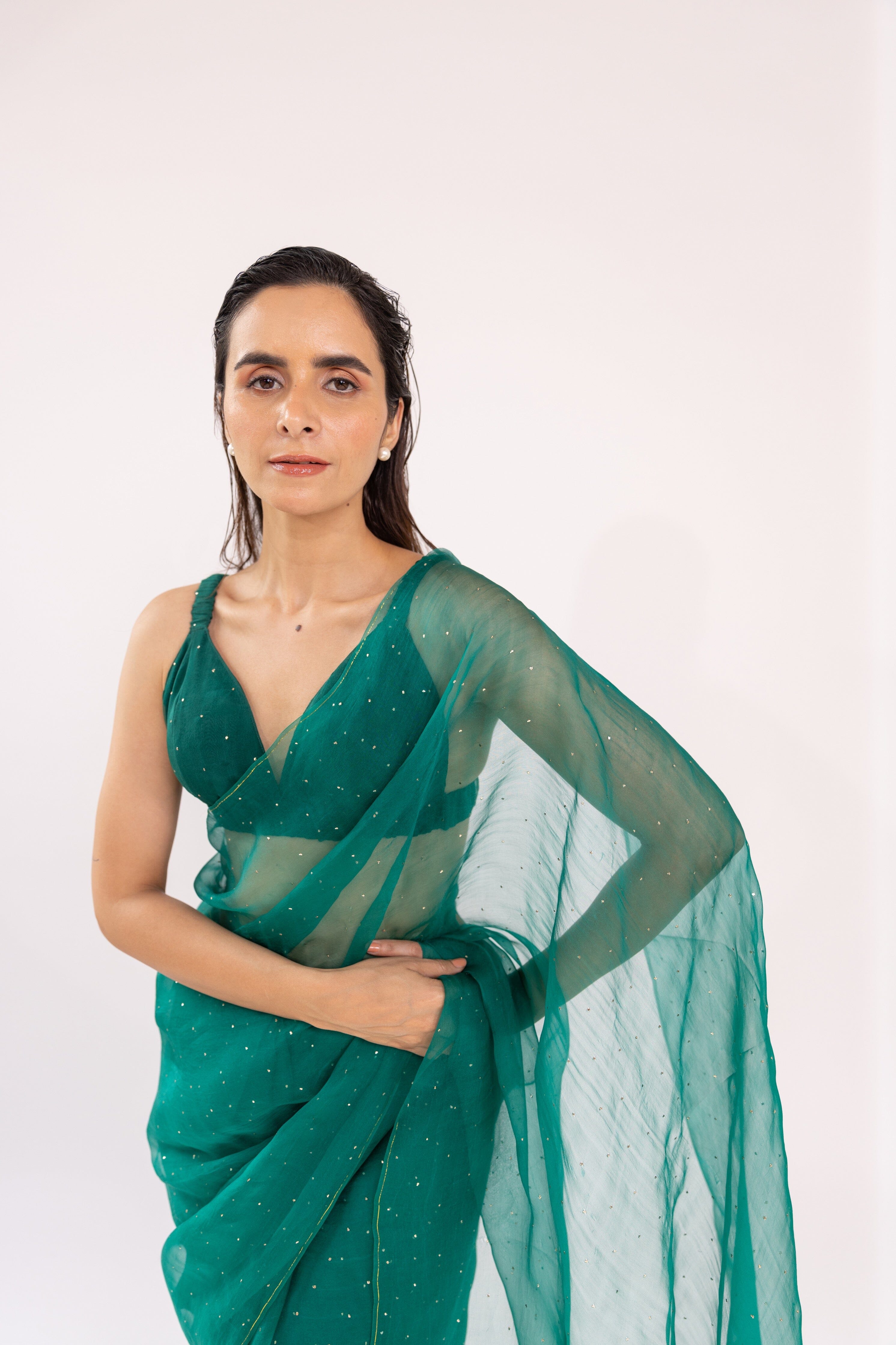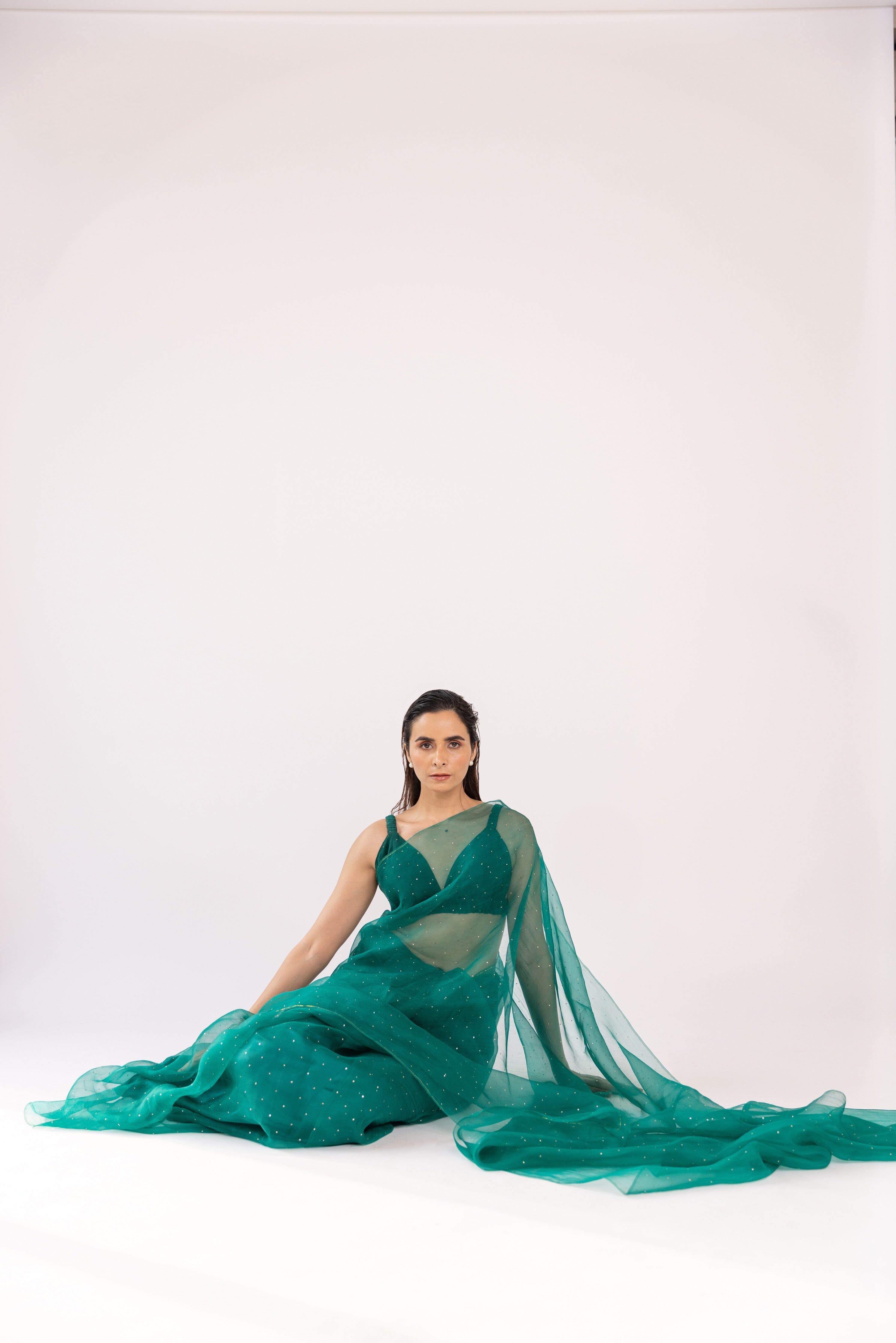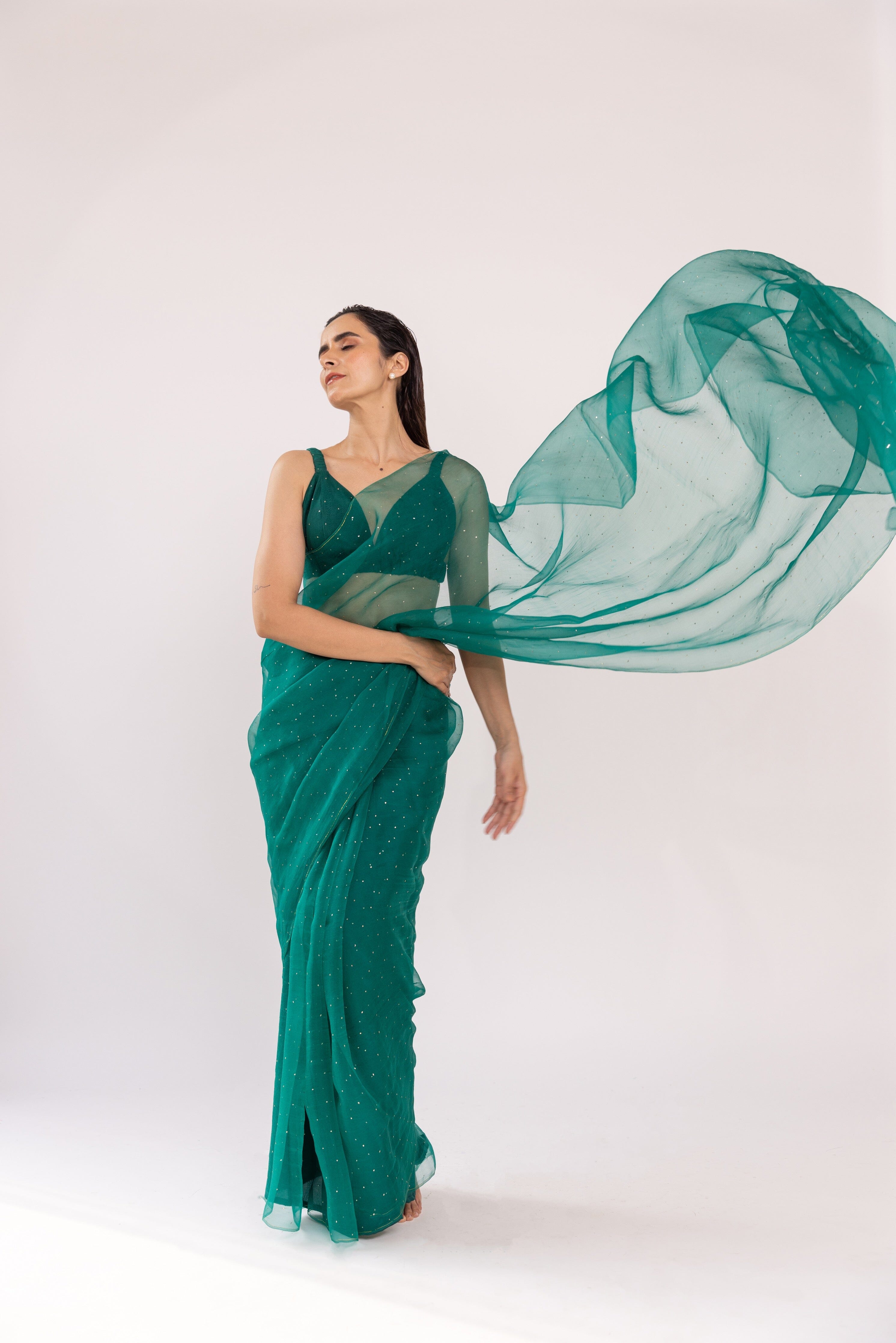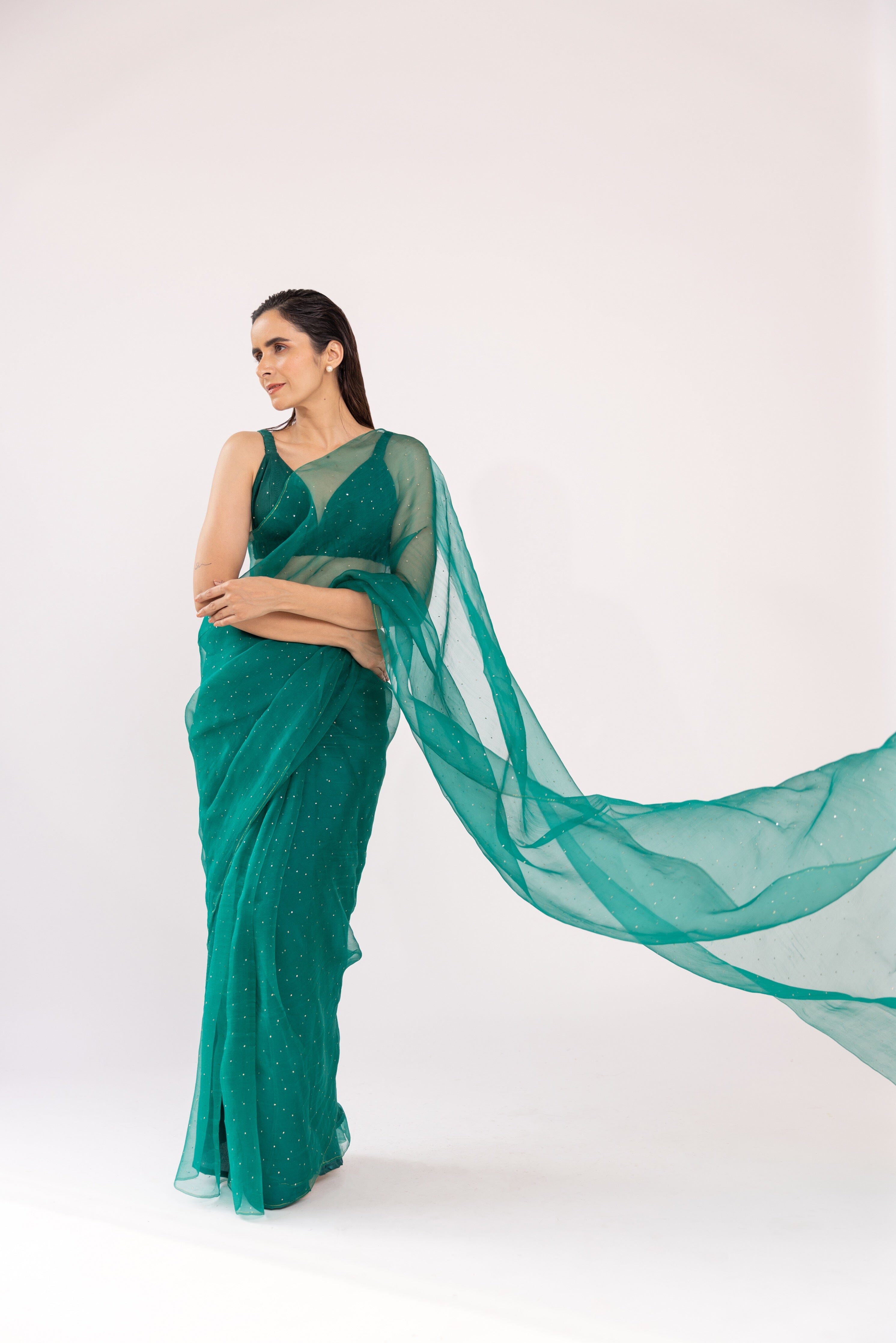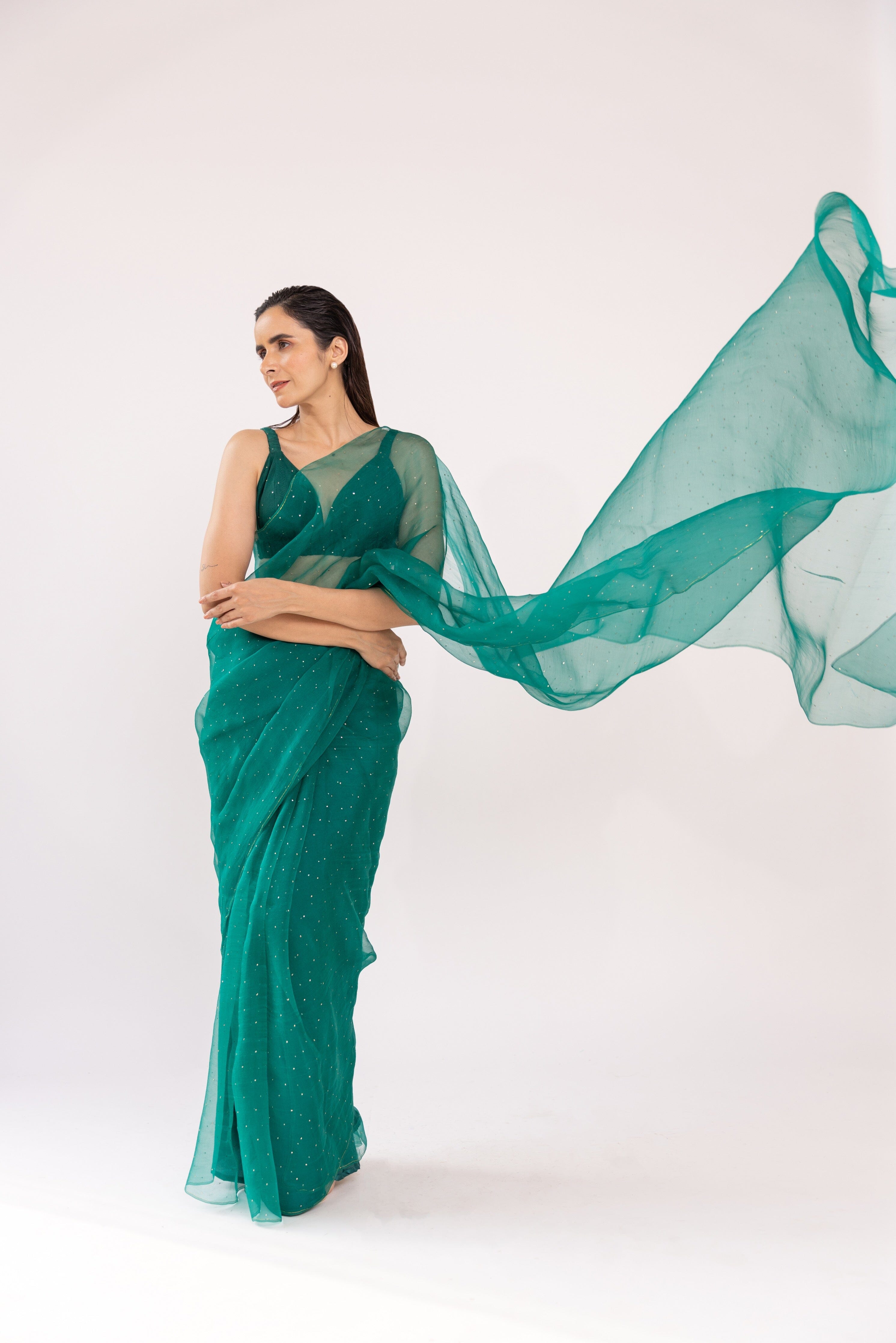 Featuring a opal green pre-stitched saree in silk organza base. It is paired with a plunging v neckline blouse.