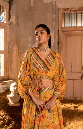A marigold yellow crop top set with embroidered neckline, drawstring waist, and matching skirt. A embroidered crop top with skirt.