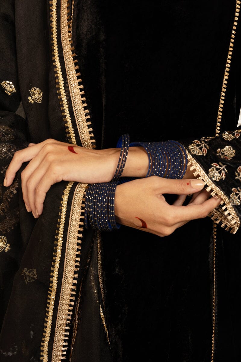 Make a bold statement with the Tara Black A-Line Short Velvet Kurta Set. This chic A-line kurta is crafted from rich velvet and features exquisite embroidery, showcasing dazzling dabka, zari, sequins, and gota that elevate its allure. Paired with a salwar and a flowing pure silk organza dupatta, this set offers a perfect balance of comfort and sophistication.