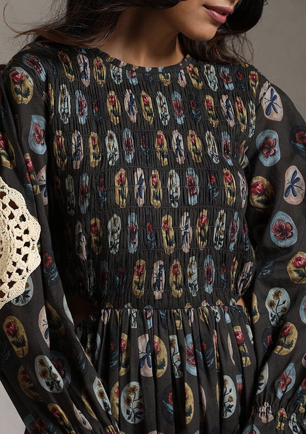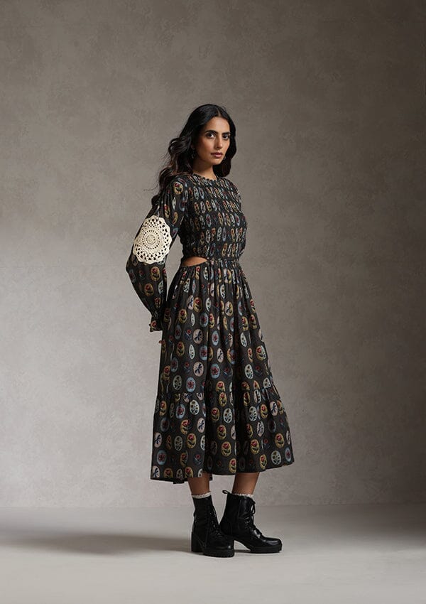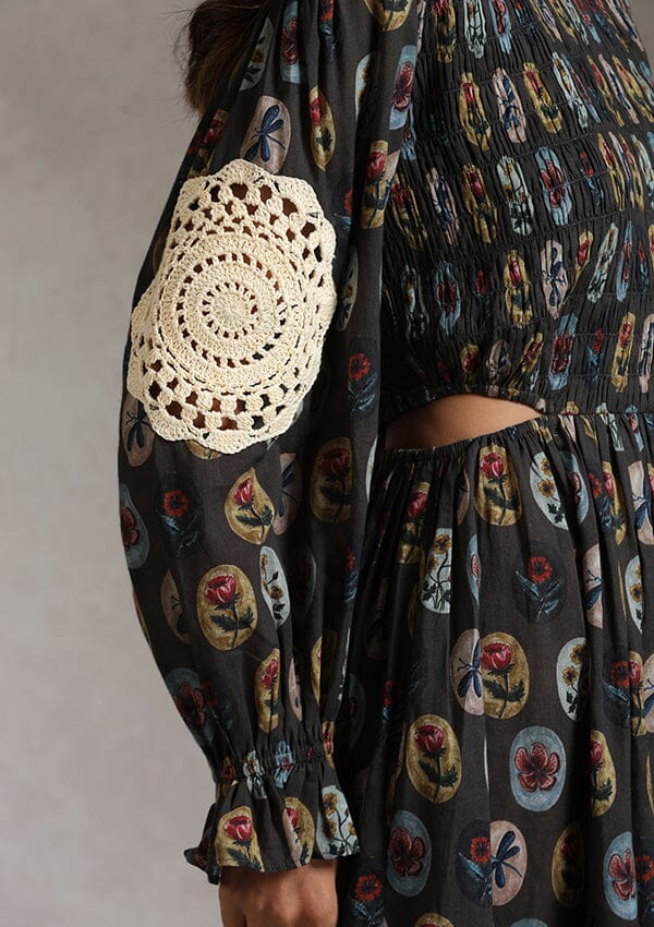 A midi dress in a relaxed style featuring elastic smocking on the bodice. The cut-outs on the sides accentuate the waist and the elastic gives a perfect fit! The tiny gathered detail around the neck and hand crochet patches on the sleeves are not to be missed.