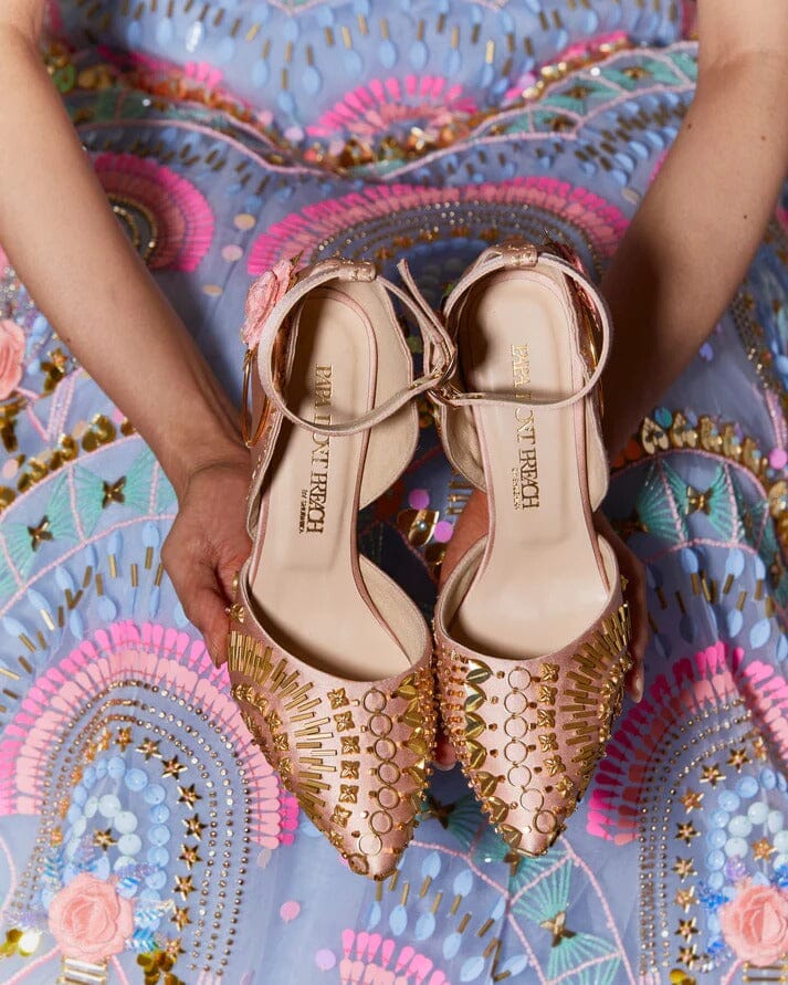 Gold satin D'Orsay stilettos with metallic handwork, delicate rose nose-pin broach detail with pearl and gold chains beetling around the back