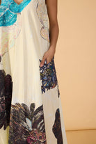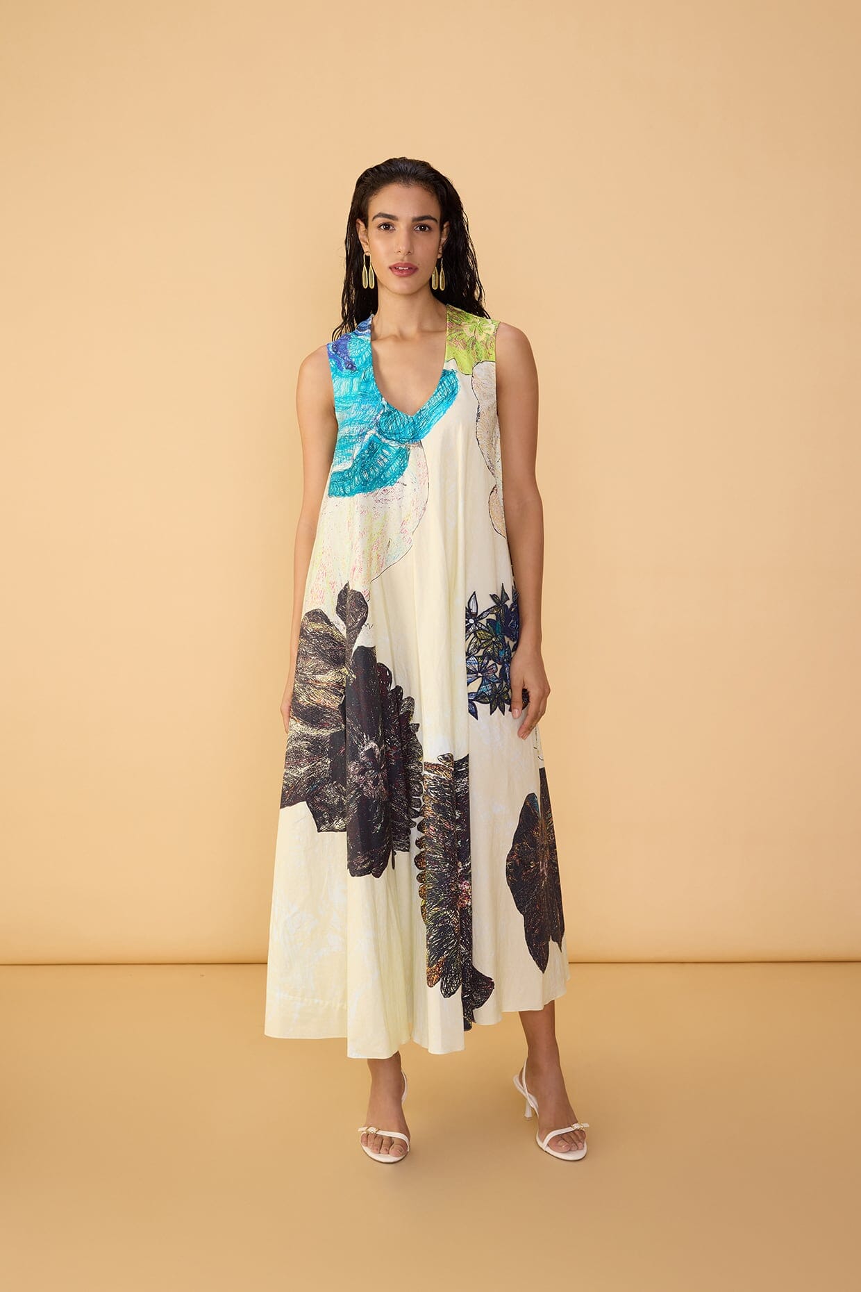 Abstract Print Sleeveless Relaxed Fit Dress With Intricate Hand Embroidered Floral Cutwork Applique Pocket Detailing