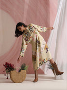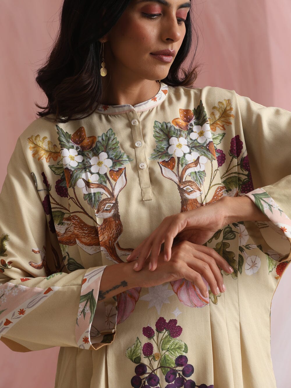 An easy shirt style dress featuring inverted pleats for a cinched waist. The print features hand-painted enchanted motifs crafted on soft modal fabric.