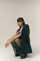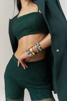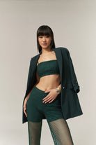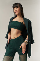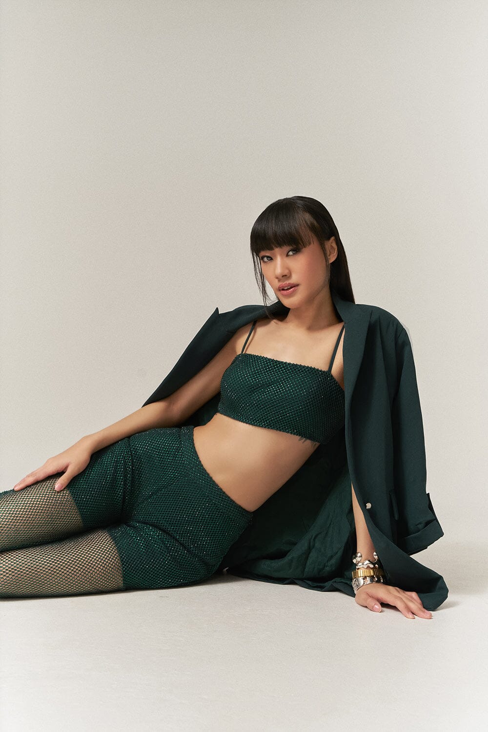 Introducing Vera, a stunning three-piece set crafted from luxurious beaded Swarovski fabric and Armani georgette in a timeless emerald green hue. This versatile ensemble includes a chic bustier, cut-out pants, and a sophisticated blazer that can be worn together or as independent pieces. Perfect for parties, concerts, vacations, or New Years Eve celebrations, this set offers endless styling options. The pant lining can also be made in a bikini style for a playful twist. Elevate your look with this distinguished piece that exudes elegance and style!