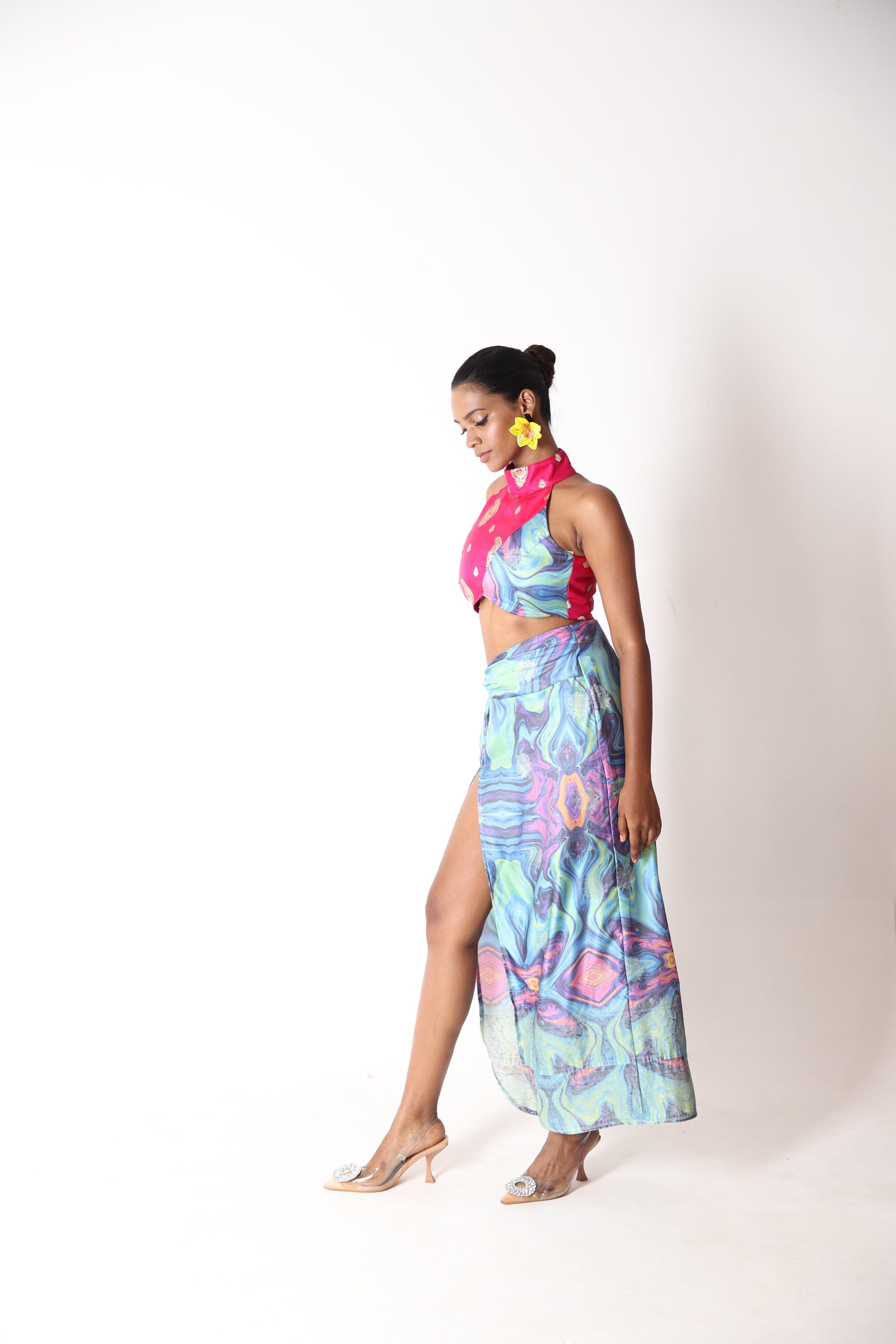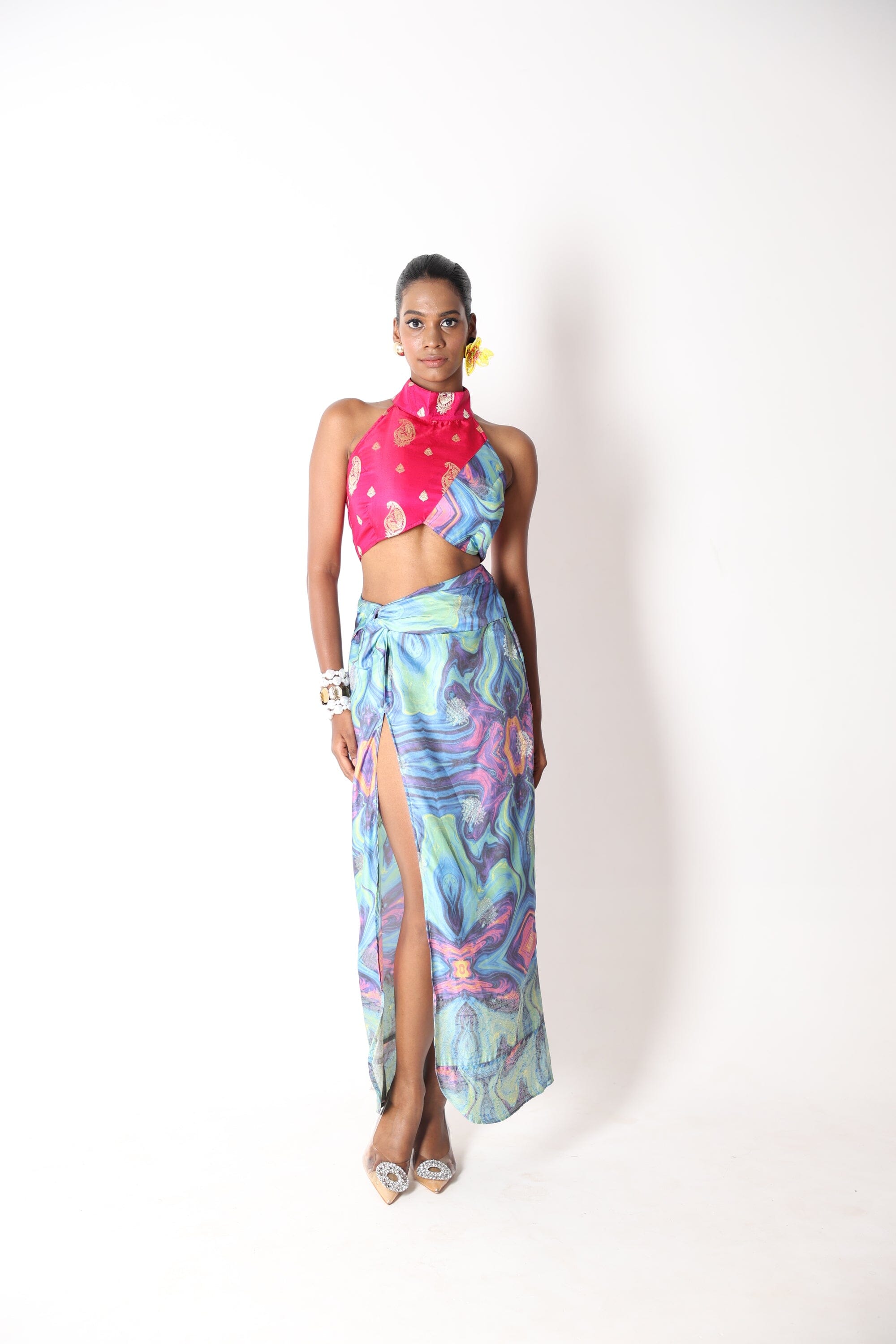 Make a stunning entrance in our Holographic Print Twist Knot Skirt with Thigh High Slit. Crafted from luxurious banarsi silk fabric, this skirt features an eye-catching holographic print and a daring thigh high slit, creating a glamorous and captivating look.