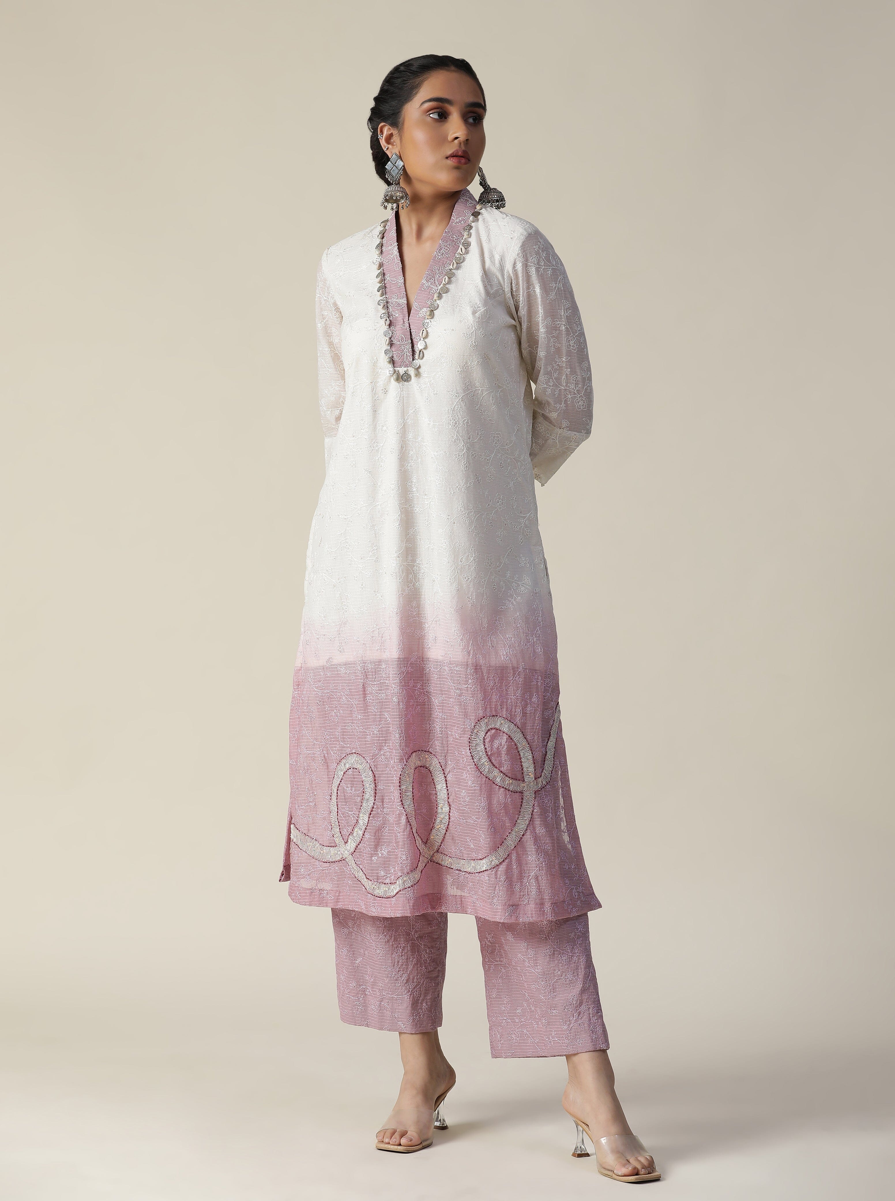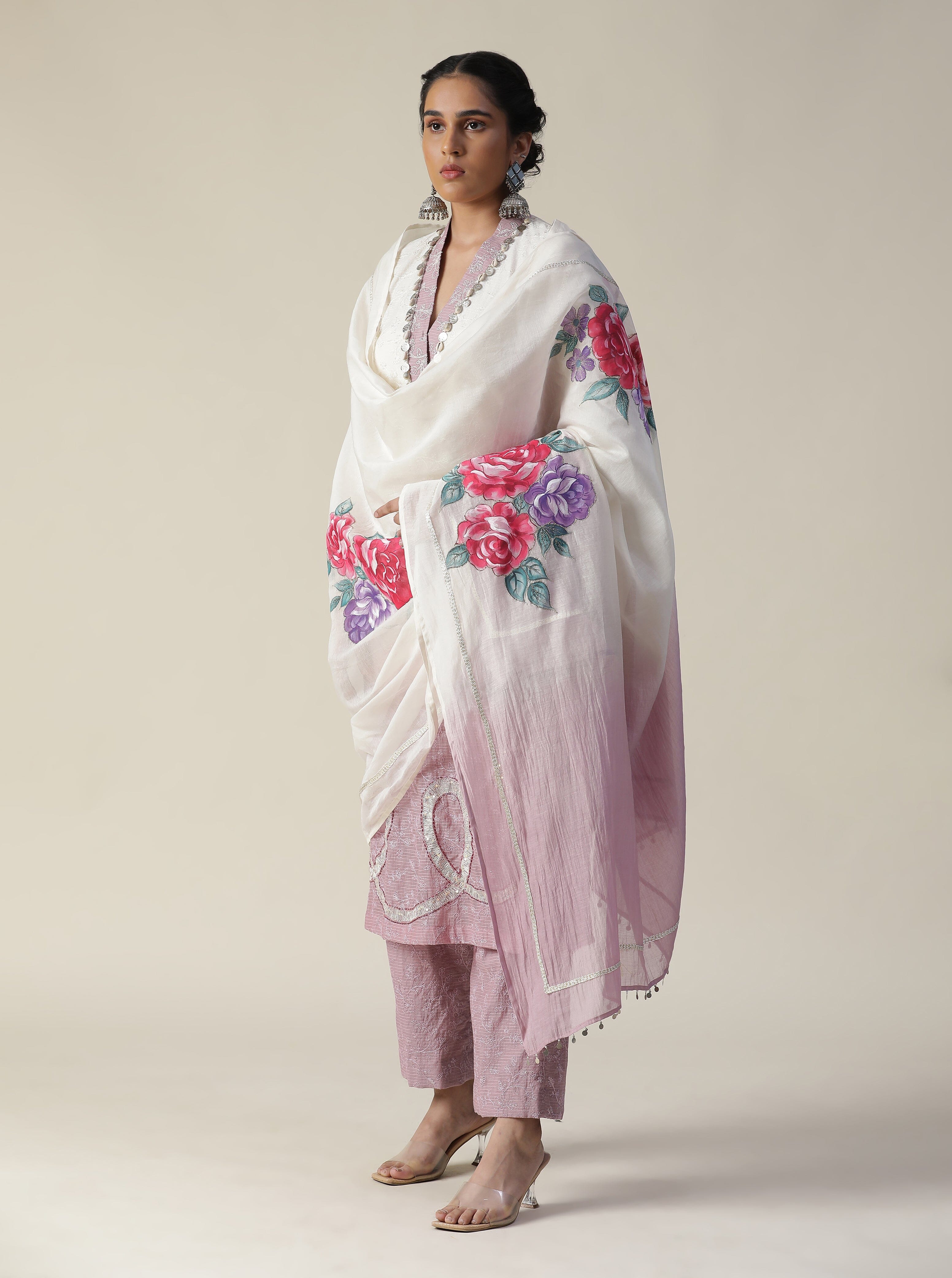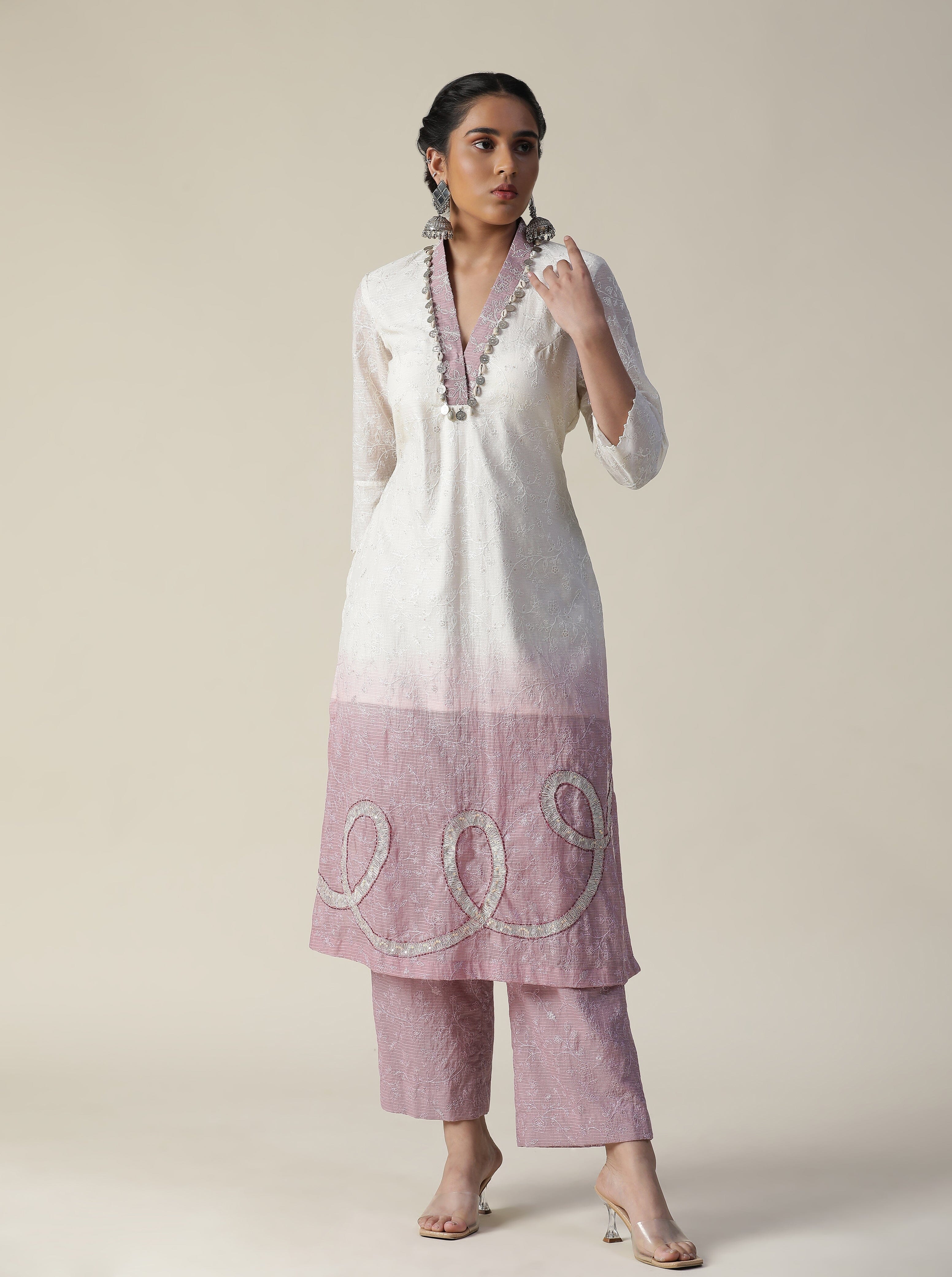 Featuring our white lilac ombre suit set. Comes with an embroidered ombre kurti with shells & silver coins work at neck(V-neck) and straight pant and a hand painted cotton chanderi dupatta.